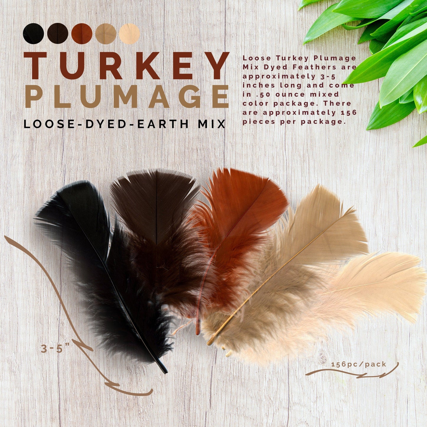 Loose Turkey Plumage Mix Dyed Feathers are approximately 3-5 inches long and come in .50 ounce mixed color package. There are approximately 156 pieces per package.