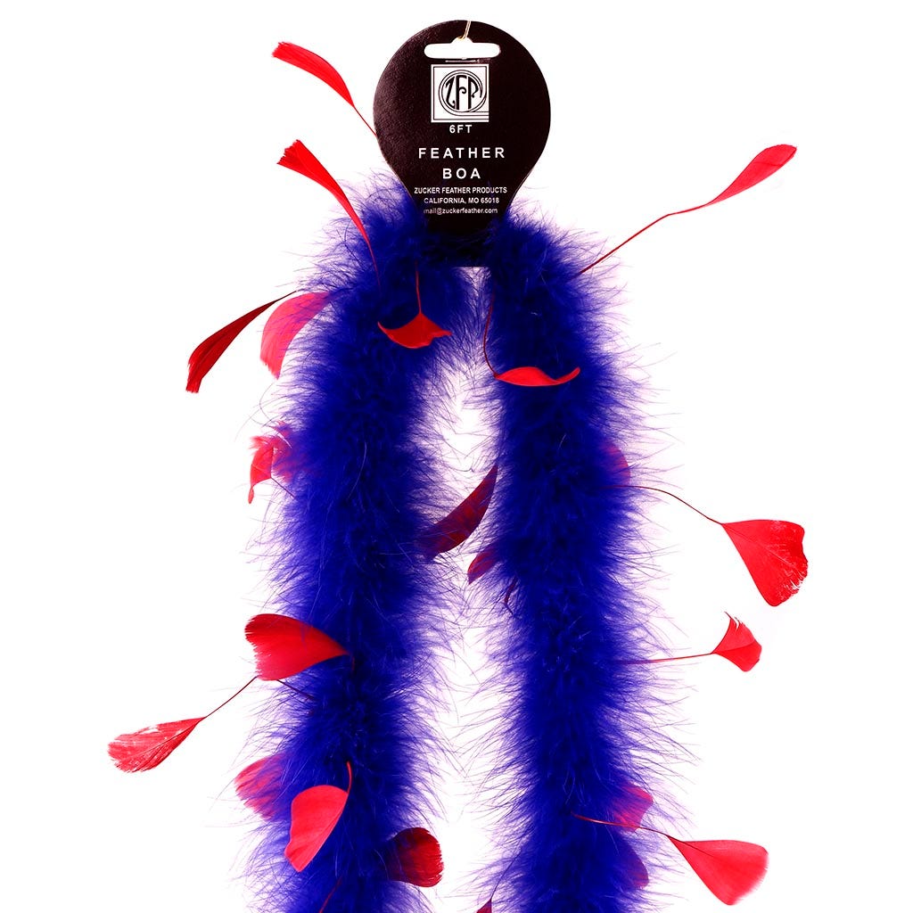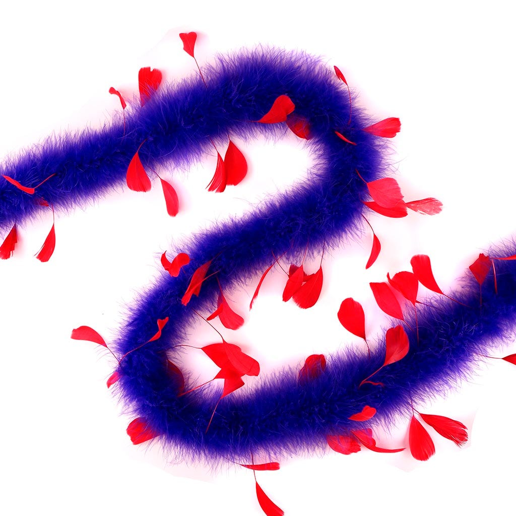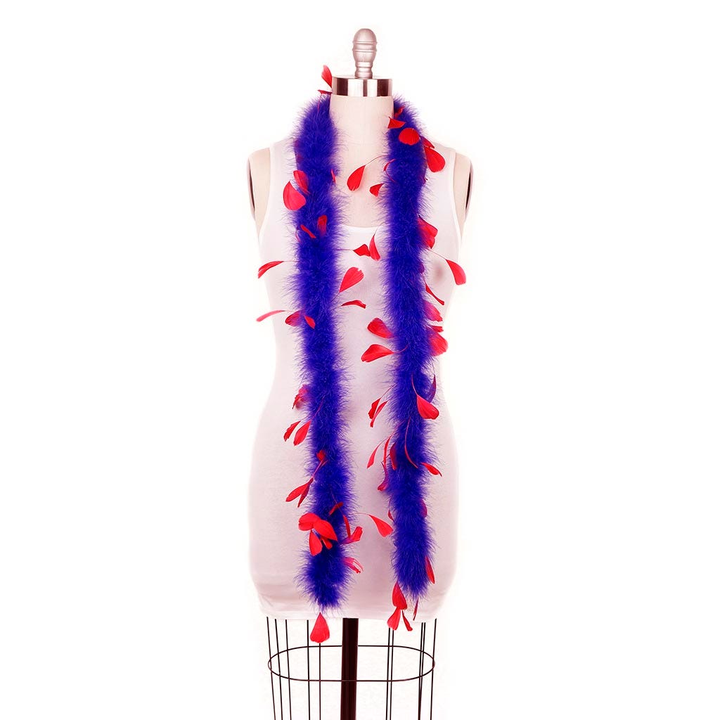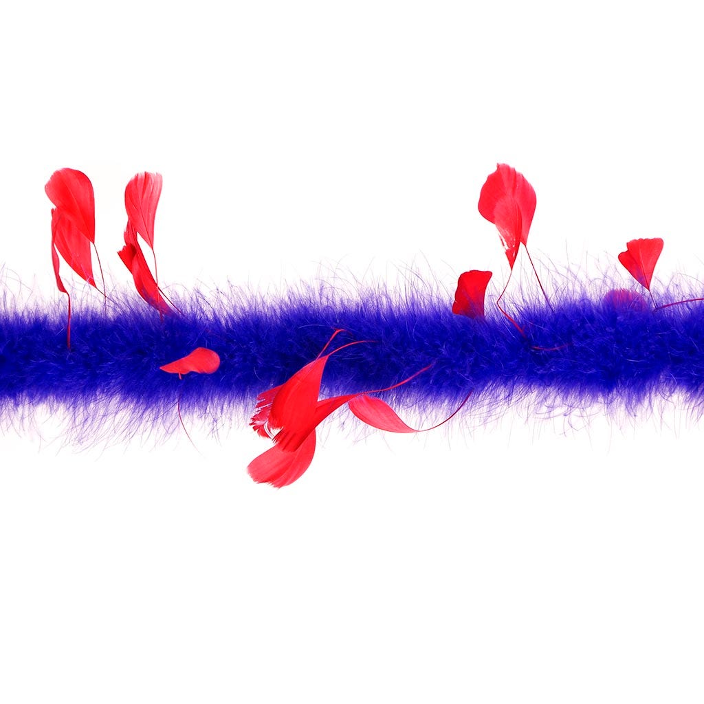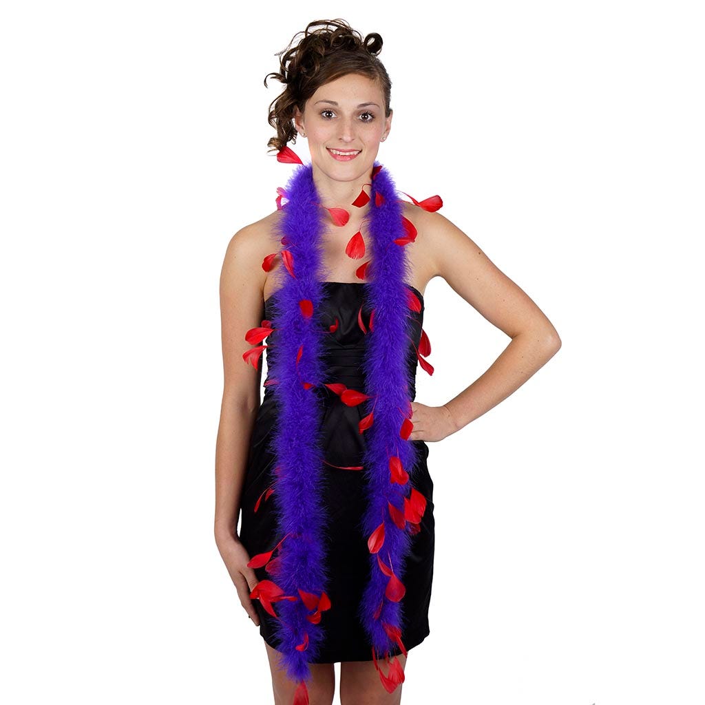 This fluffy purple marabou feather boa is made with red stripped coque feathers spaced throughout the boa, exposing the stem and leaving the rounded tip, giving a whimsical appearance. Medium Weight Marabou Feather Boas with Stripped Coque are 2 yards (6 ft) long, and approx 2.5" in diameter.