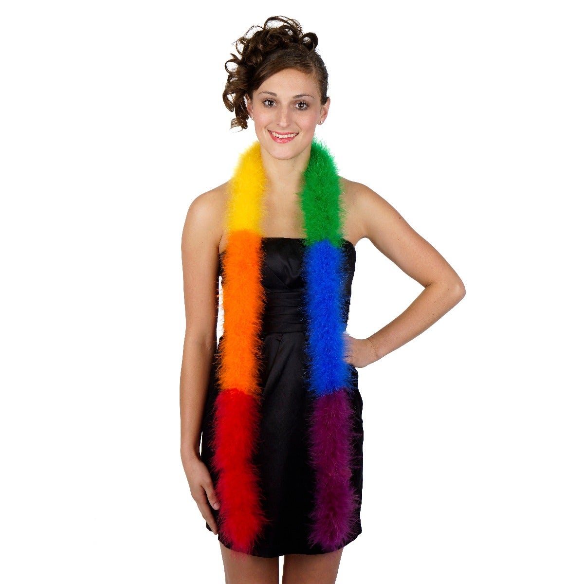 This rainbow feather boa with sectional colors is 2 yards (6ft) long and approx 2.5" in diameter. Our marabou boa, as our other Zucker feather boas, can be cut without unraveling as feathers are sewn on to a cotton cord.