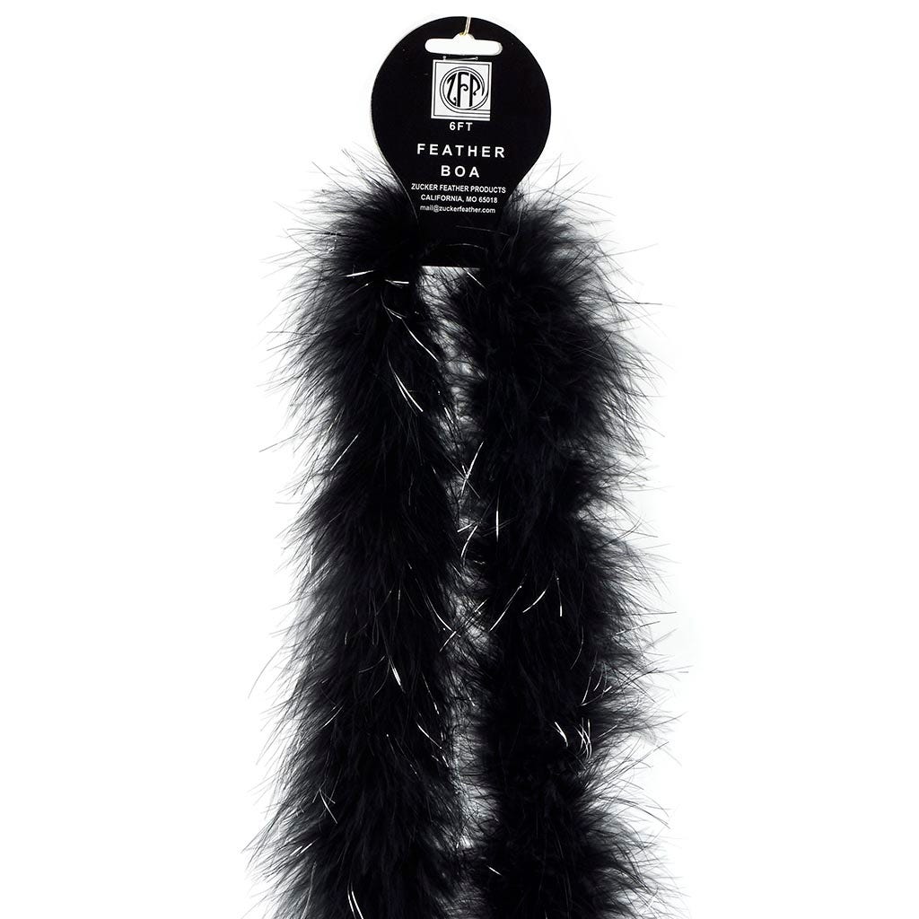 This black feather boa is made with silver lurex adding shimmer and a touch of sparkle. Our fluffy marabou feather boa measures 2 yards (6 ft) long, and approx 2.5" in diameter.