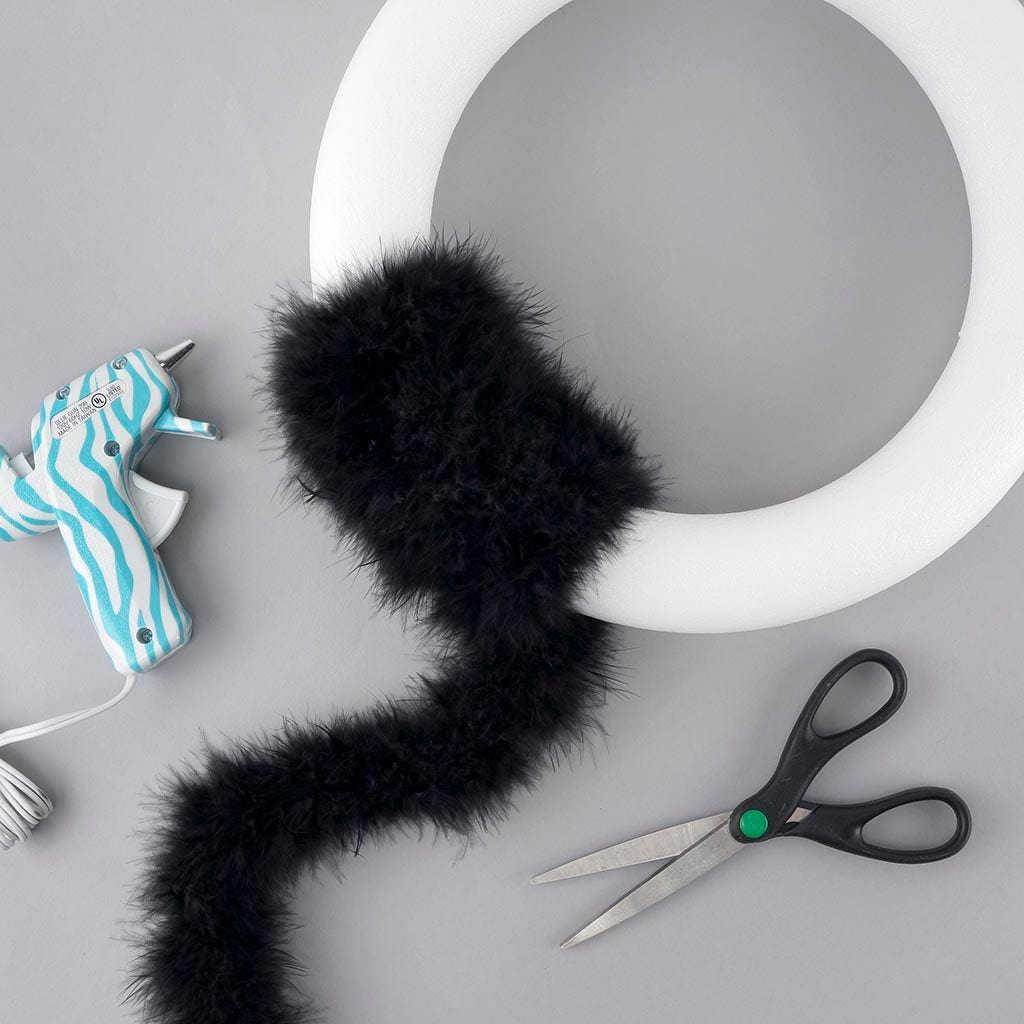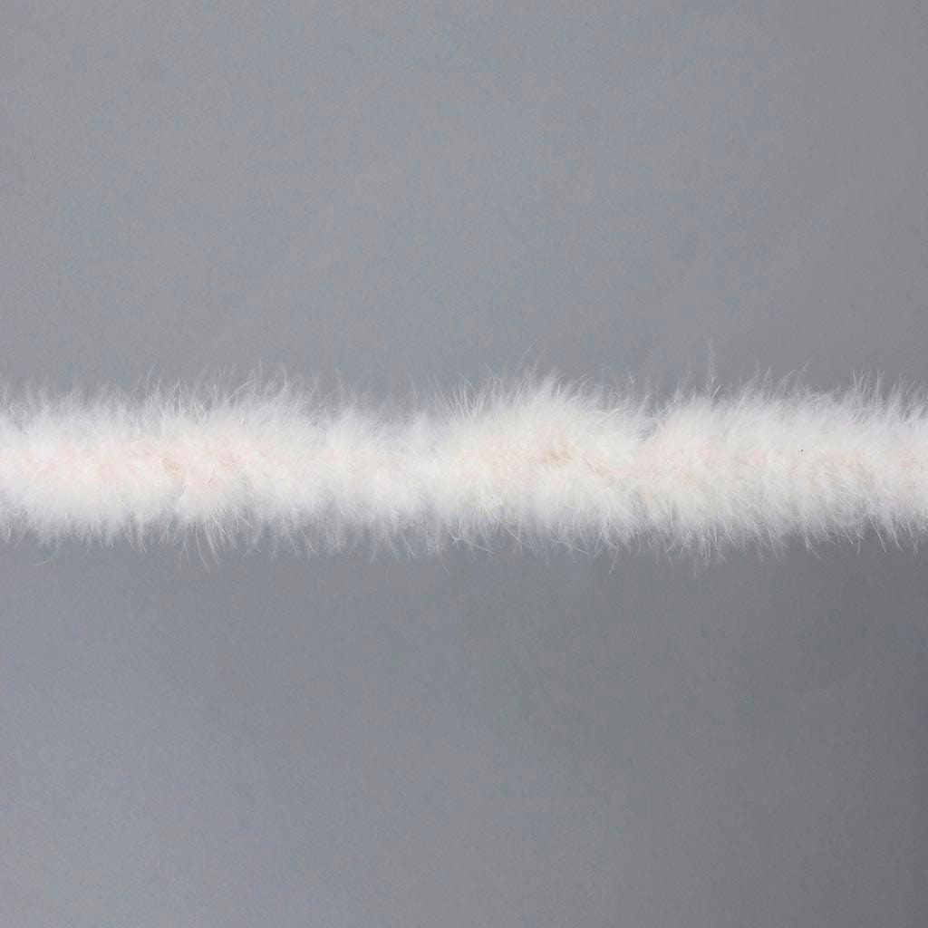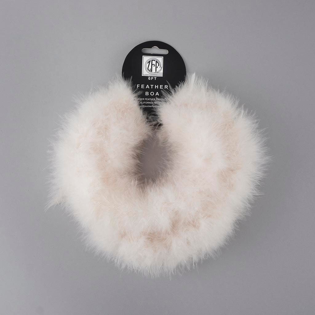 This ivory feather boa is 2 yards (6 feet) long and approx 1.5 inch in diameter. This type of thin feather boa is often referred to as a craft boa or feather boa trim because its small diameter makes it easy to cut and glue without unraveling as feathers are sewn onto a cotton cord.