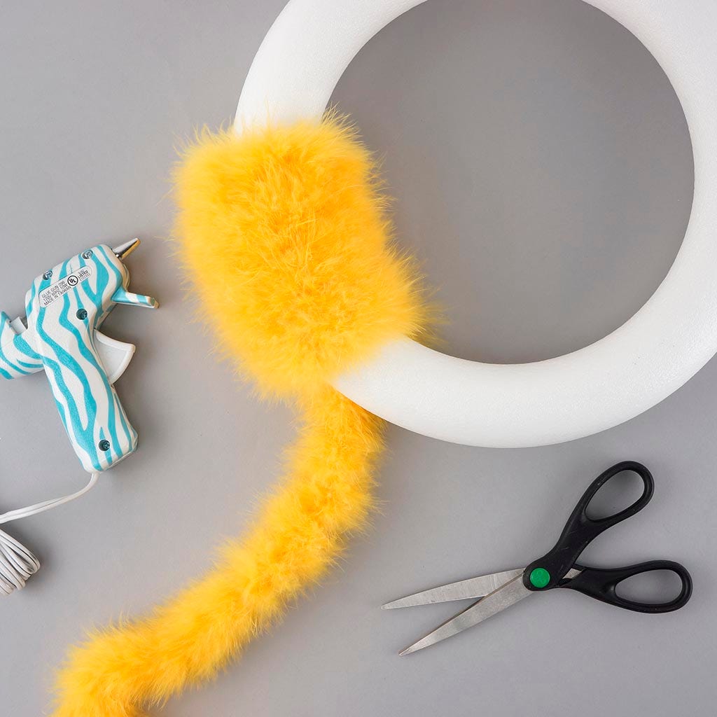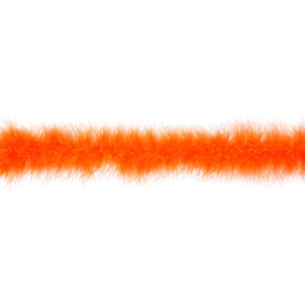 This orange feather boa is 2 yards (6 feet) long and approx 1.5 inch in diameter. This type of thin feather boa is often referred to as a craft boa or feather boa trim because its small diameter makes it easy to cut and glue without unraveling as feathers are sewn onto a cotton cord.