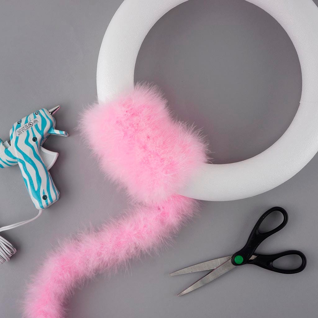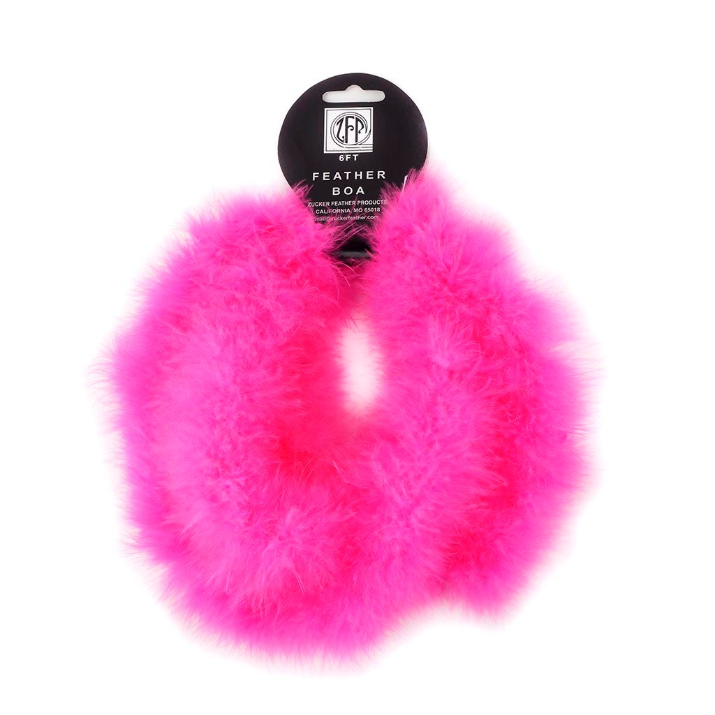 This pink feather boa is 2 yards (6 feet) long and approx 1.5 inch in diameter. This type of thin feather boa is often referred to as a craft boa or feather boa trim because its small diameter makes it easy to cut and glue without unraveling as feathers are sewn onto a cotton cord.