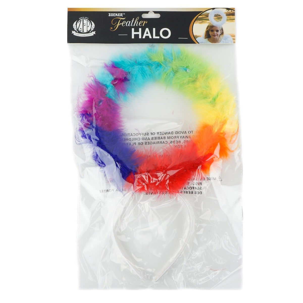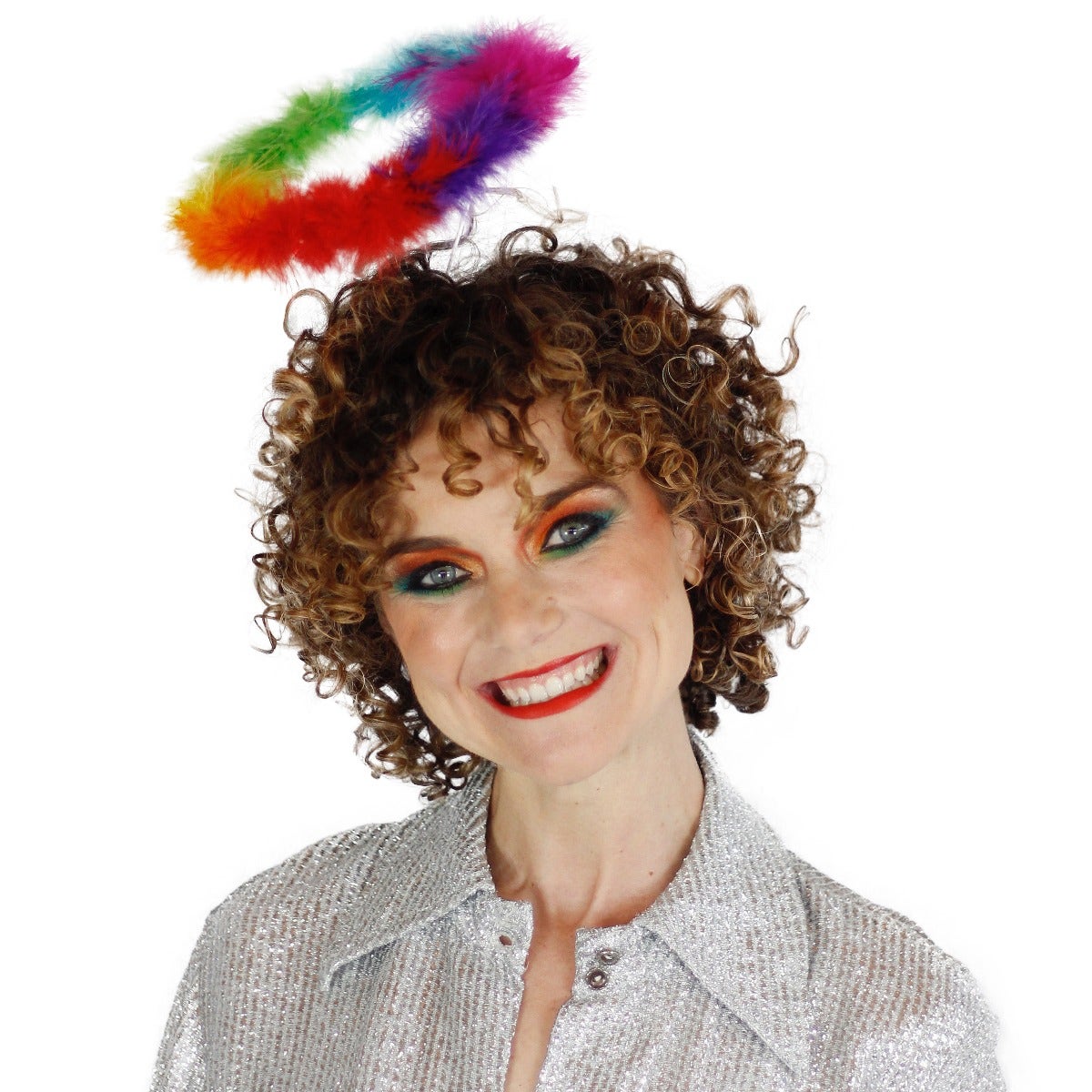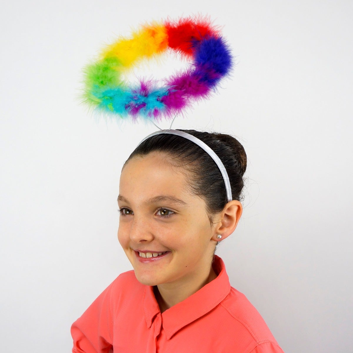 The Halo is wrapped in soft Rainbow Colored Marabou feathers for a lightweight fun look.