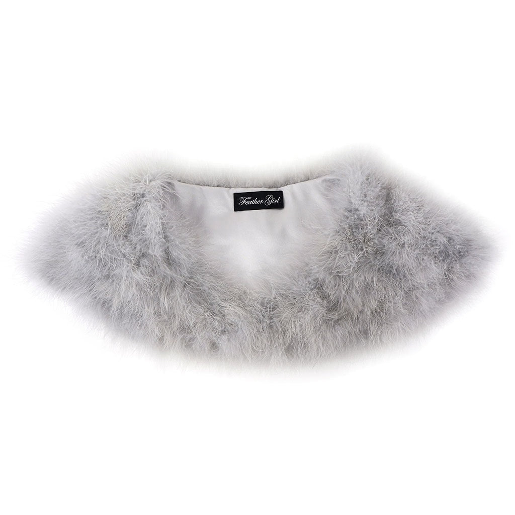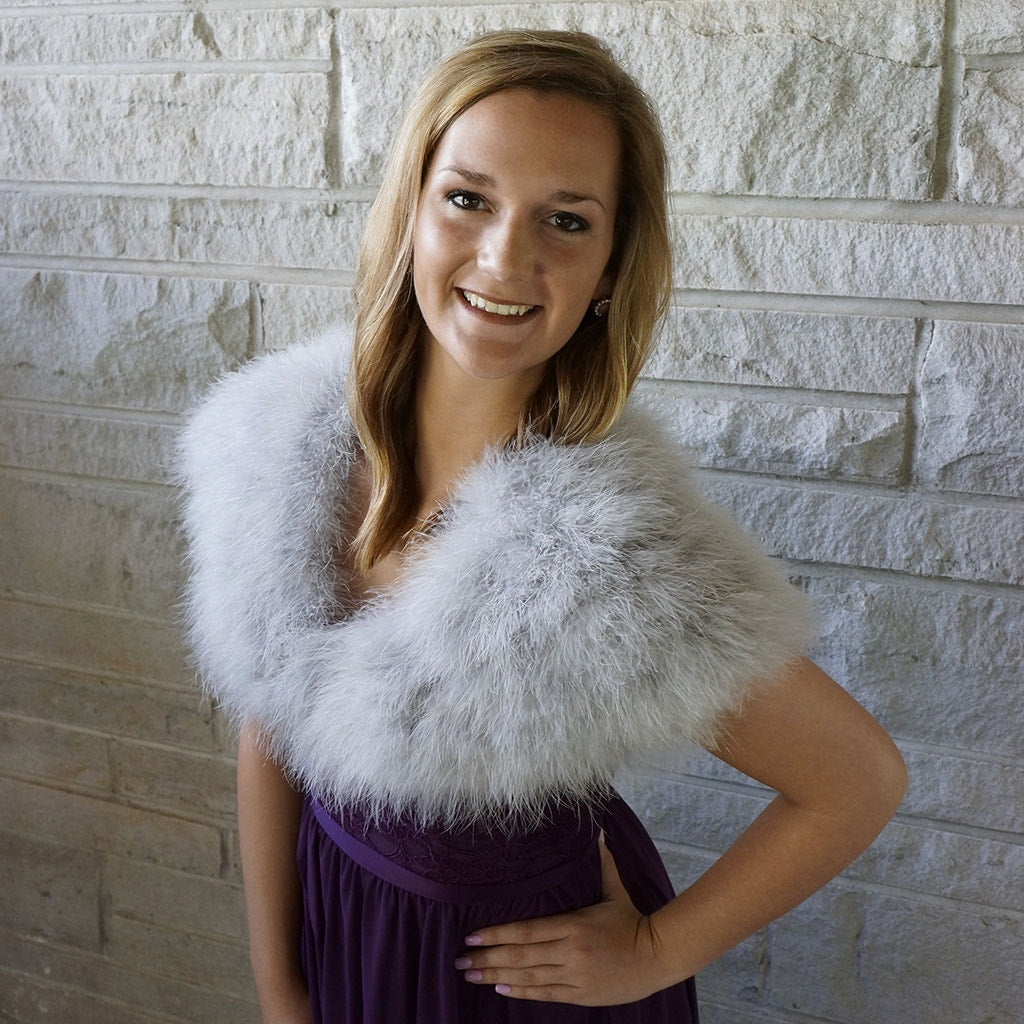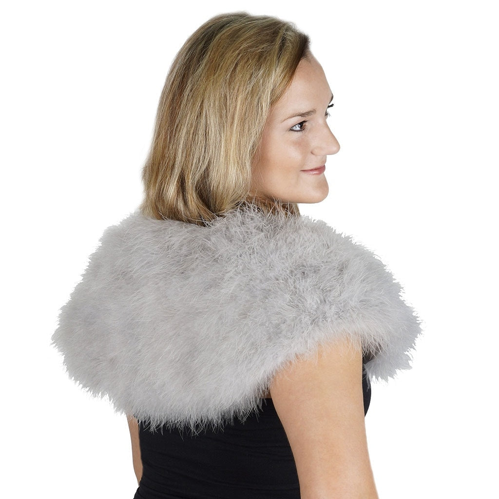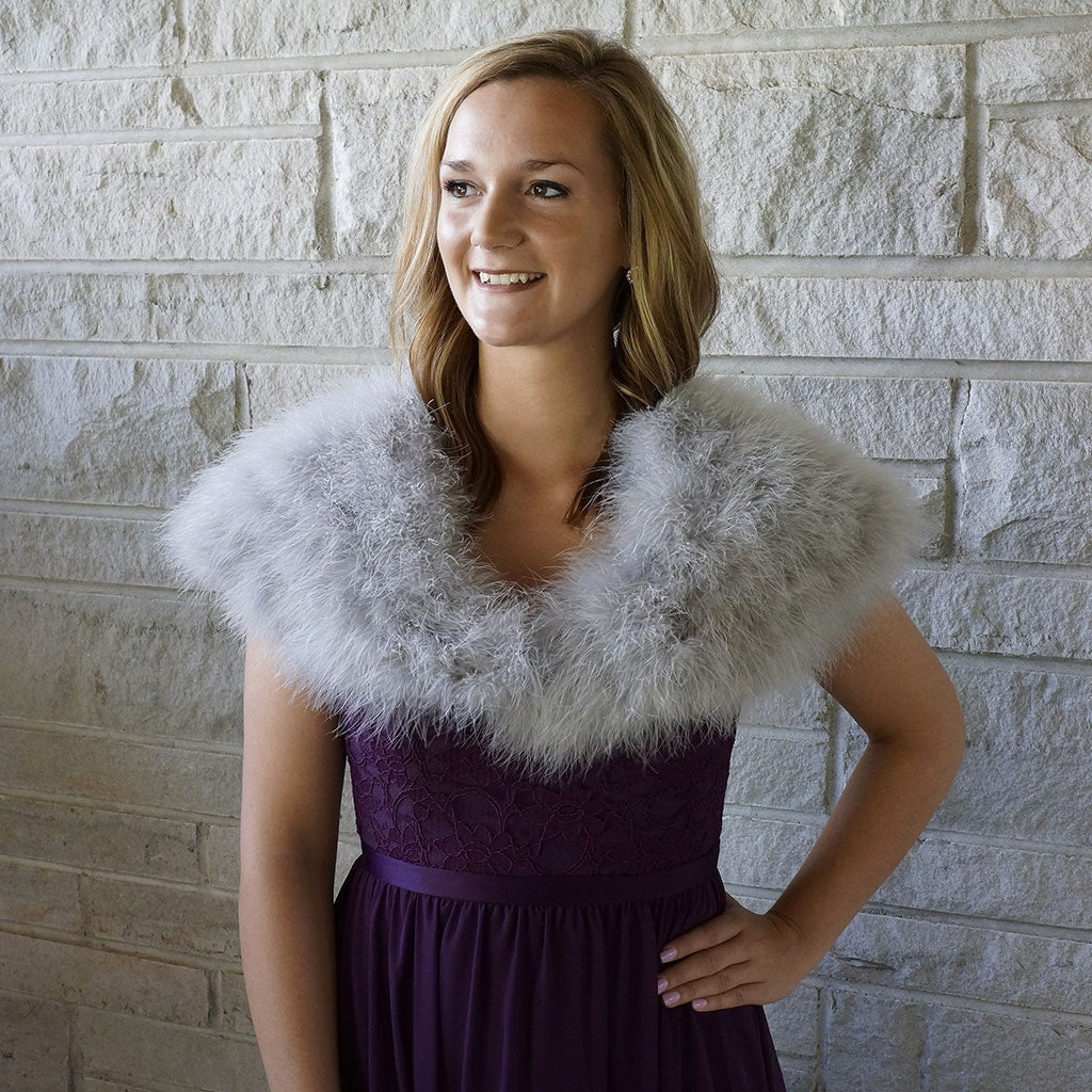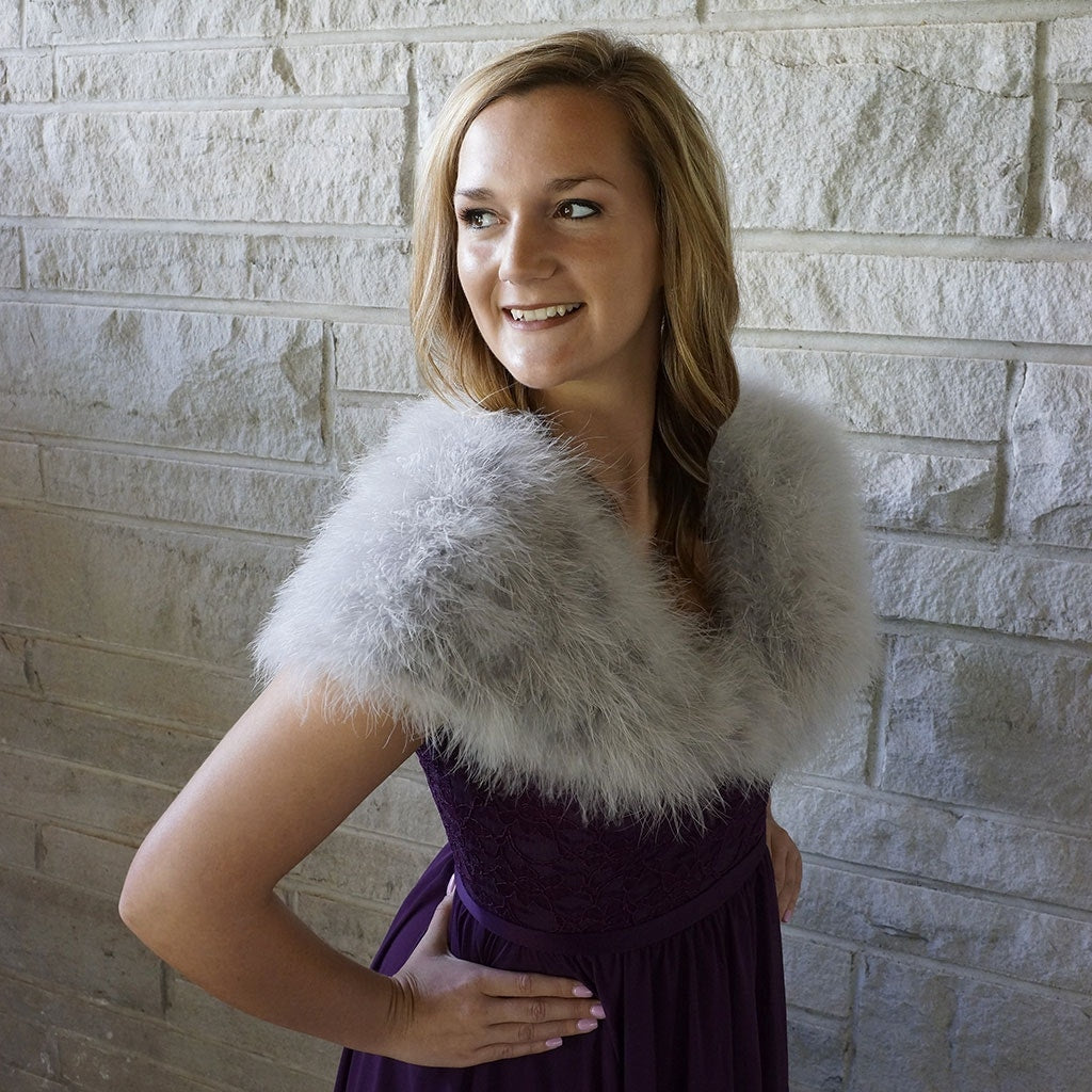 This Marabou shawl is 8" x 39" inches and is fully lined with a stain-blend material, and has a discreet hook and eye in the front of the shawl to be worn open or closed. The soft marabou feathers on this shawl is just as luxurious as real fur, or high quality faux fur, and is fun to wear over a jacket or with an elegant dress or blouse. This feather shawl is also the perfect bridal accessory for any age.