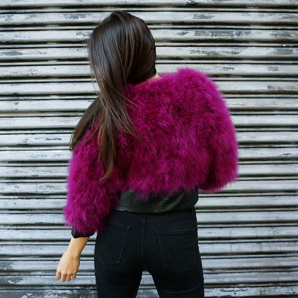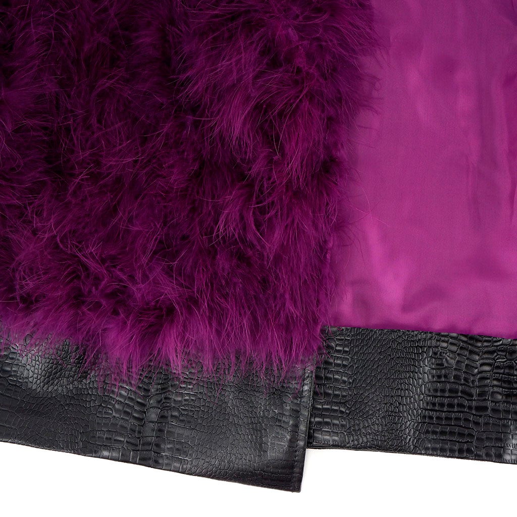 This luxurious Marabou Feather Jacket w/Pleather Trim is made with Turkey Marabou feathers and has a 15.5" sleeve x 19" back that will fit a medium to large size. The lining of this jacked is made with a satin blend fabric that feels comfortable against the skin. The textured faux leather trim around the waist line and 3 quarter sleeve give this feather jacket a stylish finish to compliment any body type. There are 3 snaps along the center to allow this jacket to be worn open or closed.