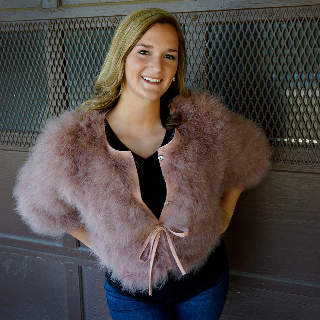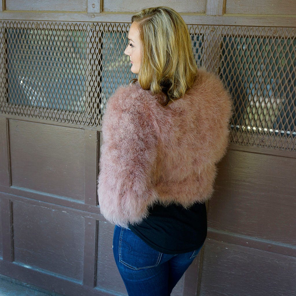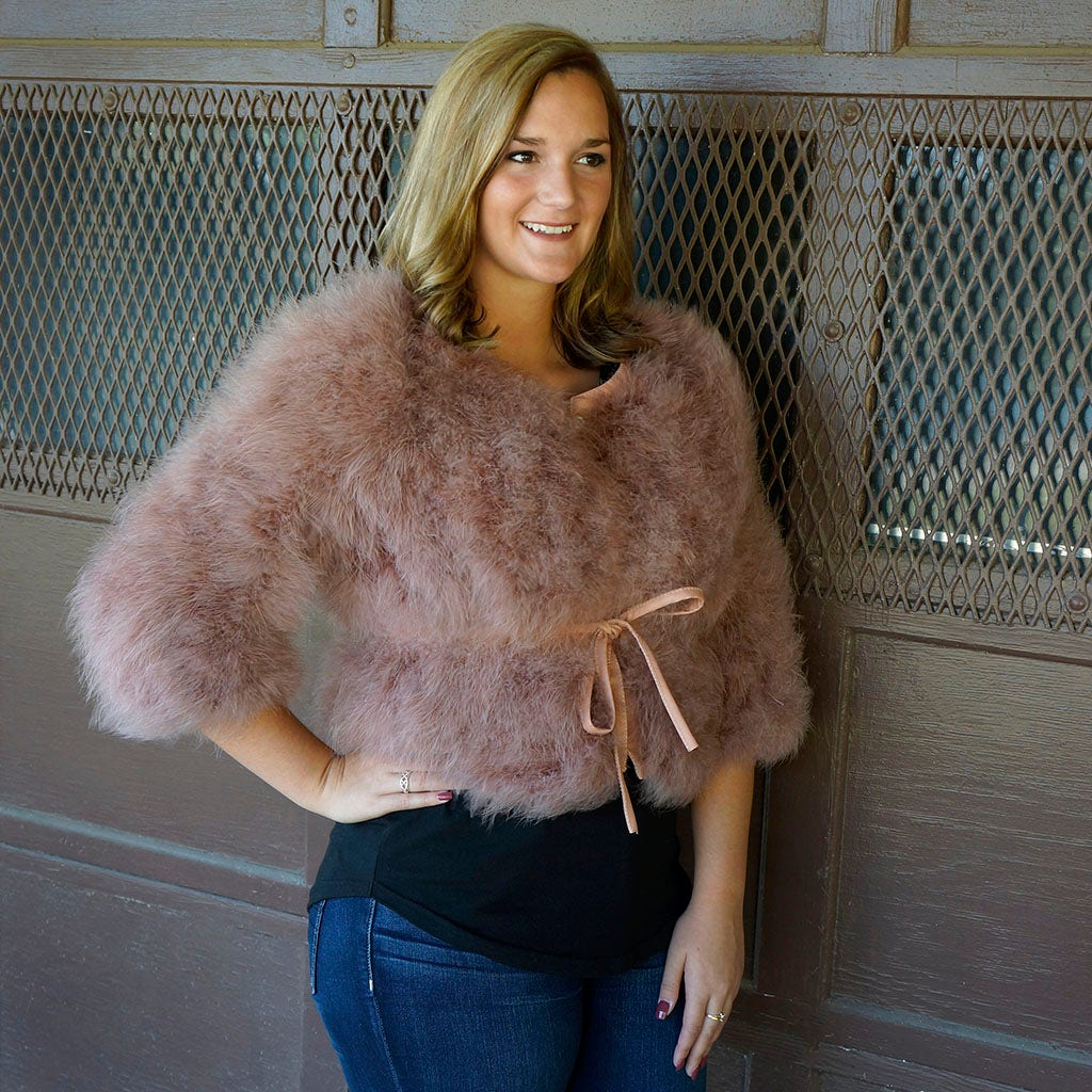 This luxurious Marabou Feather Jacket w/Cinch Belt is made with Turkey Marabou feathers and has a 16.5" sleeve x 17.5" back that will fit a small to medium size. The lining of this jacked is made with a satin blend fabric that feels comfortable against the skin. The built-in cinch belt is made with faux leather that can be worn tied together or left open. There are 3 hook and eye's along the center that allow the jacket to be worn in several stylistic ways.