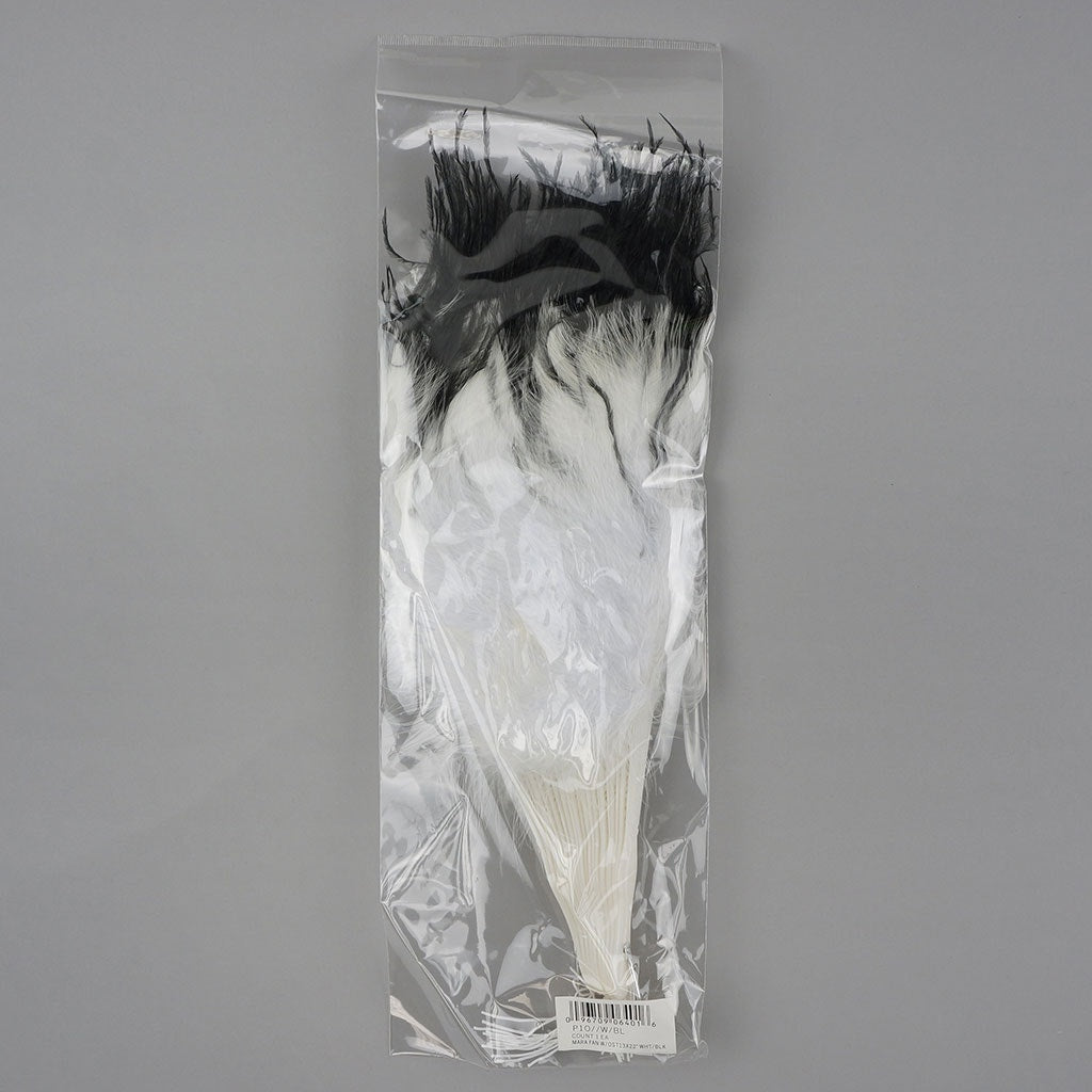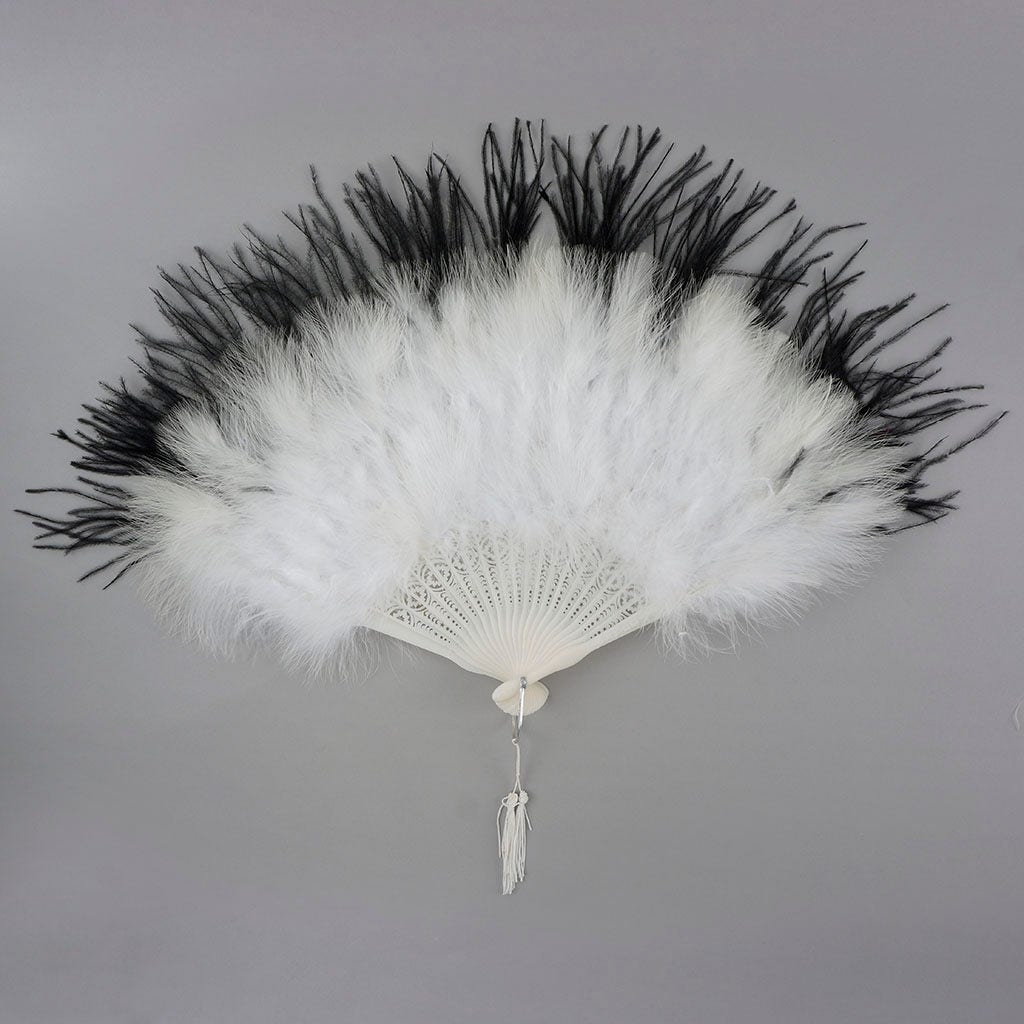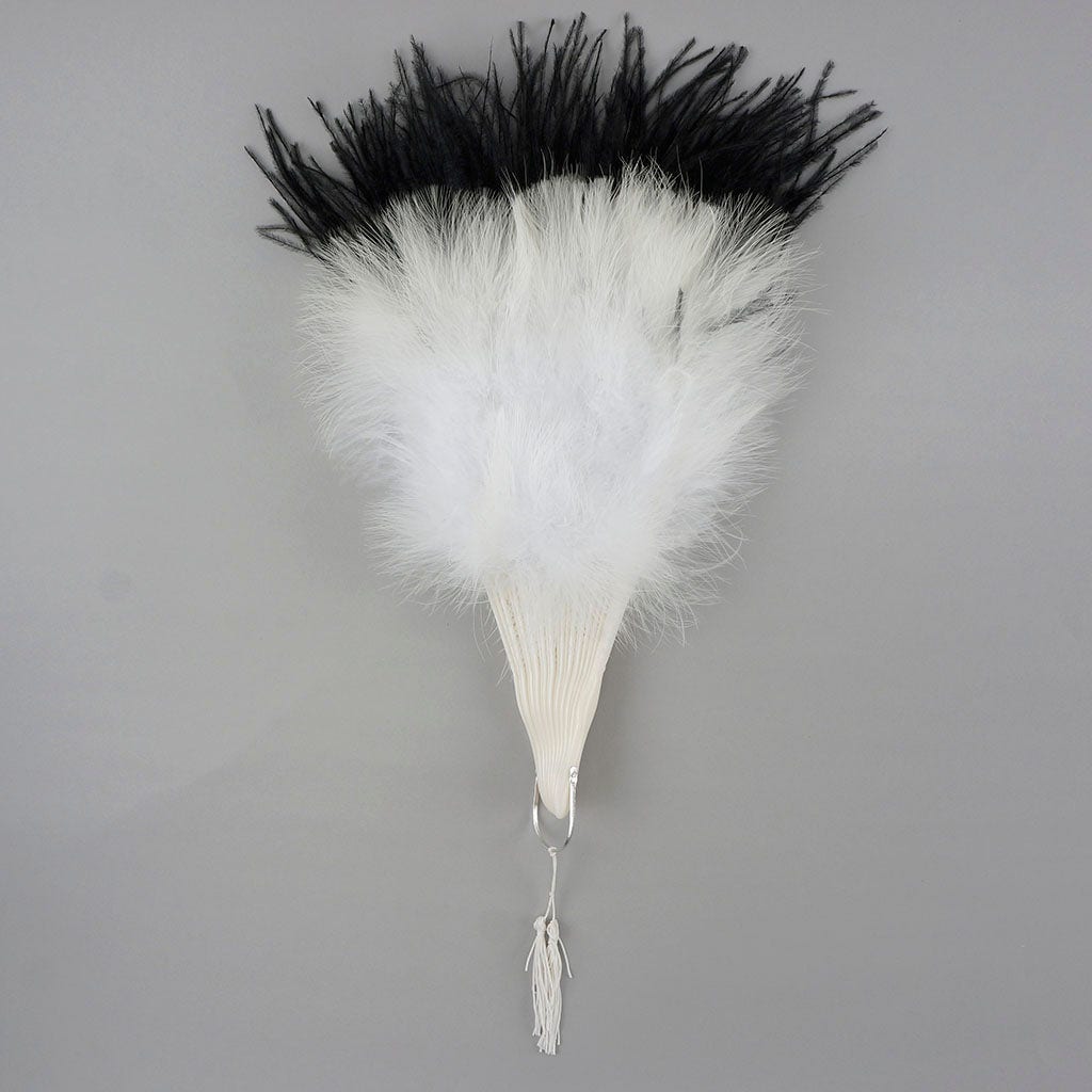 Marabou Feather Fan w/Ostrich Feathers are handmade with soft white Marabou Feathers and is tipped with black Ostrich Feather Fringe. When fully open, this fan measures 13x22 inches. This fan has 21 decorative plastic staves, each connected with a color coordinated tassel tied metal ring. Marabou feathers are applied to the fan staves leaving approx 4" of stave showing at the bottom. The wisps of the black ostrich fringe against the white marabou adds a whimsical touch to this fan.