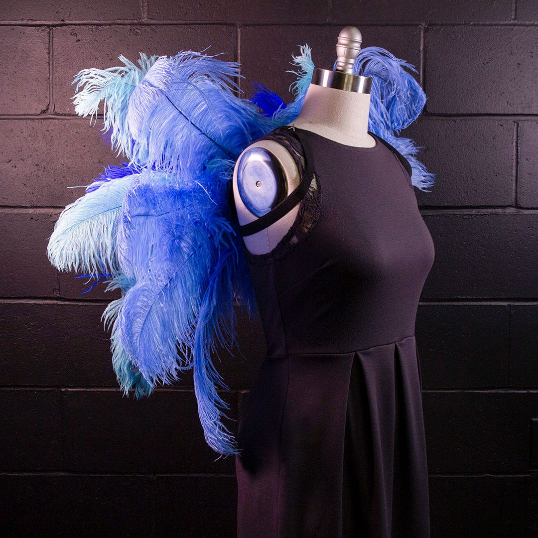 Bluejay Costume Wings with Blue Ostrich Feathers are made of slightly imperfect ostrich feathers in a shades of blue.