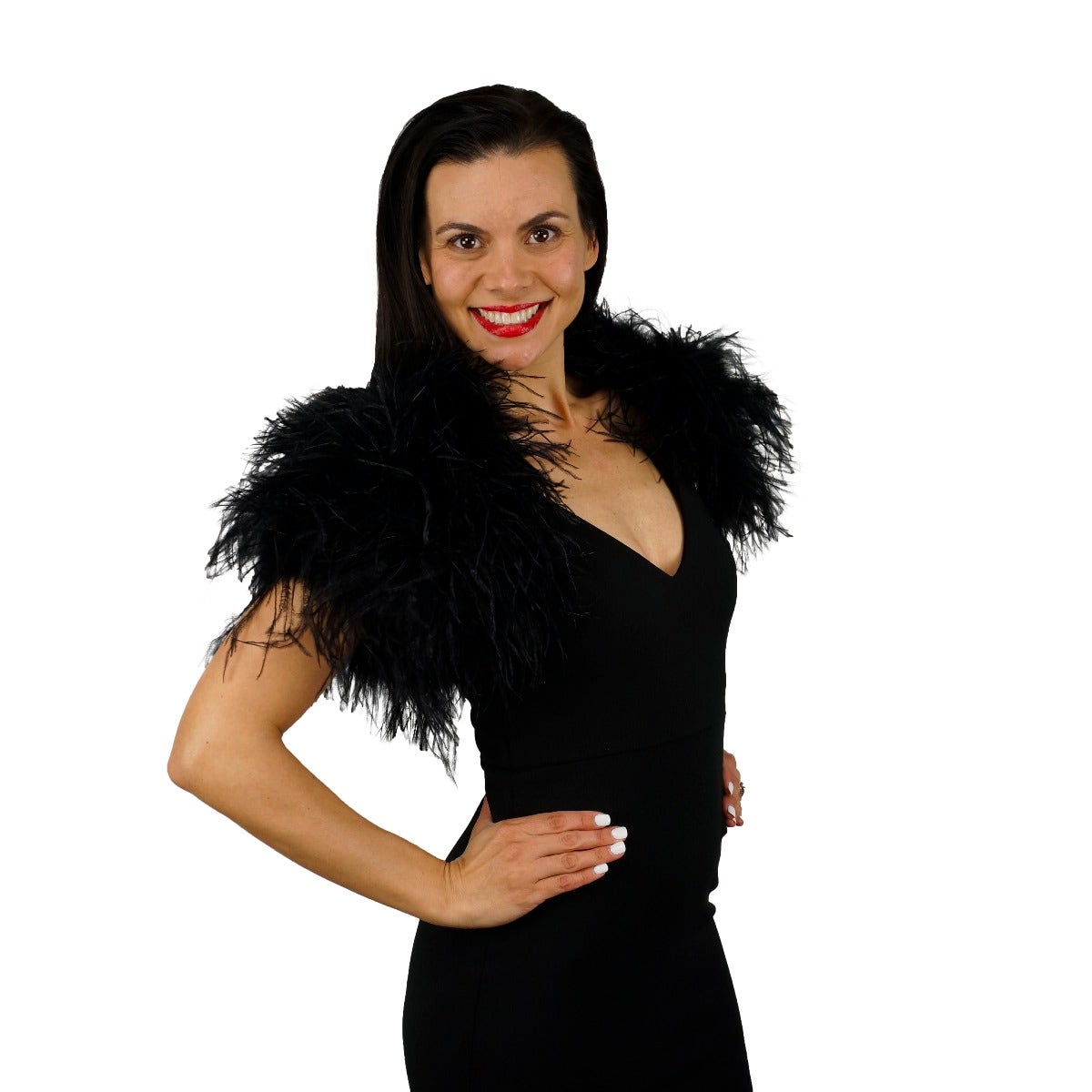 This Ostrich Feather Capelet has a full approximately 10 inch back of layered Ostrich with a shoulder width of 17.5 inch. Shrug is fully lined with matching satin-blend material that is tailored for a perfect look.