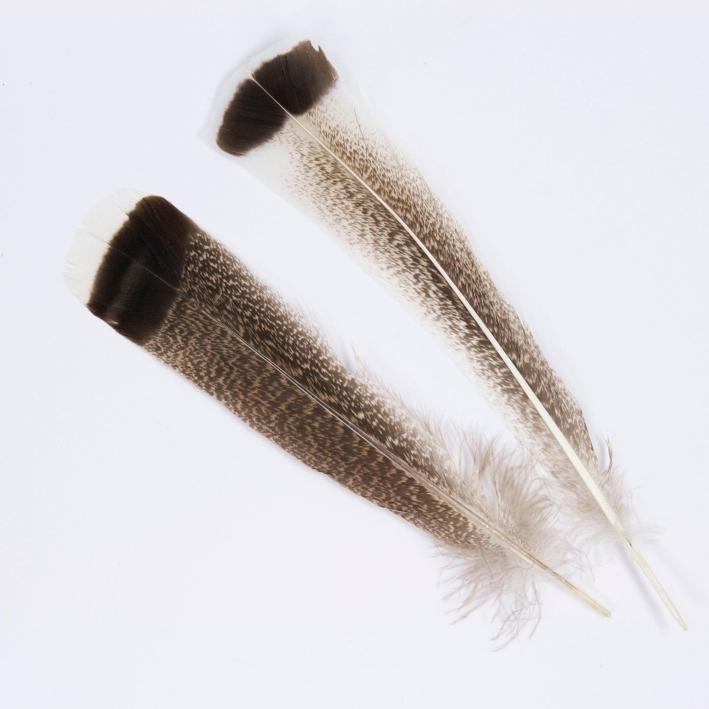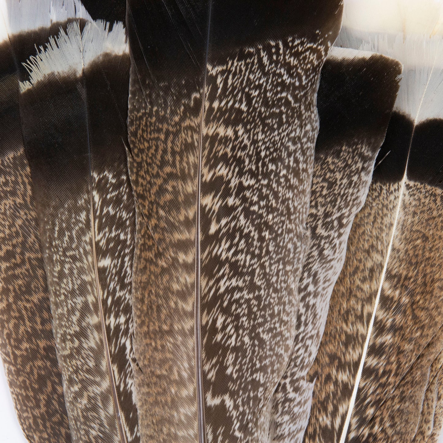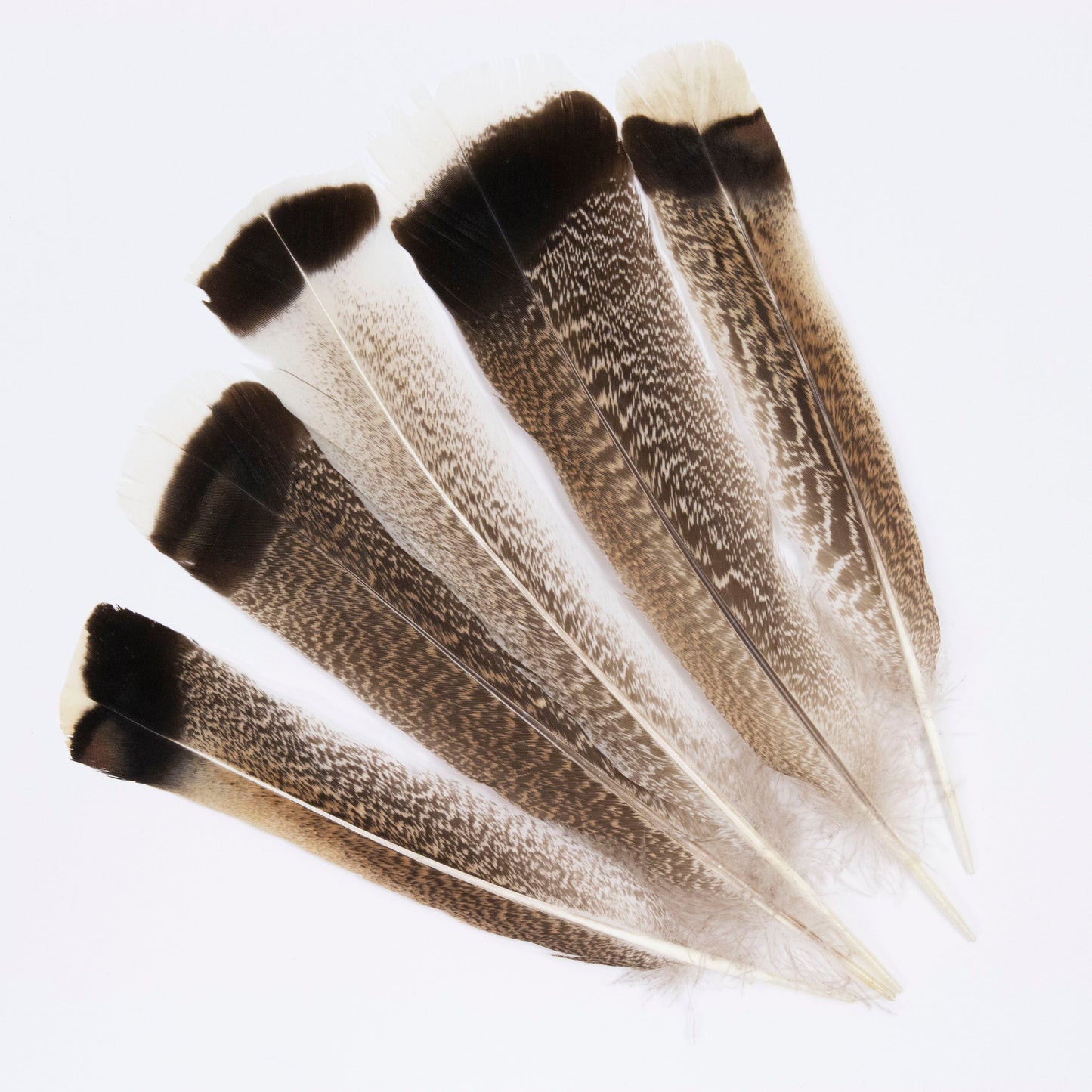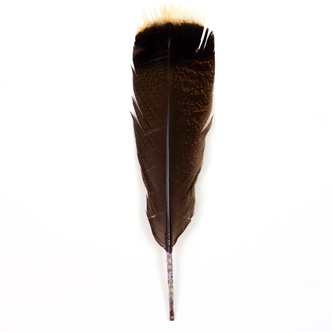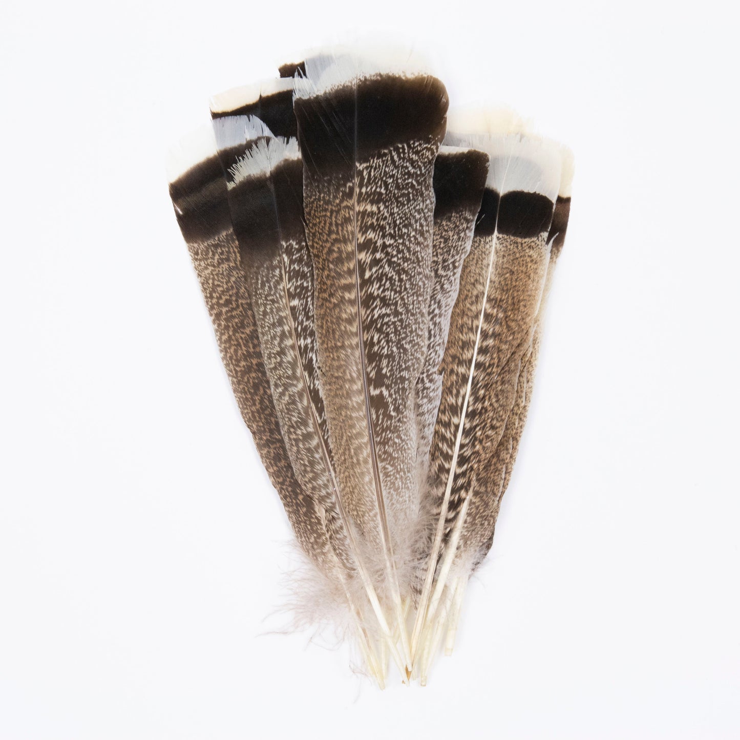 Natural Bronze Turkey Tail Feathers are approximately 8-14 inches in length and 2 to 2.5 inches wide. There are 12 pcs in each package. Natural Bronze Turkey Tails are Brown with Dark Natural Iridescent markings and stripes throughout the quill. They are flat across the top, tapering down to a stiff center quill.