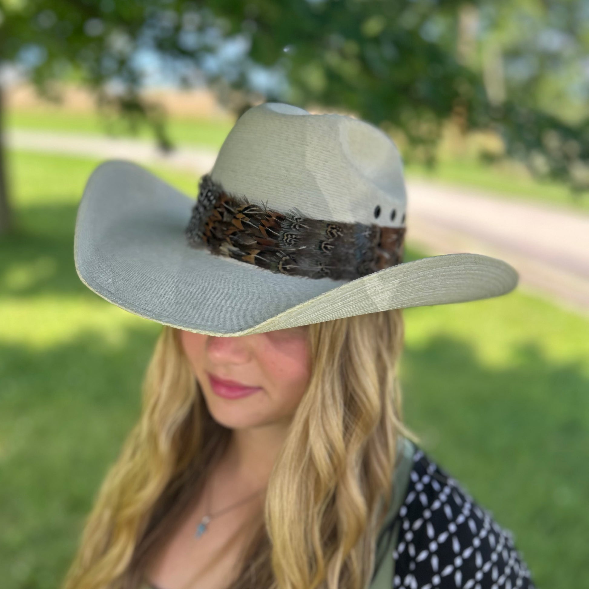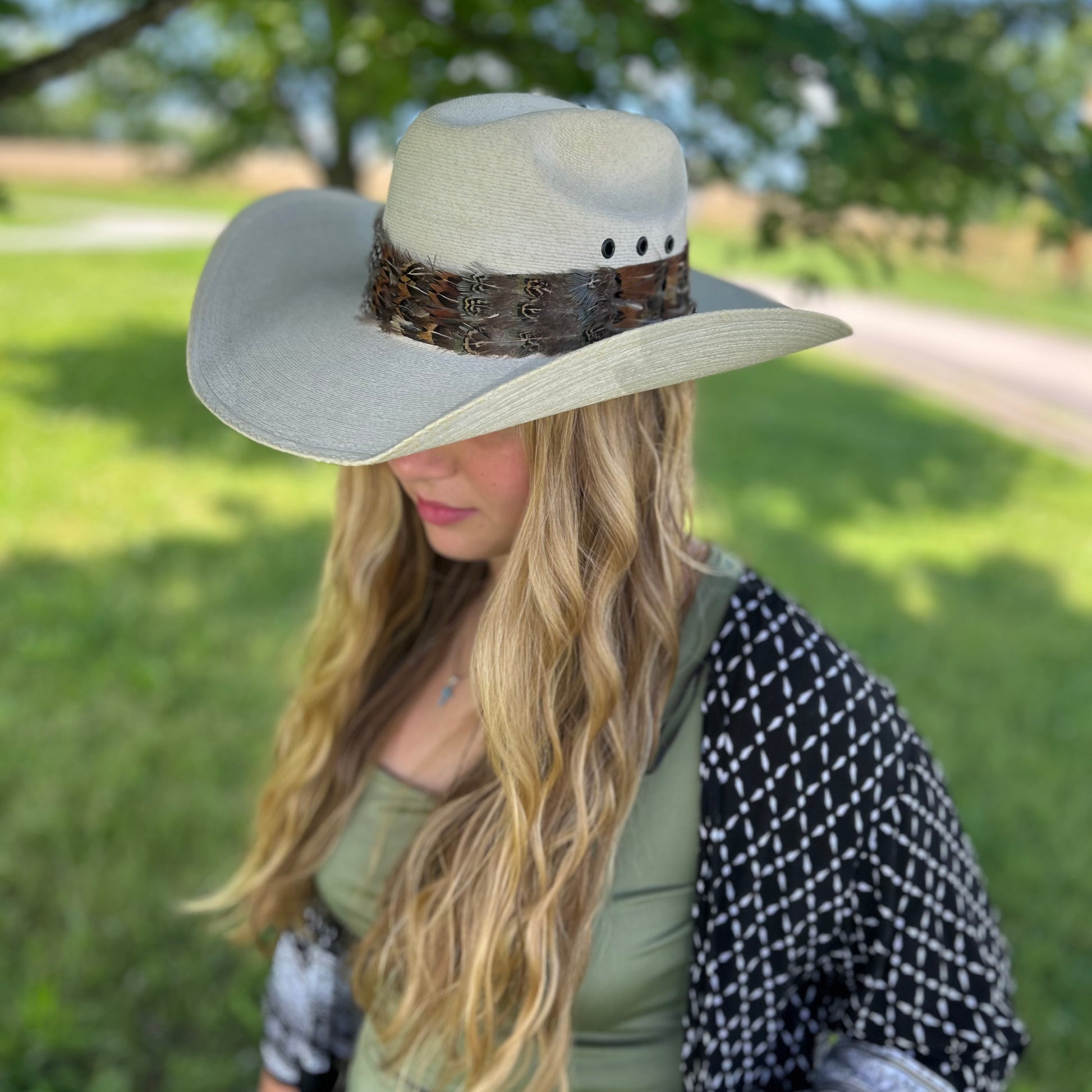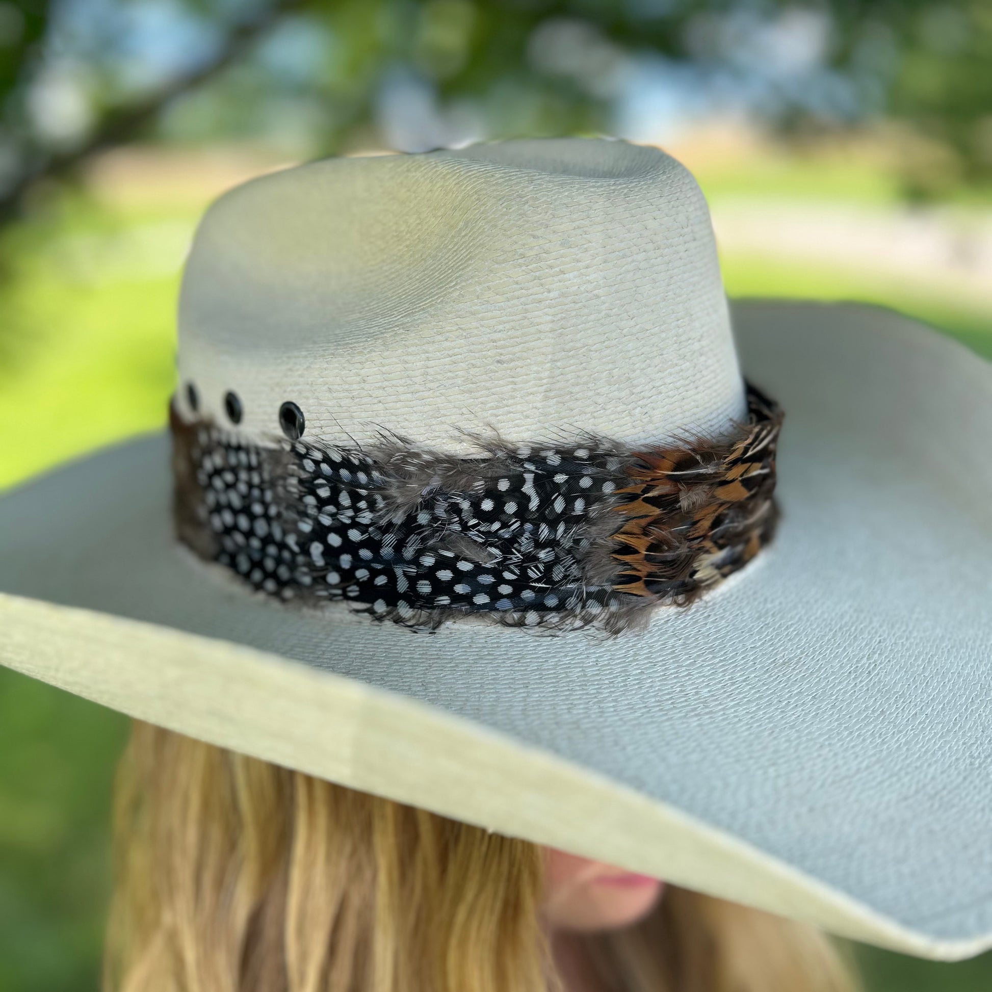 Natural Feather Hat Band and Trim with Elastic Feather trim handmade with 100% all natural un-dyed pheasant and guinea feathers and plumage (Feather types : Blue Almond Plumage, Dark Heart Plumage, Guinea Plumage, Female Ringneck Plumage) that have been glued on to a polyester-blend band. This feather band is approx 1.5 inches wide and 22 inches long. Add the a touch of western flair to your hat with this fashionable, on trend feather band and trim.