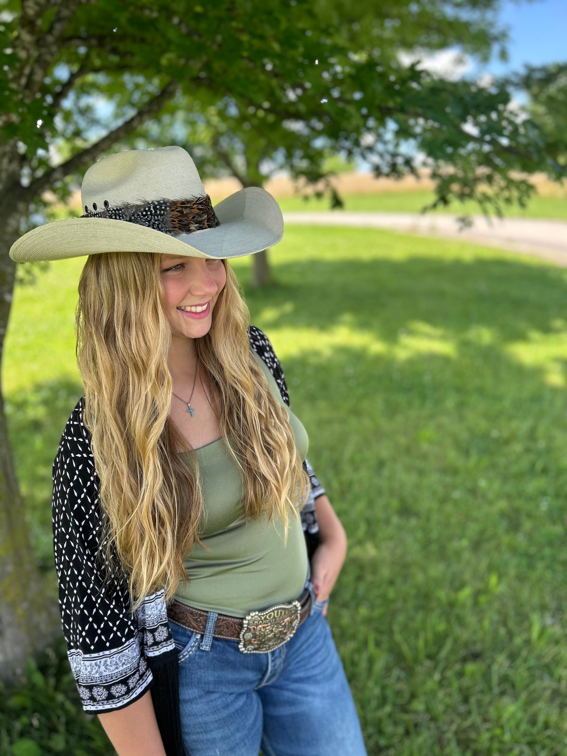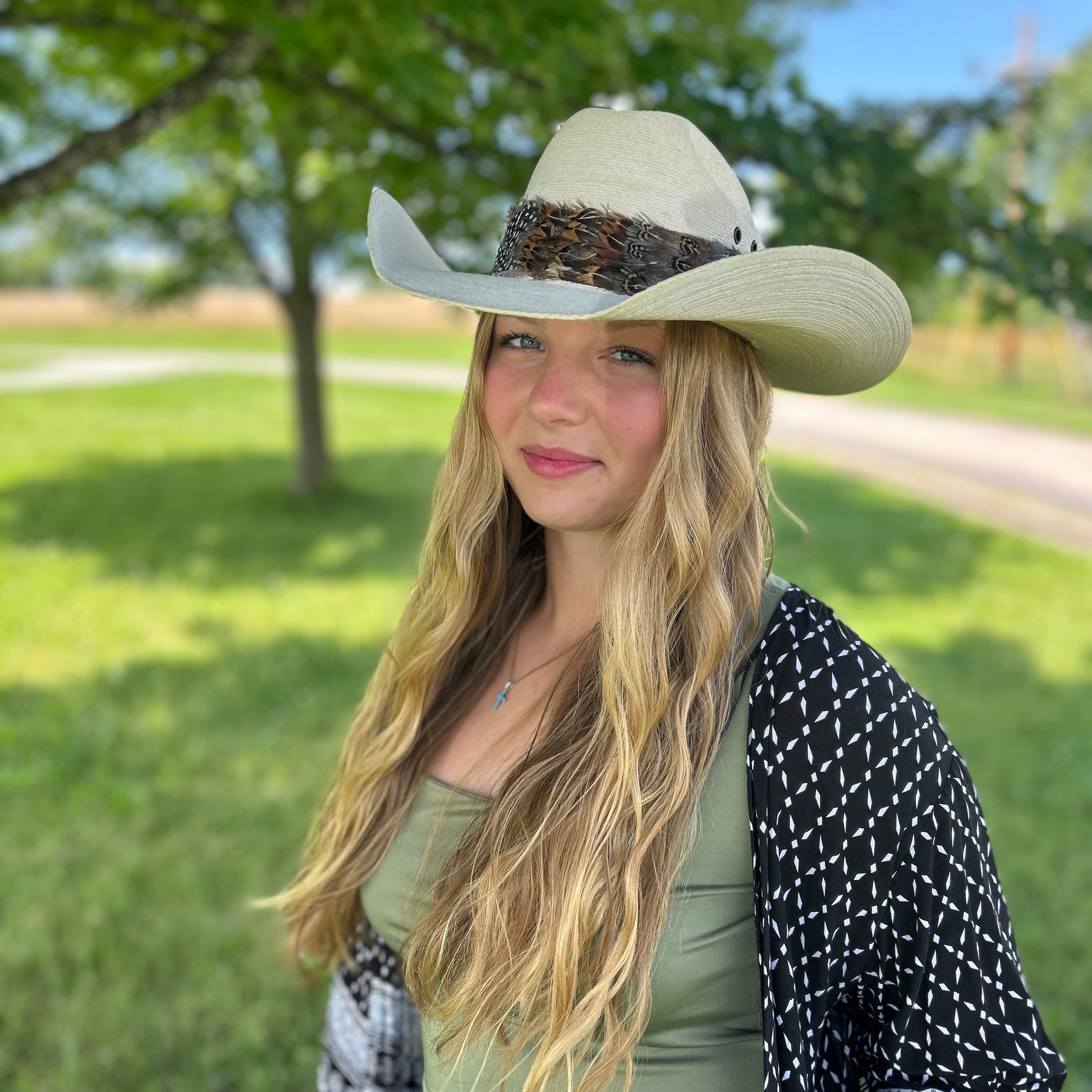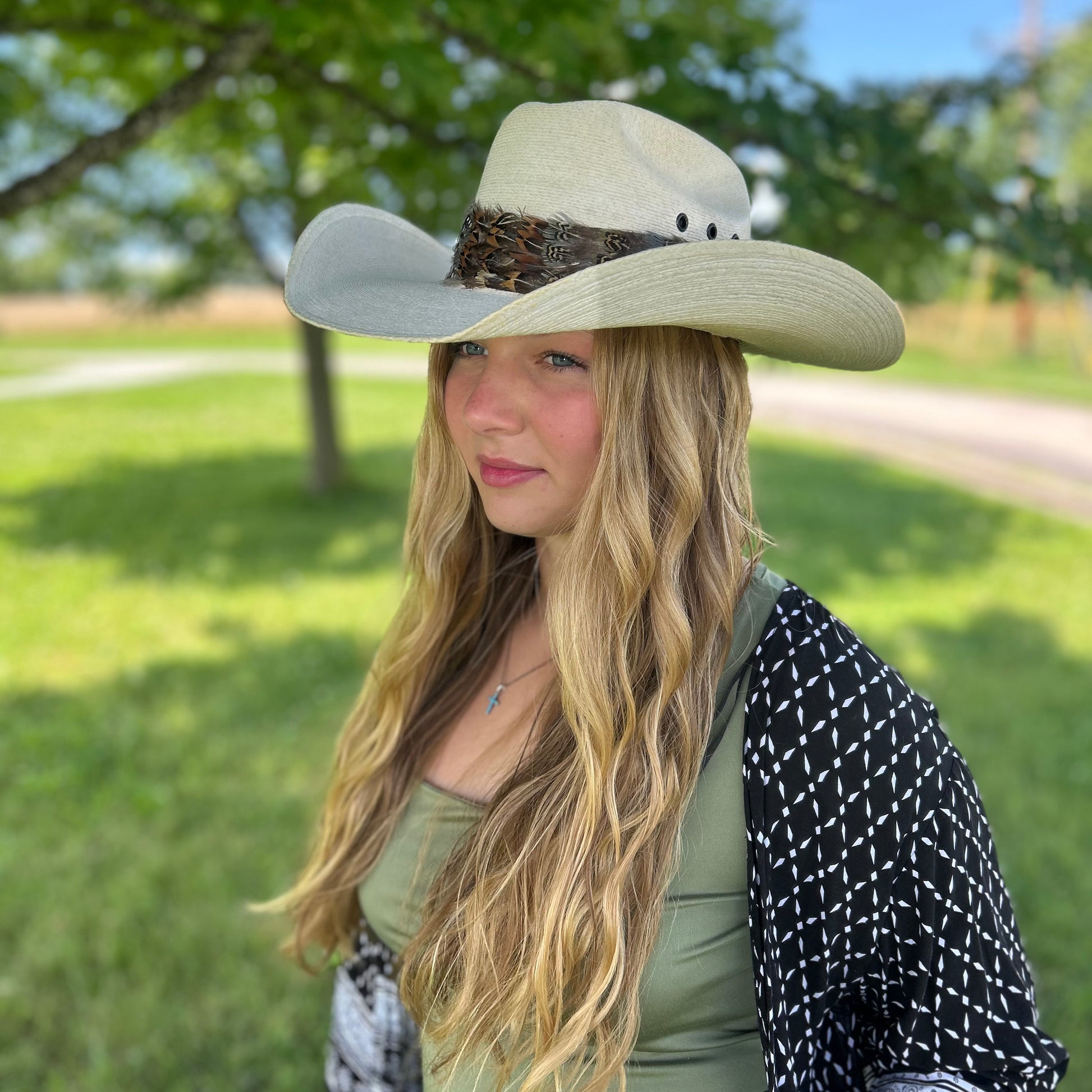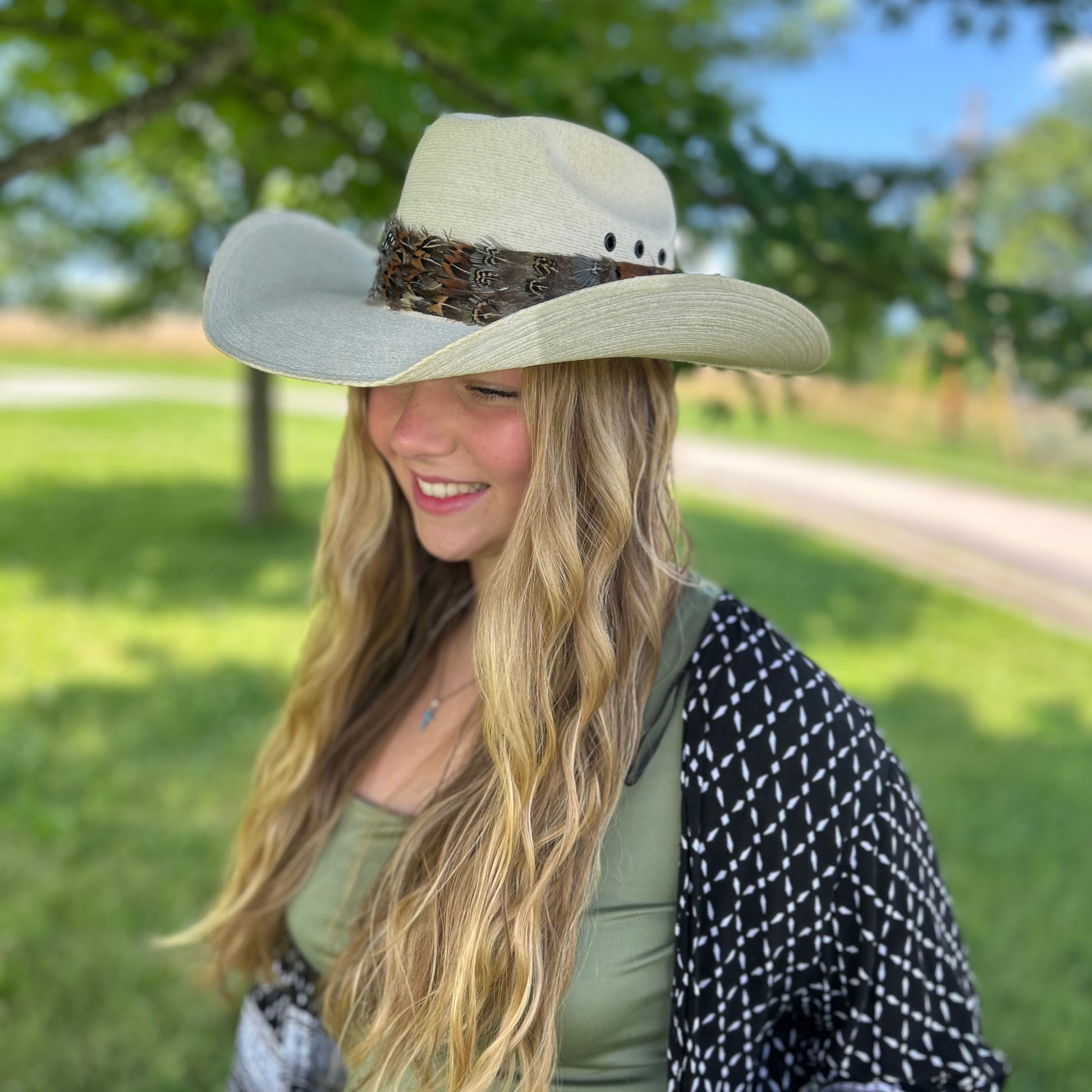 Natural Feather Hat Band and Trim with Elastic Feather trim handmade with 100% all natural un-dyed pheasant and guinea feathers and plumage (Feather types : Blue Almond Plumage, Dark Heart Plumage, Guinea Plumage, Female Ringneck Plumage) that have been glued on to a polyester-blend band. This feather band is approx 1.5 inches wide and 22 inches long. Add the a touch of western flair to your hat with this fashionable, on trend feather band and trim.