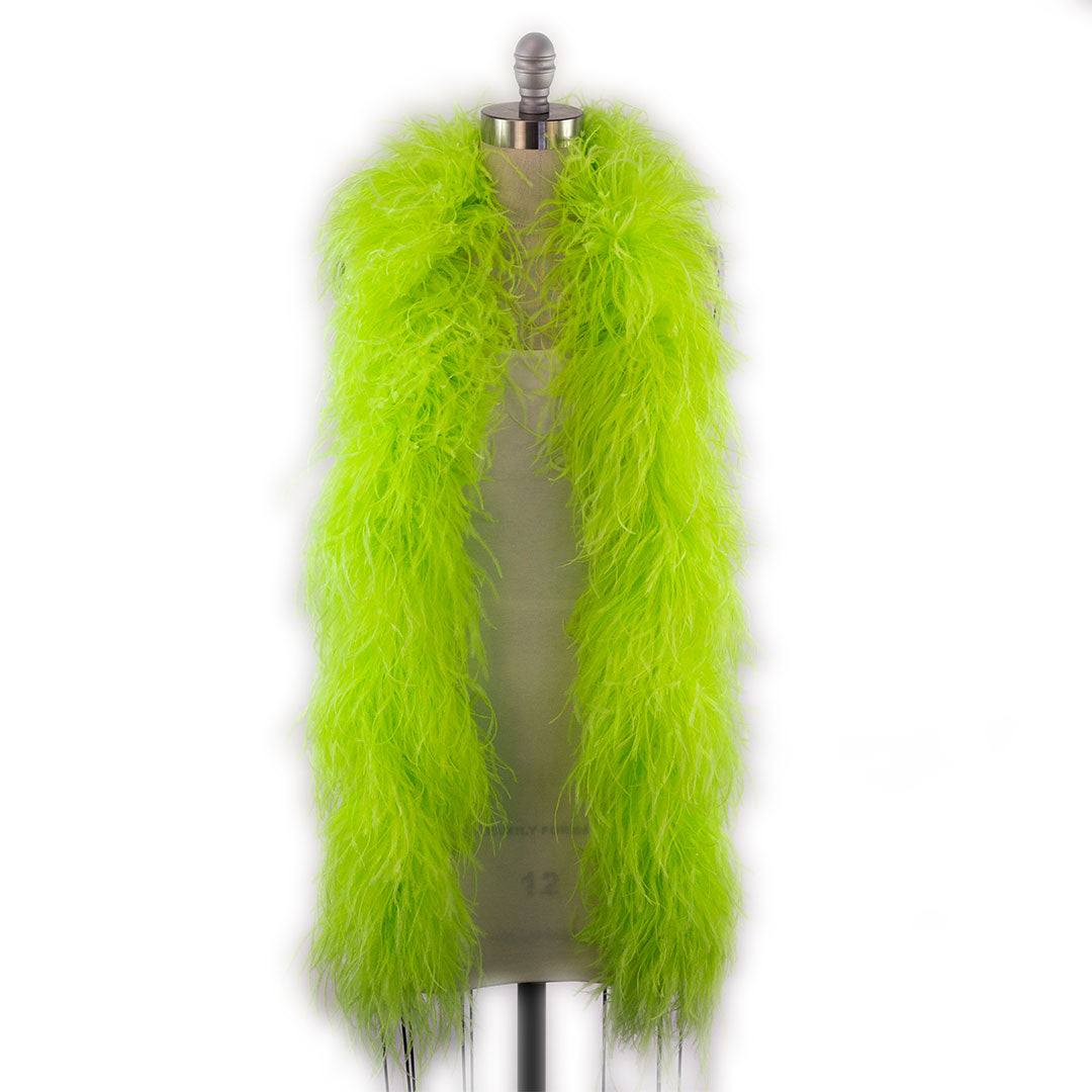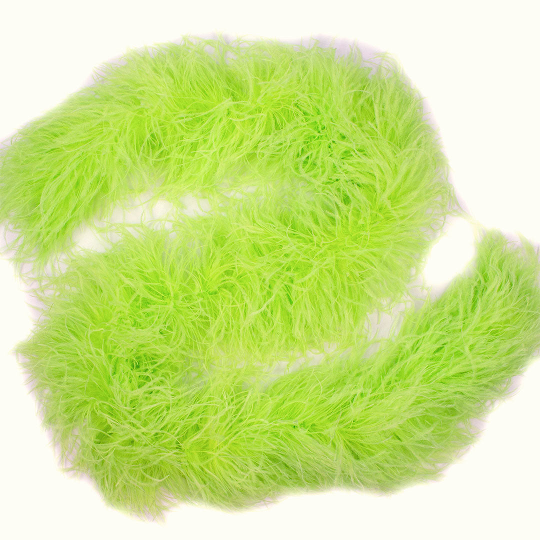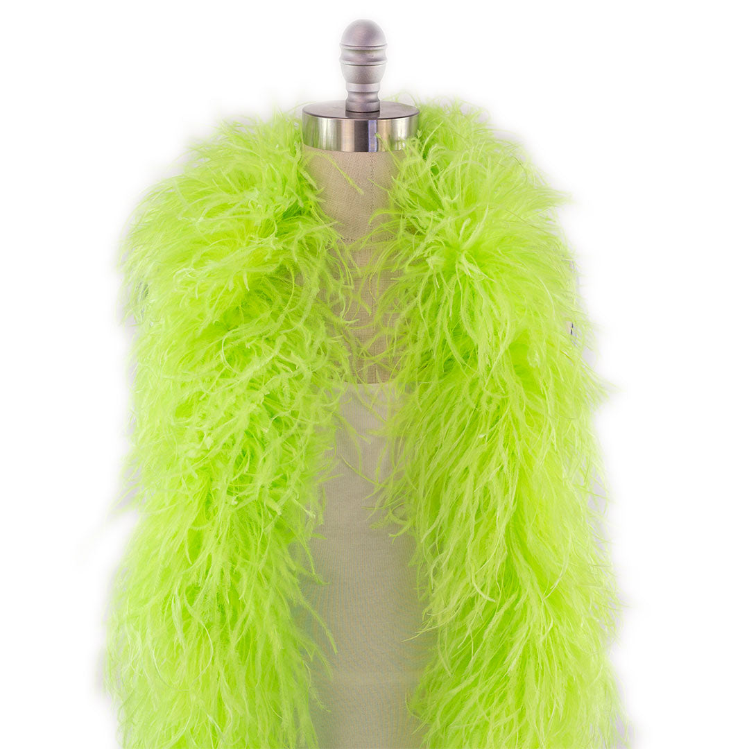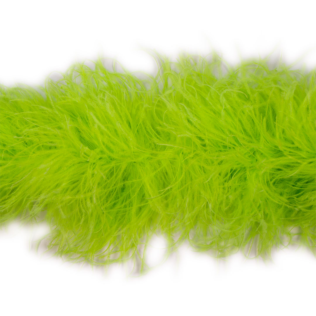 This neon green ostrich feather boa has marabou feathers with six layers of ostrich feathers sewn into it and measures approximately 6 feet long.. Our Zucker feather boa can be cut without unraveling as feathers are sewn on to a cotton cord. This ostrich boa is an ideal roaring 20s feather boa, perfect for a Great Gatsby theme party, as a fashion accessory or added as garland in home decor.
