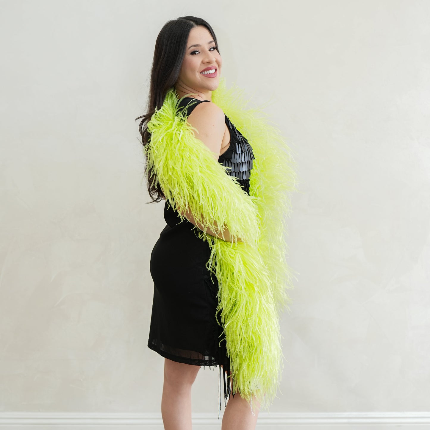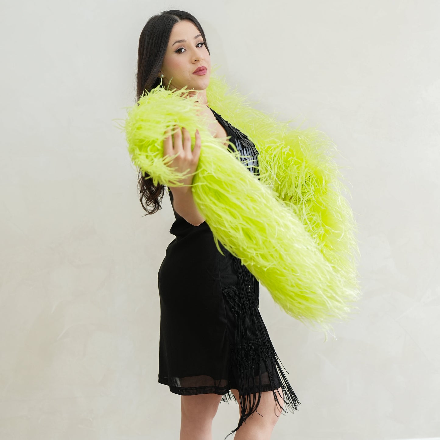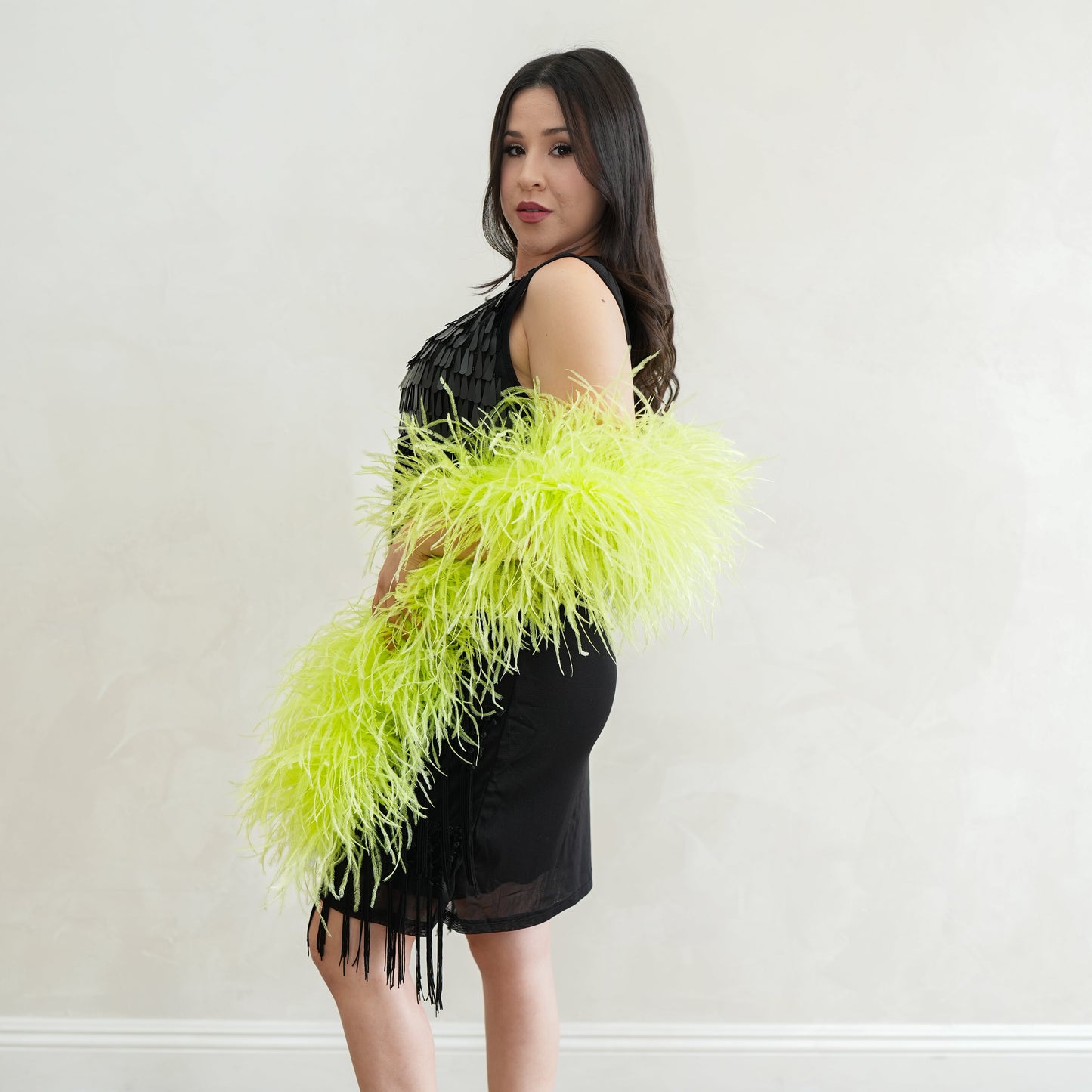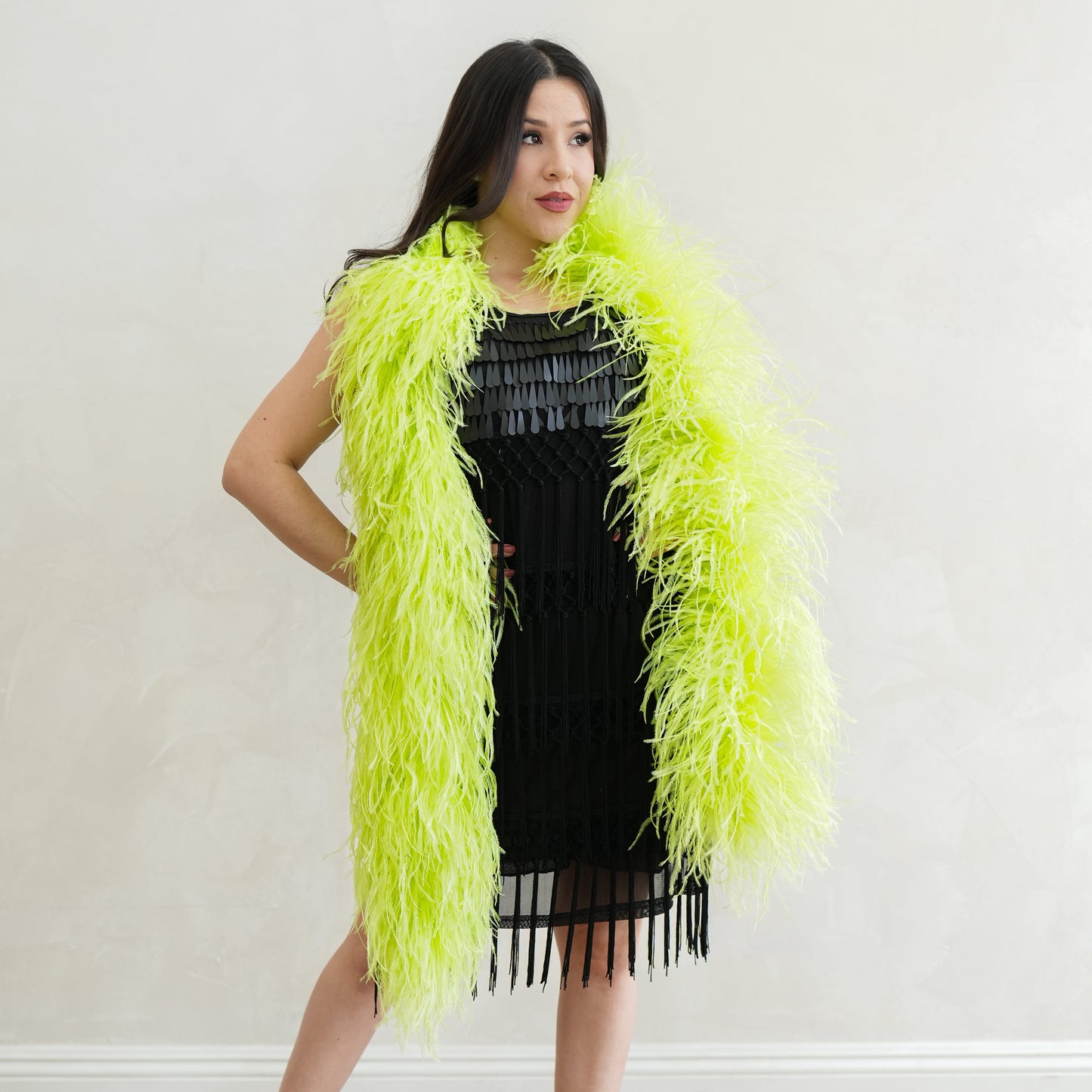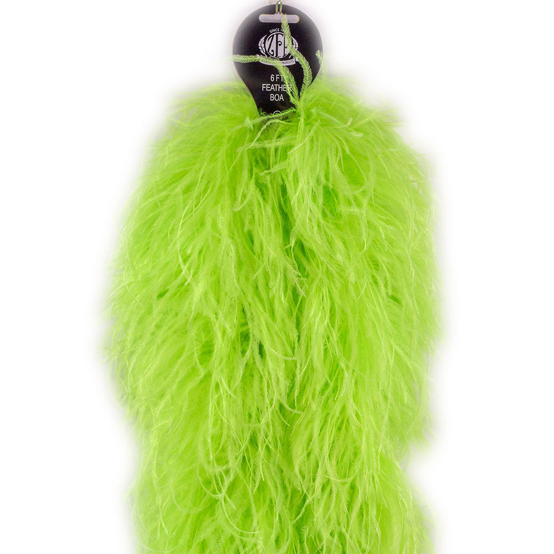 This neon green ostrich feather boa has marabou feathers with six layers of ostrich feathers sewn into it and measures approximately 6 feet long.. Our Zucker feather boa can be cut without unraveling as feathers are sewn on to a cotton cord. This ostrich boa is an ideal roaring 20s feather boa, perfect for a Great Gatsby theme party, as a fashion accessory or added as garland in home decor.