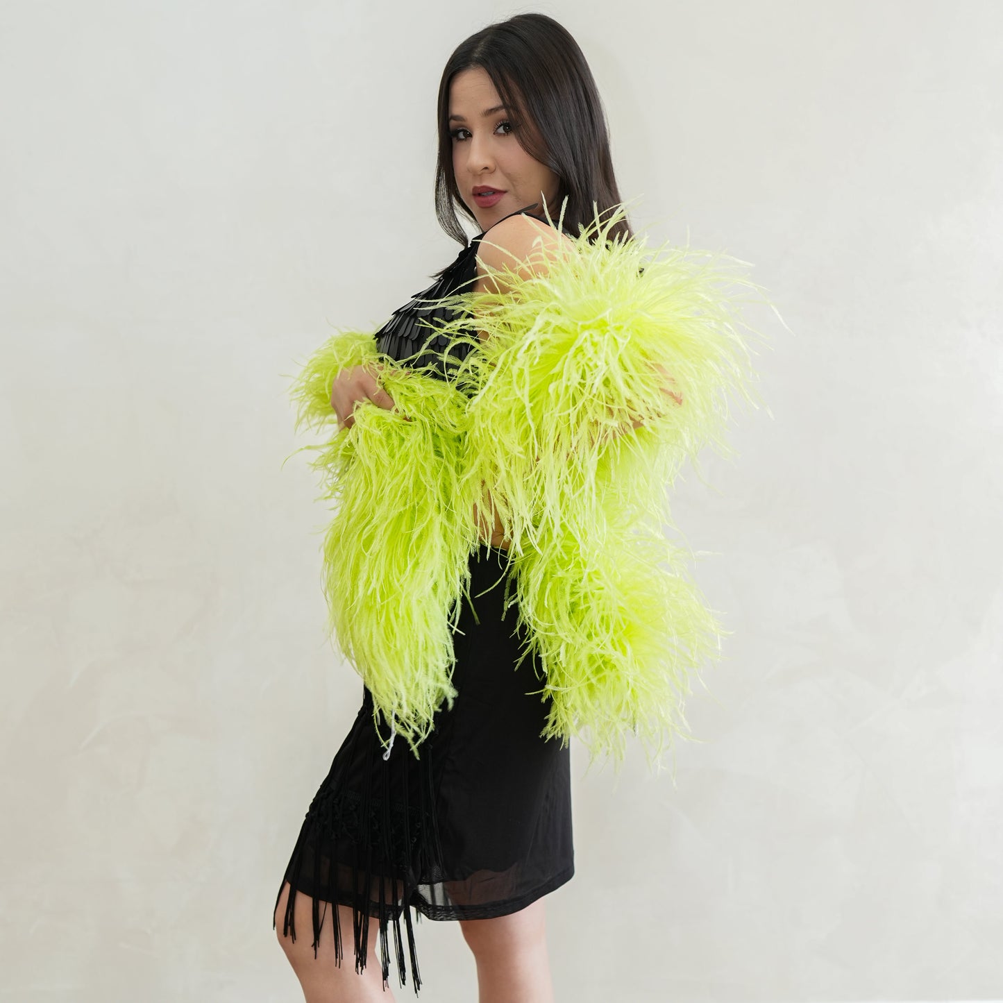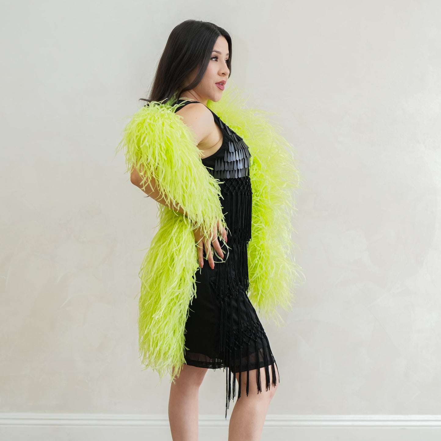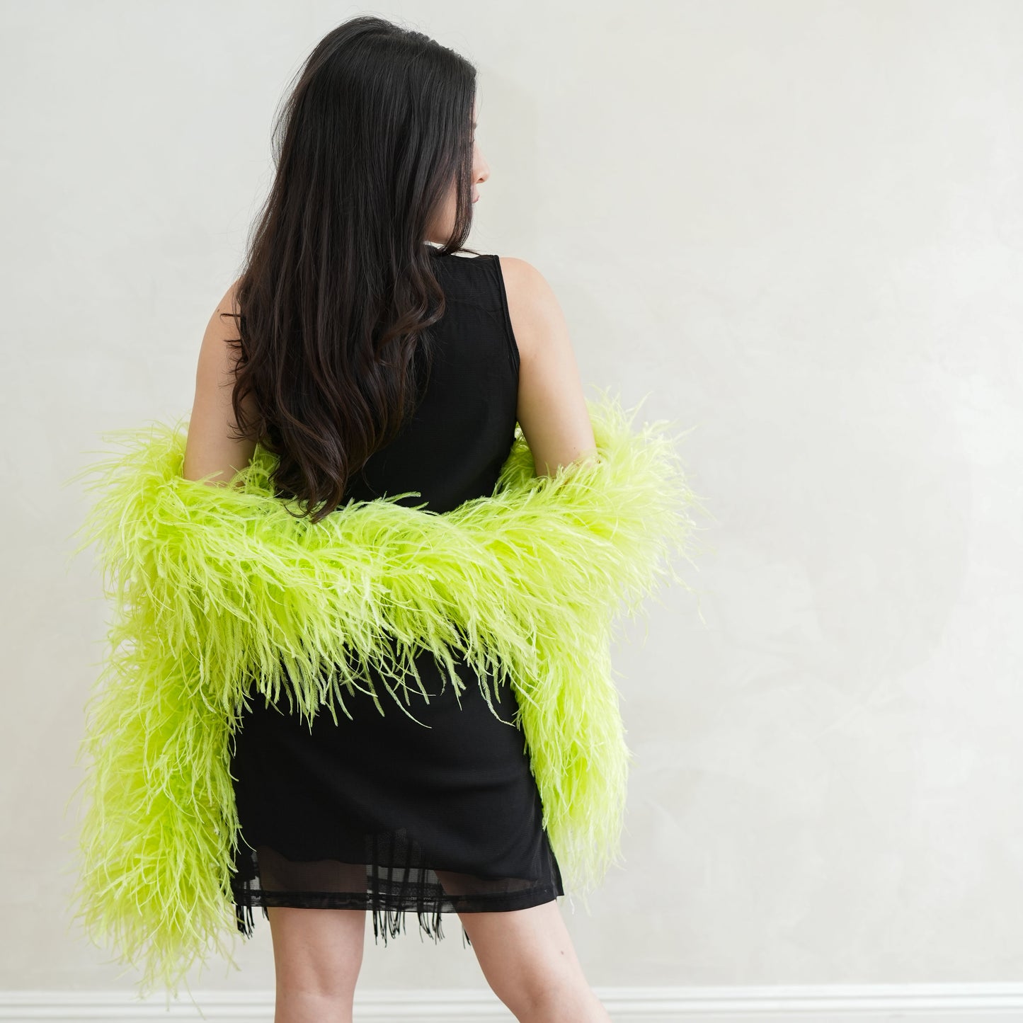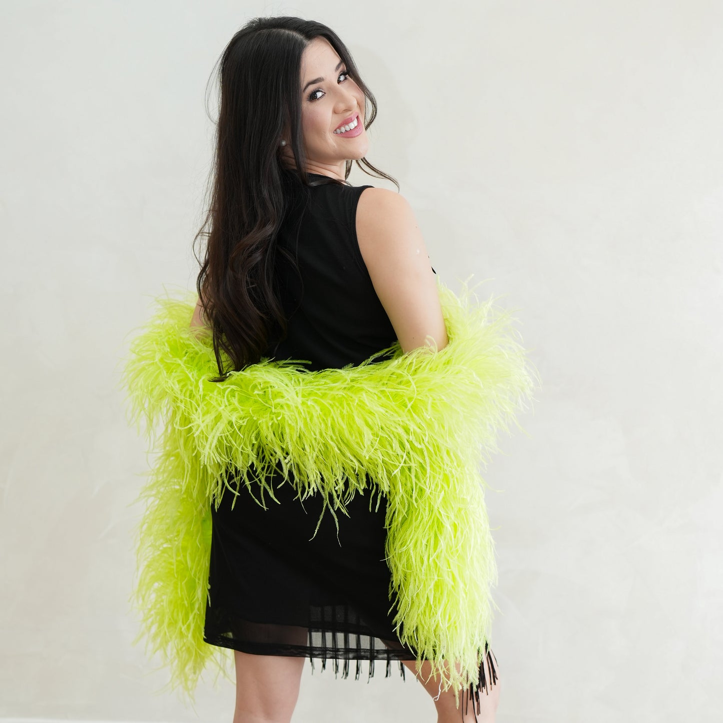 This neon green ostrich feather boa has marabou feathers with six layers of ostrich feathers sewn into it and measures approximately 6 feet long.. Our Zucker feather boa can be cut without unraveling as feathers are sewn on to a cotton cord. This ostrich boa is an ideal roaring 20s feather boa, perfect for a Great Gatsby theme party, as a fashion accessory or added as garland in home decor.