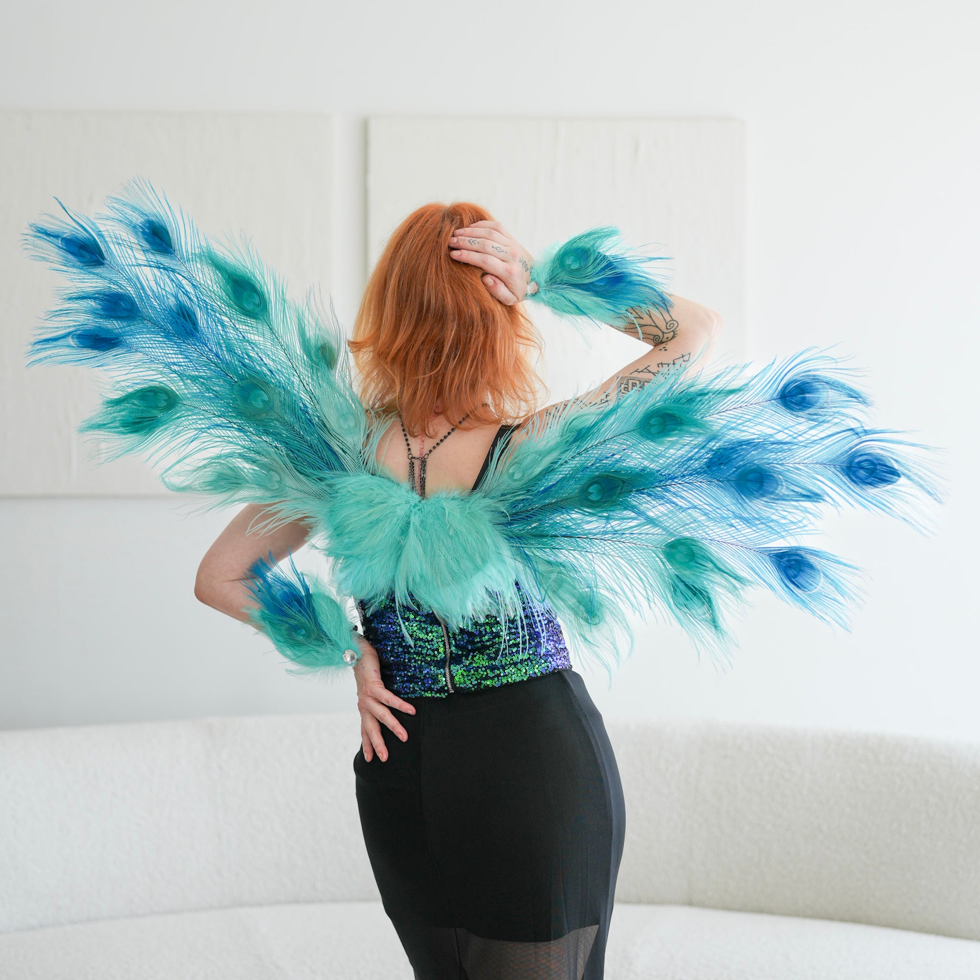 CUSTOM MADE TO ORDER : Step into fantasy with these enchanting handmade wings, crafted from genuine peacock feathers for a look that’s bold, mystical, and unforgettable. Lightweight yet dramatic, they’re perfect for Halloween costumes, cosplay, masquerade parties, festivals, or magical photo shoots. Stunningly versatile—these Peacock Wings measure approximately 12x47" in Medium and 12x35" in Small and double as a feather bustle! Matching feather cuffs also included to complete the set.