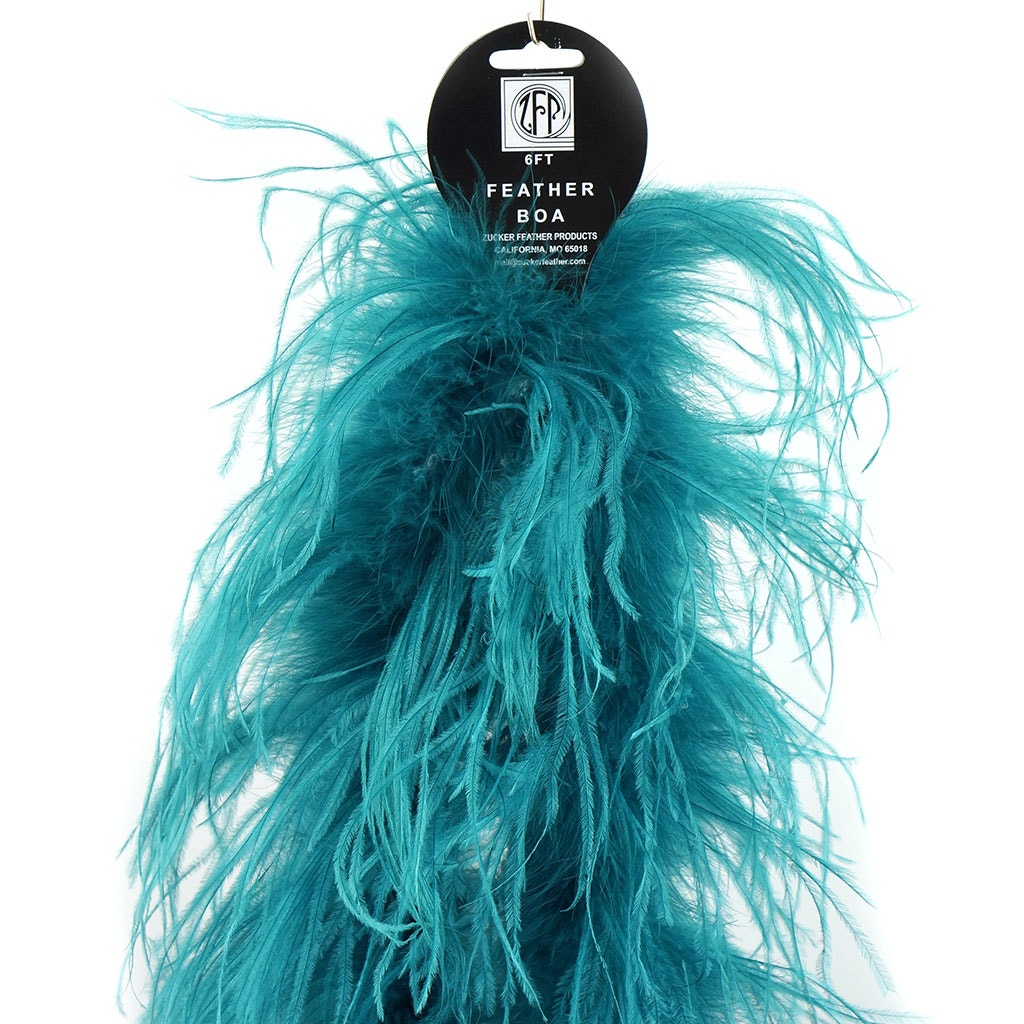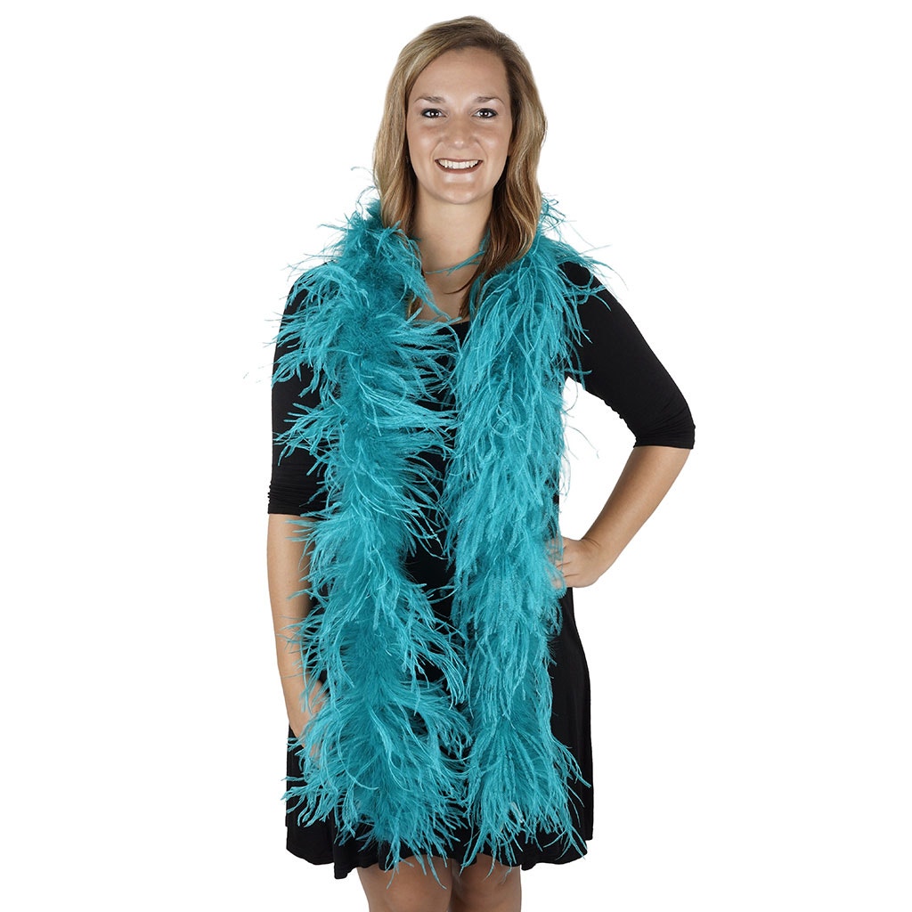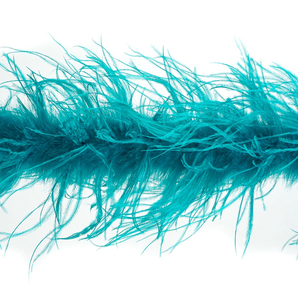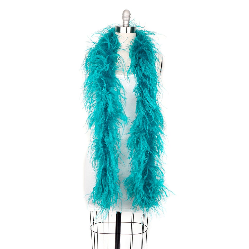 This dark aqua ostrich feather boa has marabou feathers with two layers of ostrich feathers sewn into it and measures 6 feet long by approximately 9" in diameter. Our Zucker feather boa can be cut without unraveling as feathers are sewn on to a cotton cord. This ostrich boa is an ideal roaring 20s feather boa, perfect for a Great Gatsby theme party.