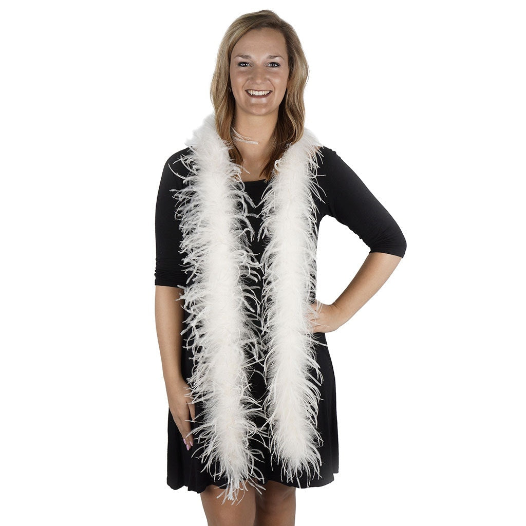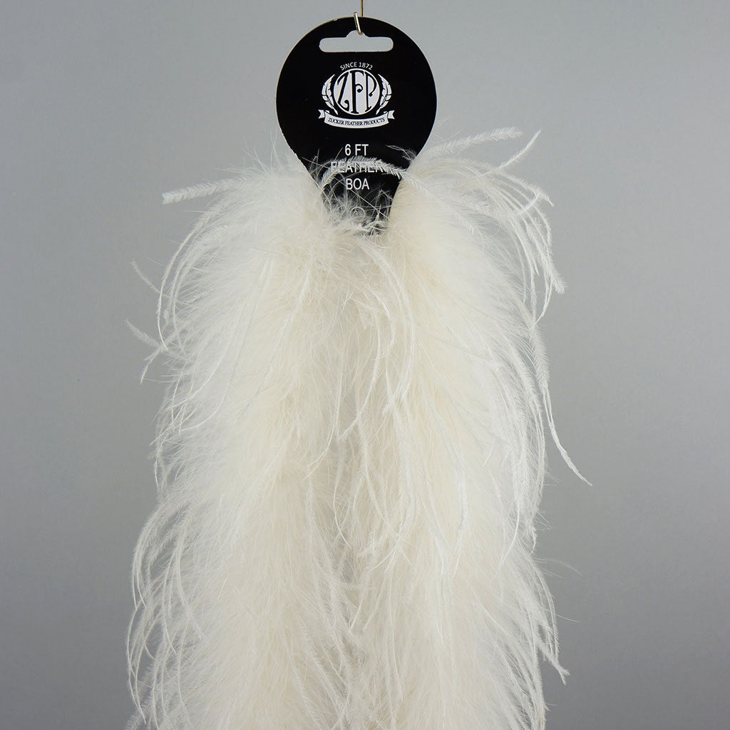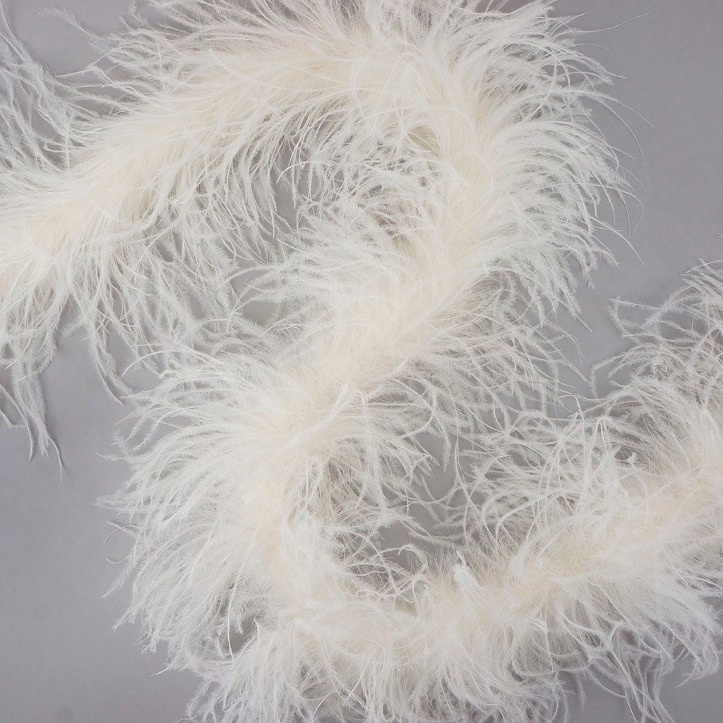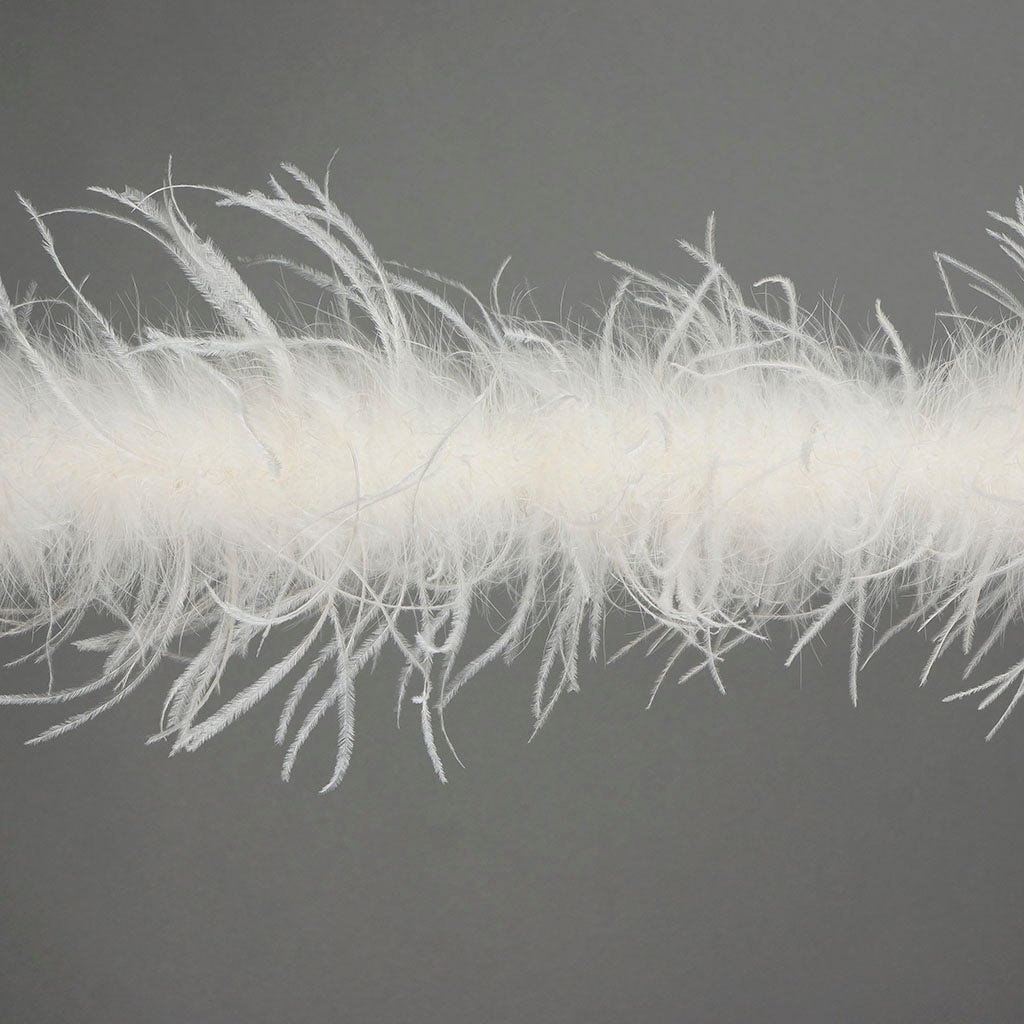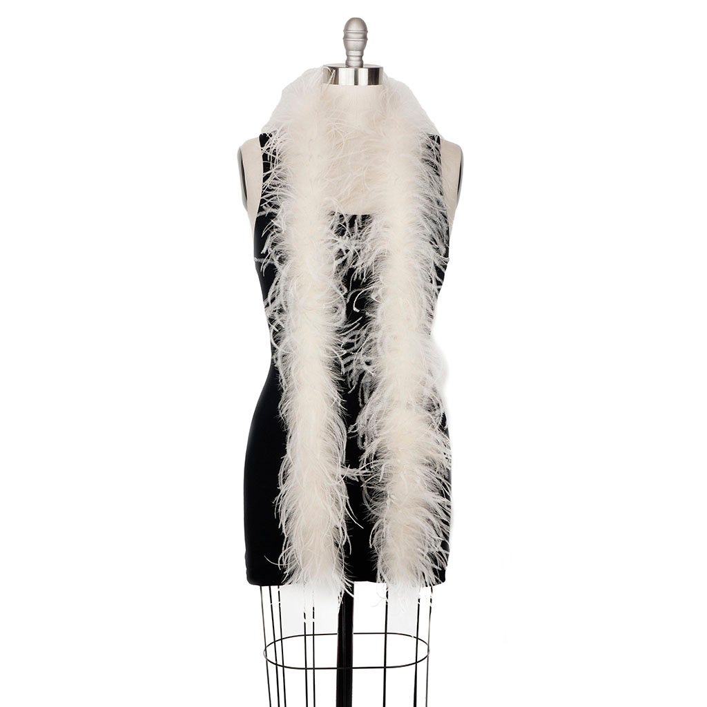 This ivory ostrich feather boa has marabou feathers with one layer of short ostrich feathers sewn into it. It is approximately 6 feet long and 9" in diameter. Our Zucker feather boa can be cut without unraveling as feathers are sewn on to a cotton cord.