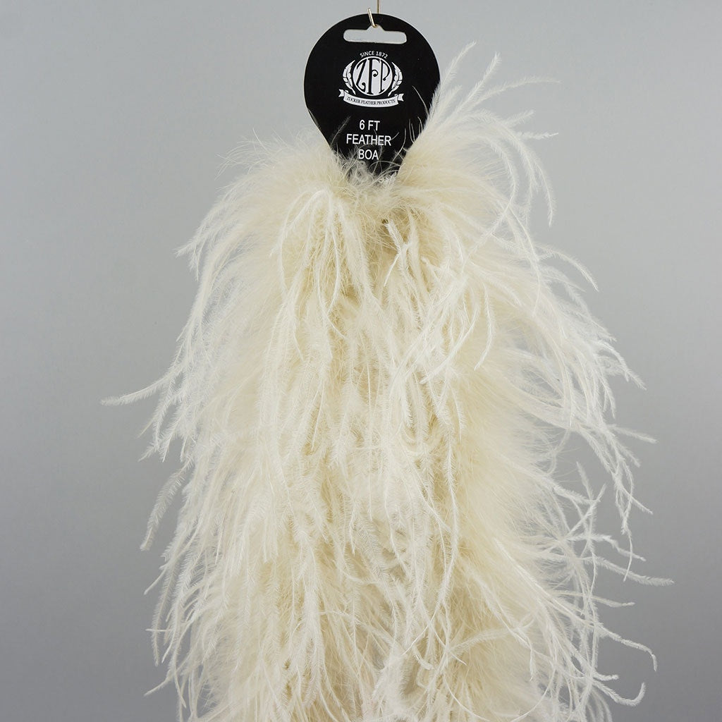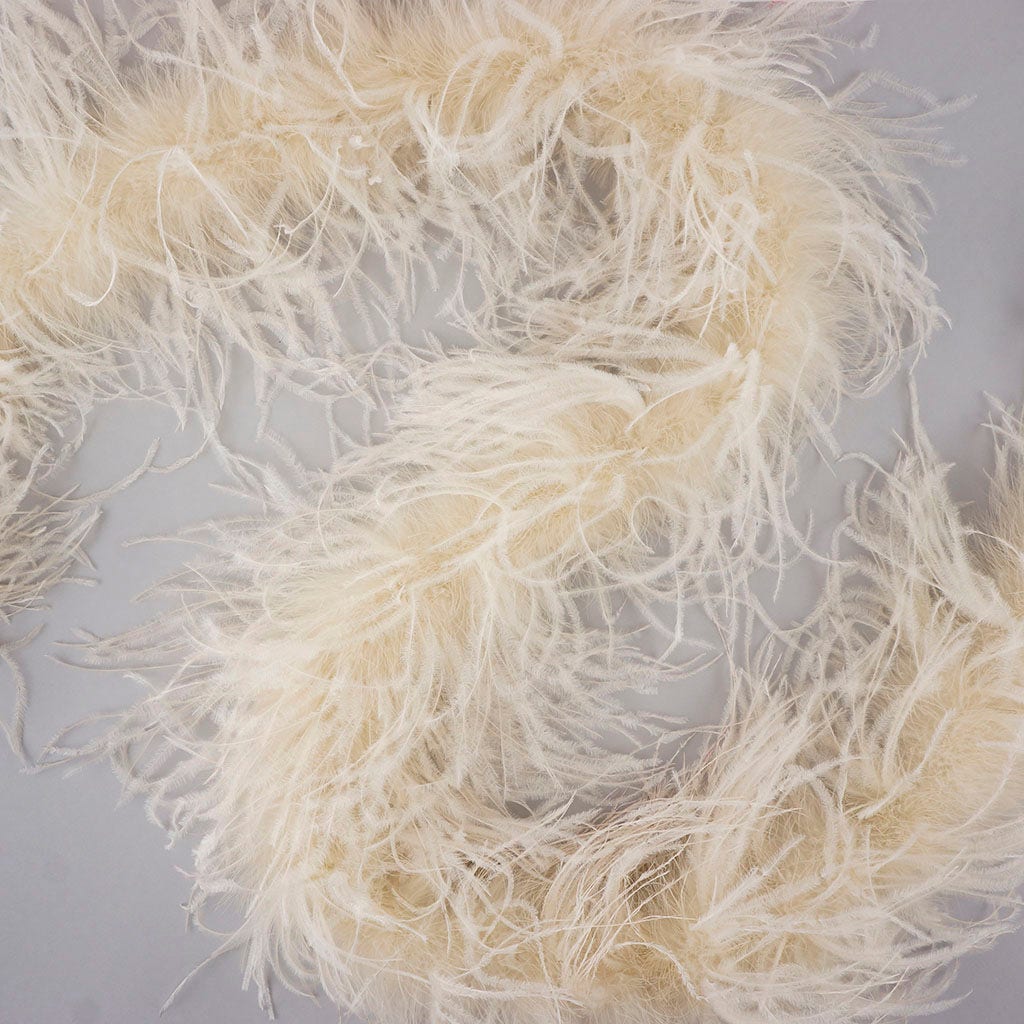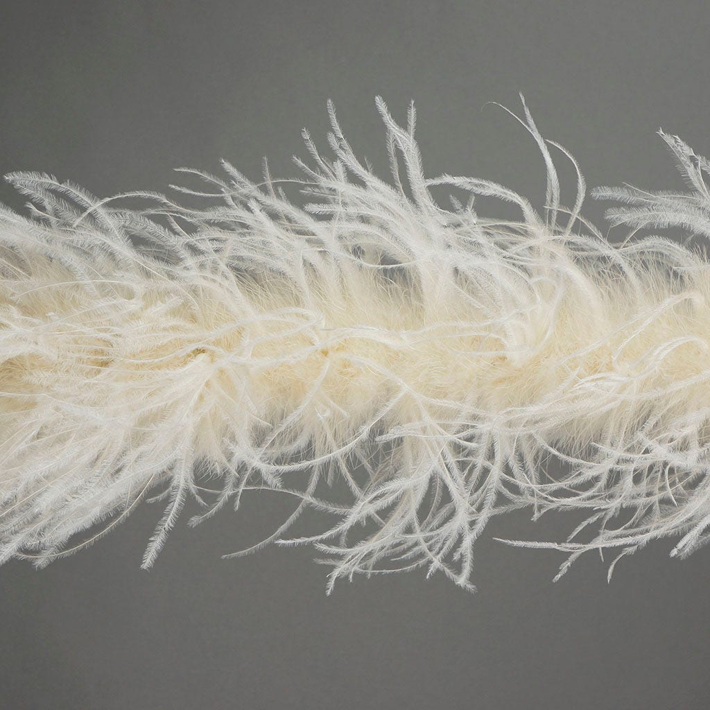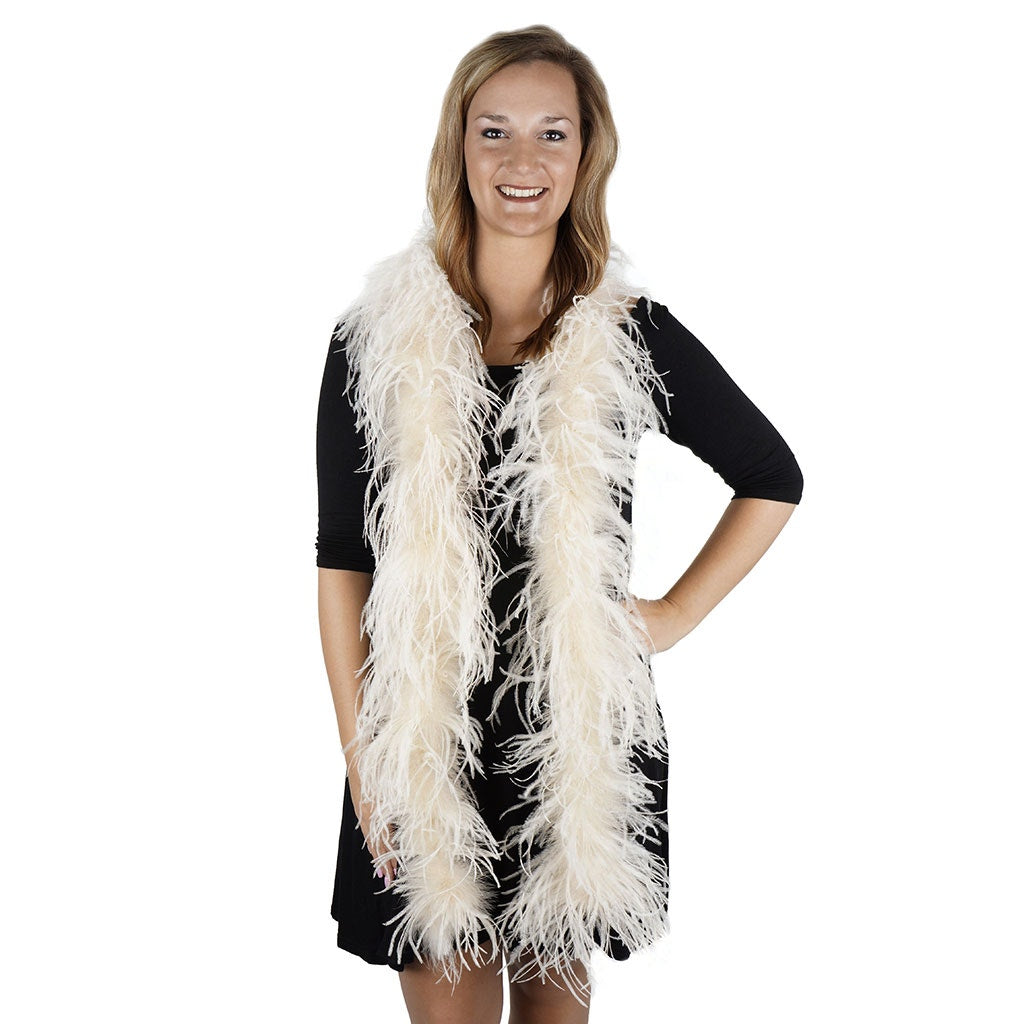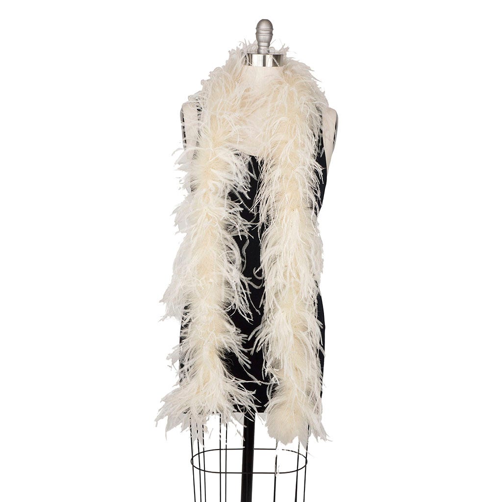 This ivory ostrich feather boa has marabou feathers with two layers of ostrich feathers sewn into it and measures 6 feet long by approximately 9" in diameter. Our Zucker feather boa can be cut without unraveling as feathers are sewn on to a cotton cord. This ostrich boa is an ideal roaring 20s feather boa, perfect for a Great Gatsby theme party.