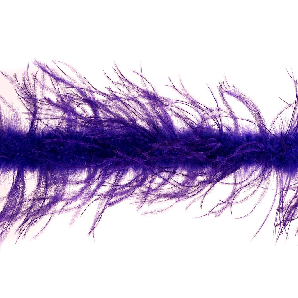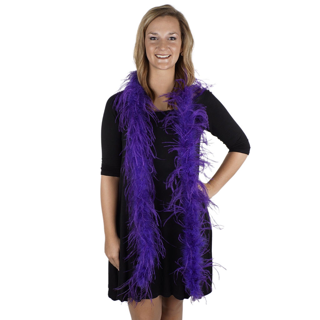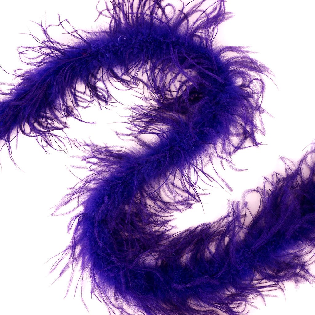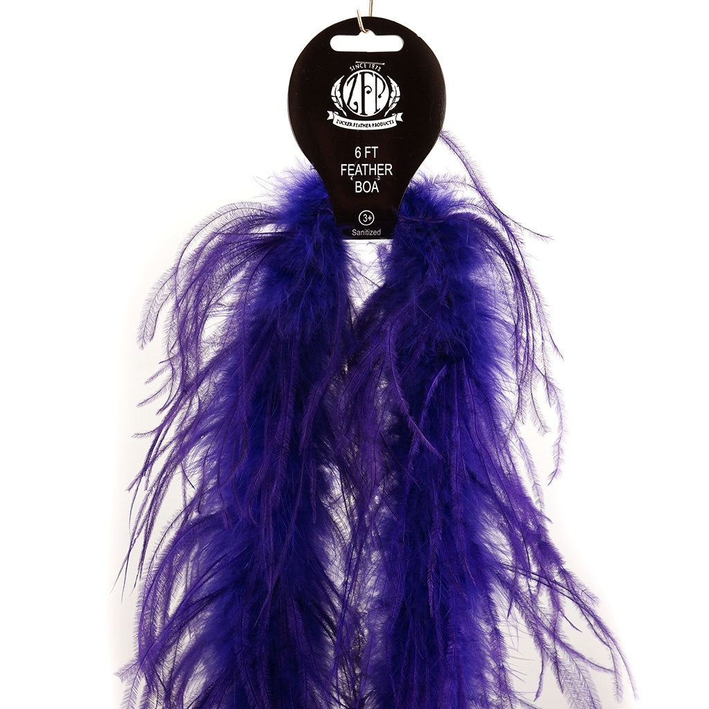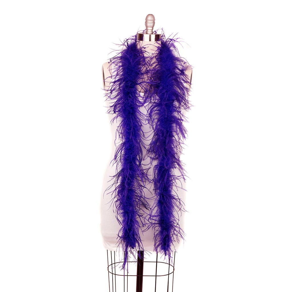 This purple ostrich feather boa has marabou feathers with one layer of short ostrich feathers sewn into it. It is approximately 6 feet long and 9" in diameter. Our Zucker feather boa can be cut without unraveling as feathers are sewn on to a cotton cord.