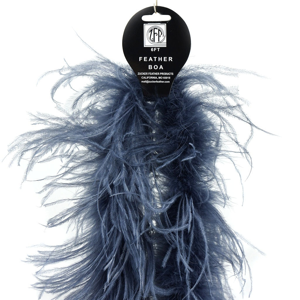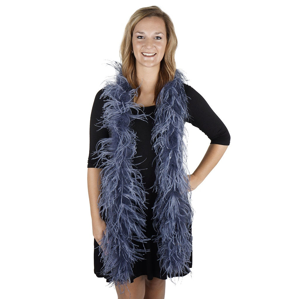 This blue ostrich feather boa has marabou feathers with two layers of ostrich feathers sewn into it and measures 6 feet long by approximately 9" in diameter. Our Zucker feather boa can be cut without unraveling as feathers are sewn on to a cotton cord. This ostrich boa is an ideal roaring 20s feather boa, perfect for a Great Gatsby theme party.