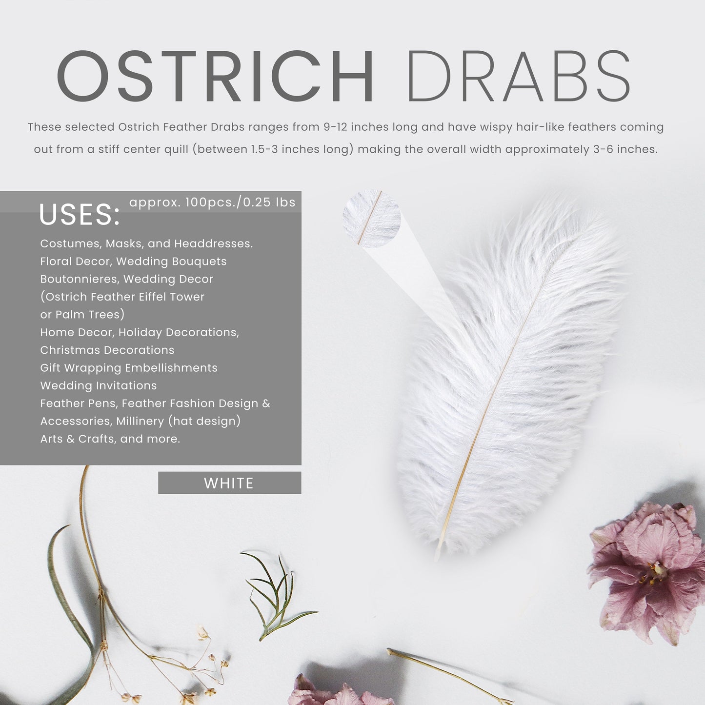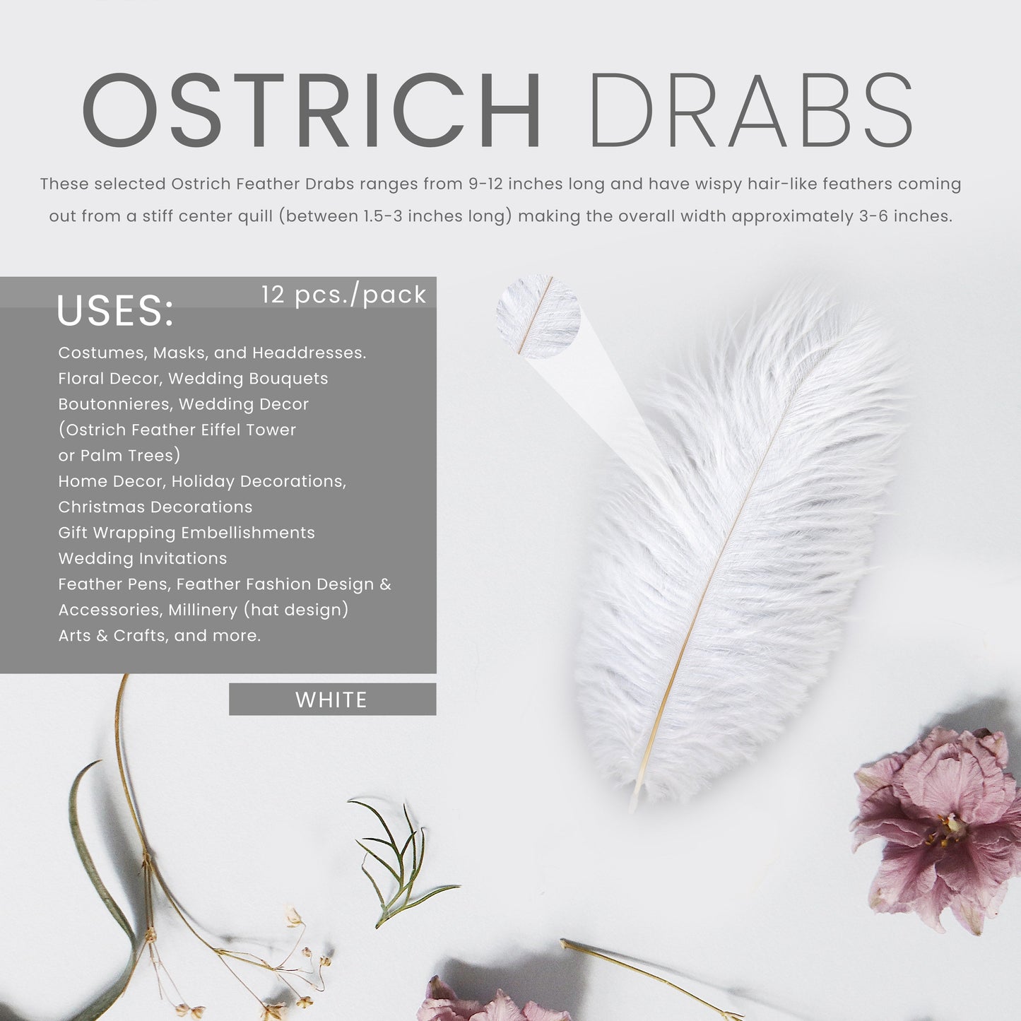Ostrich Drabs are approximately 9-12" long. The 1 piece and 12 piece packages are hand selected. The 1/4 lb ostrich feathers bulk contain approximately 100 pieces, non-selected.