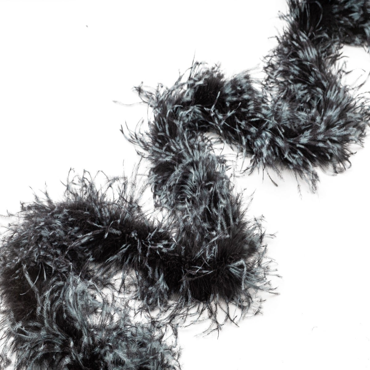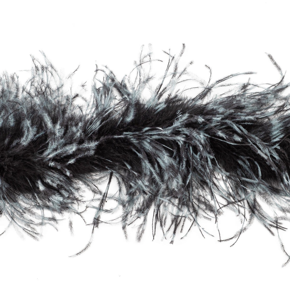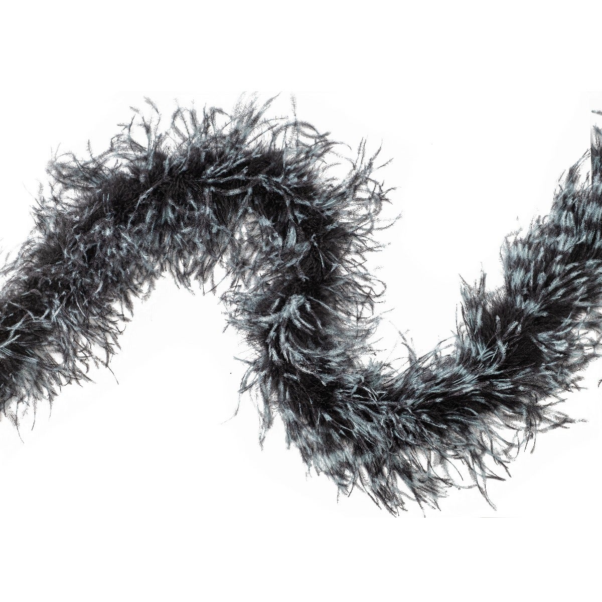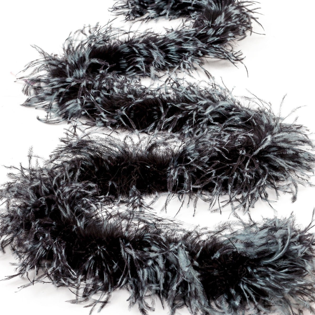 This black and mint green ostrich feather boa has marabou feathers with two layers of ostrich feathers sewn into it and measures 6 feet long by approximately 9" in diameter. The stenciled ostrich feathers sewn into this luxurious ostrich feather boa are done through a unique dyeing process that originated in Paris that makes the feathers appear striped with two colors to give it a unique look. Our Zucker feather boa can be cut without unraveling as feathers are sewn on to a cotton cord. This ostrich boa is an ideal roaring 20s feather boa, perfect for a Great Gatsby theme party.