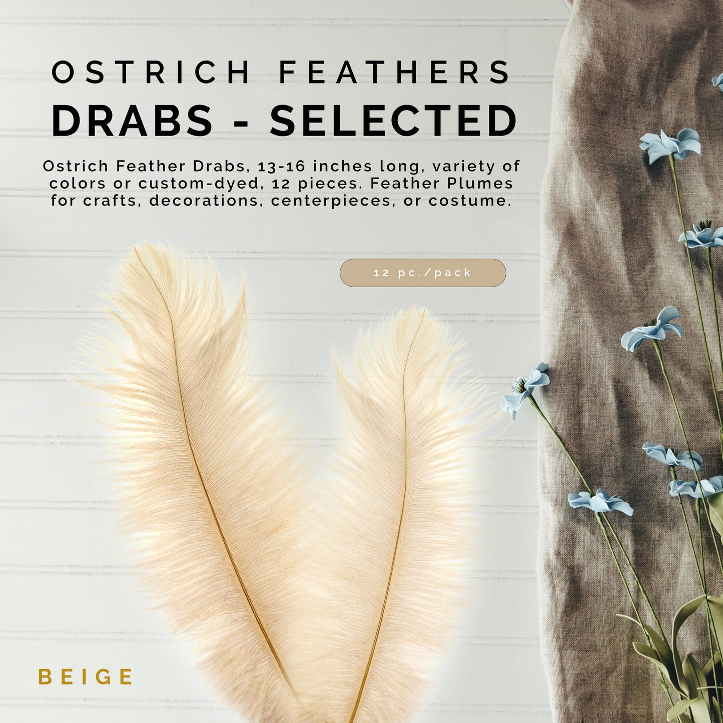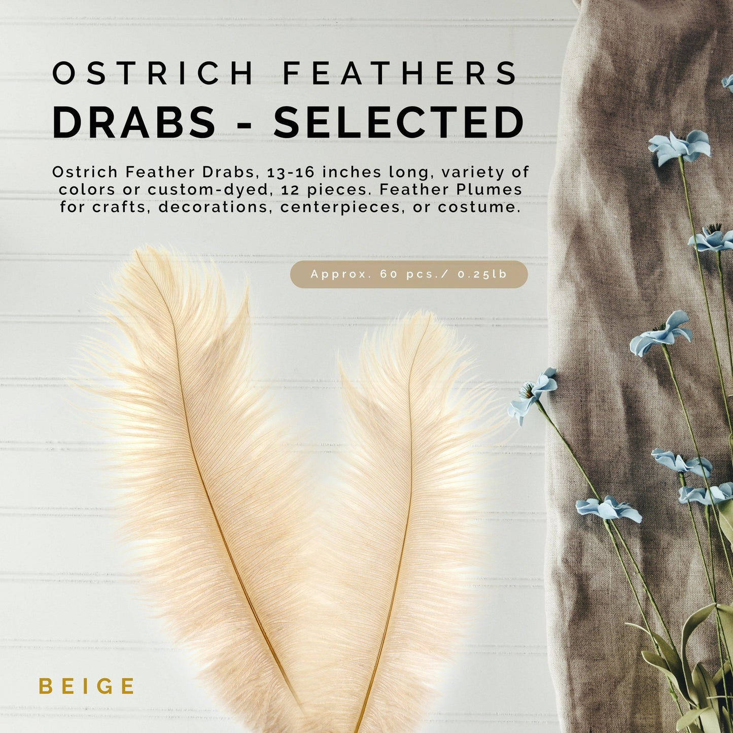 Ostrich Drabs are approximately 13-16" long. The 1 piece and 12 piece packages are hand selected. The 25 piece packages are bulk, non selected and 1/4 lb ostrich feathers bulk contain approximately 60 pieces, non-selected.