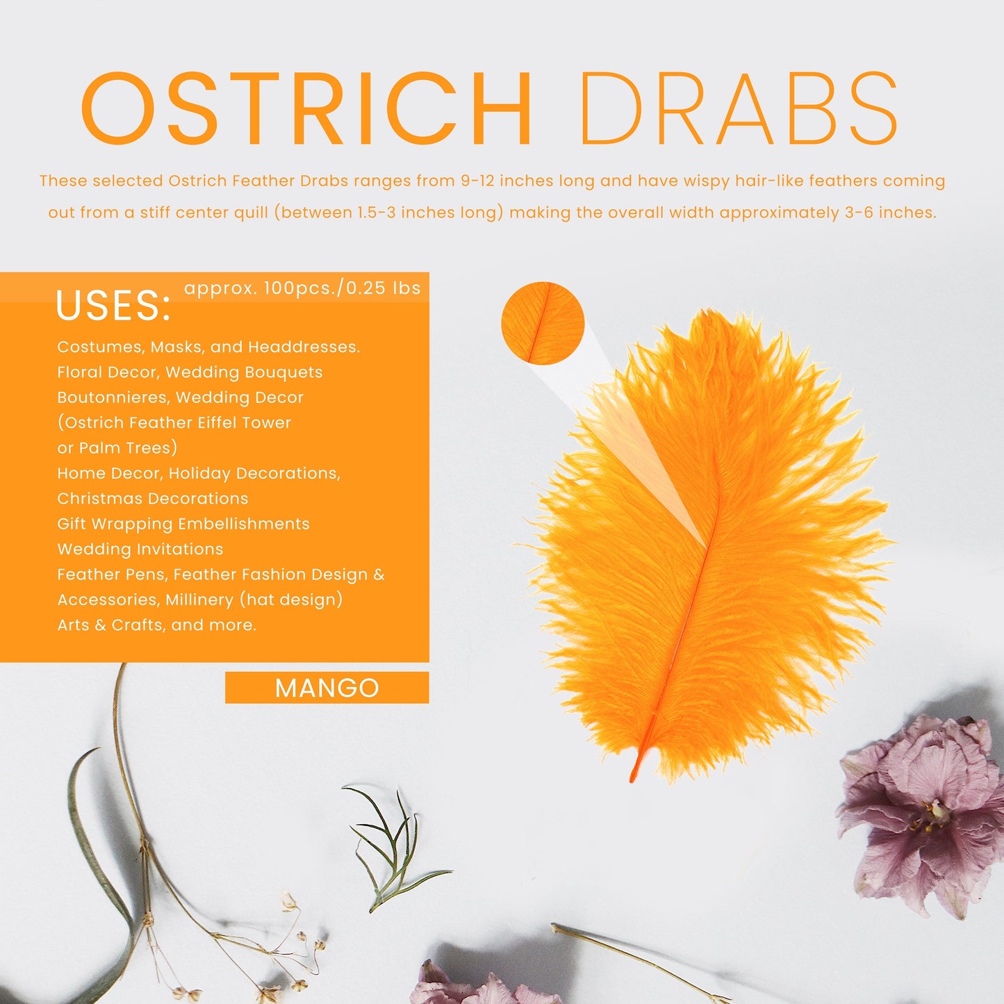 Ostrich Drabs are approximately 9-12" long. The 1 piece and 12 piece packages are hand selected. The 1/4 lb ostrich feathers bulk contain approximately 100 pieces, non-selected.