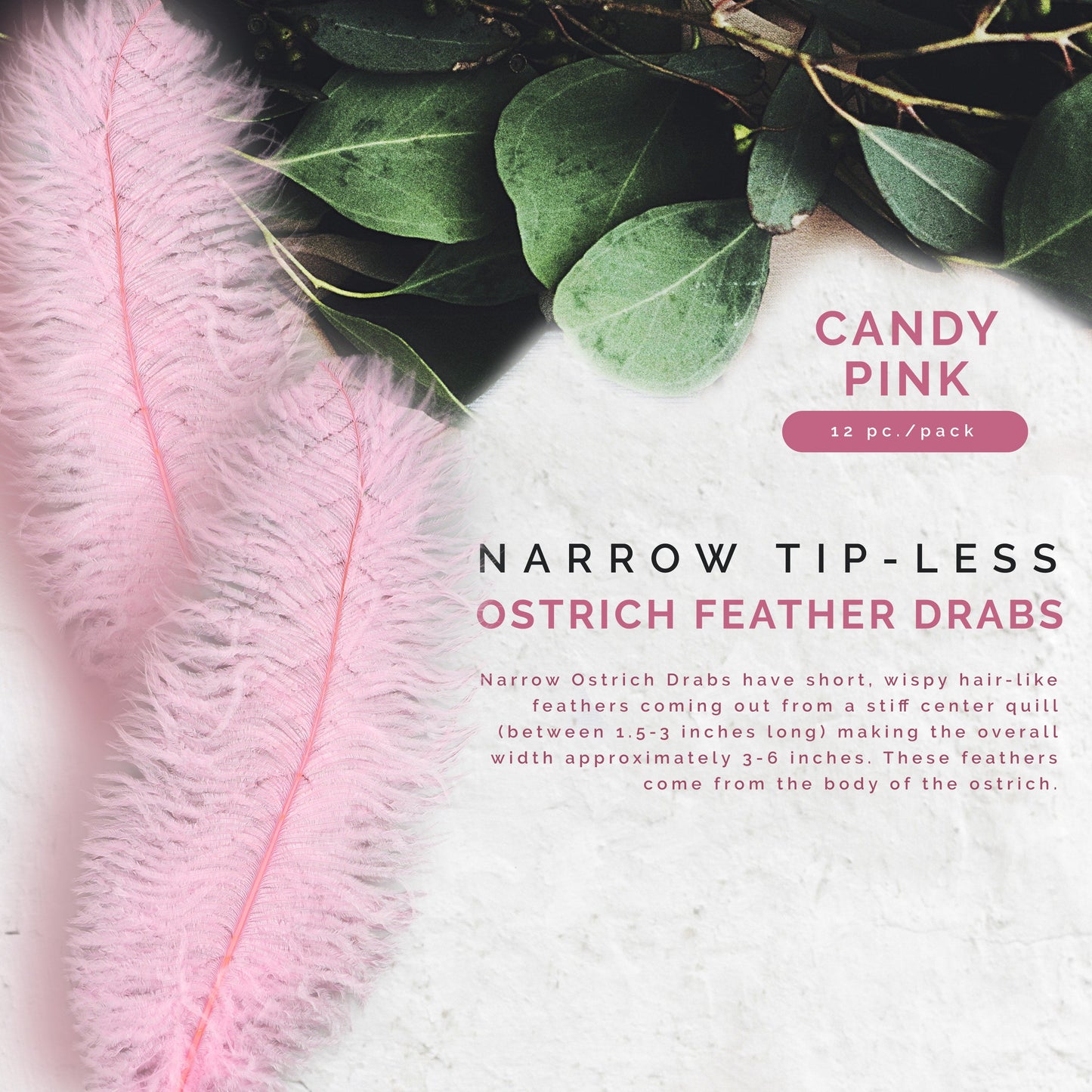 Narrow Tip-less Ostrich Feather Drabs range in size from 15-18 inches long and come in a variety of colors for all of your projects. OP18N Narrow Ostrich Drabs have short, wispy hair-like feathers coming out from a stiff center quill (between 1.5-3 inches long) making the overall width approximately 3-6 inches. These feathers come from the body of the ostrich. Purchasing Ostrich Feathers by the dozen are selected for quality and size.
