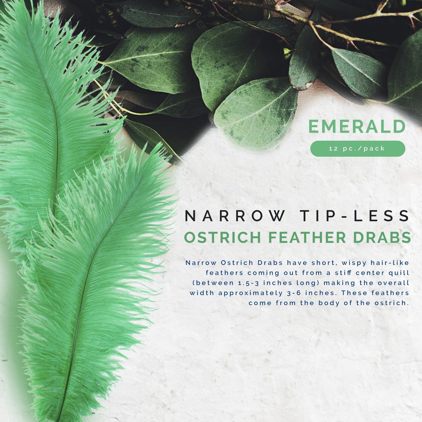 Narrow Tip-less Ostrich Feather Drabs range in size from 15-18 inches long and come in a variety of colors for all of your projects. OP18N Narrow Ostrich Drabs have short, wispy hair-like feathers coming out from a stiff center quill (between 1.5-3 inches long) making the overall width approximately 3-6 inches. These feathers come from the body of the ostrich. Purchasing Ostrich Feathers by the dozen are selected for quality and size.