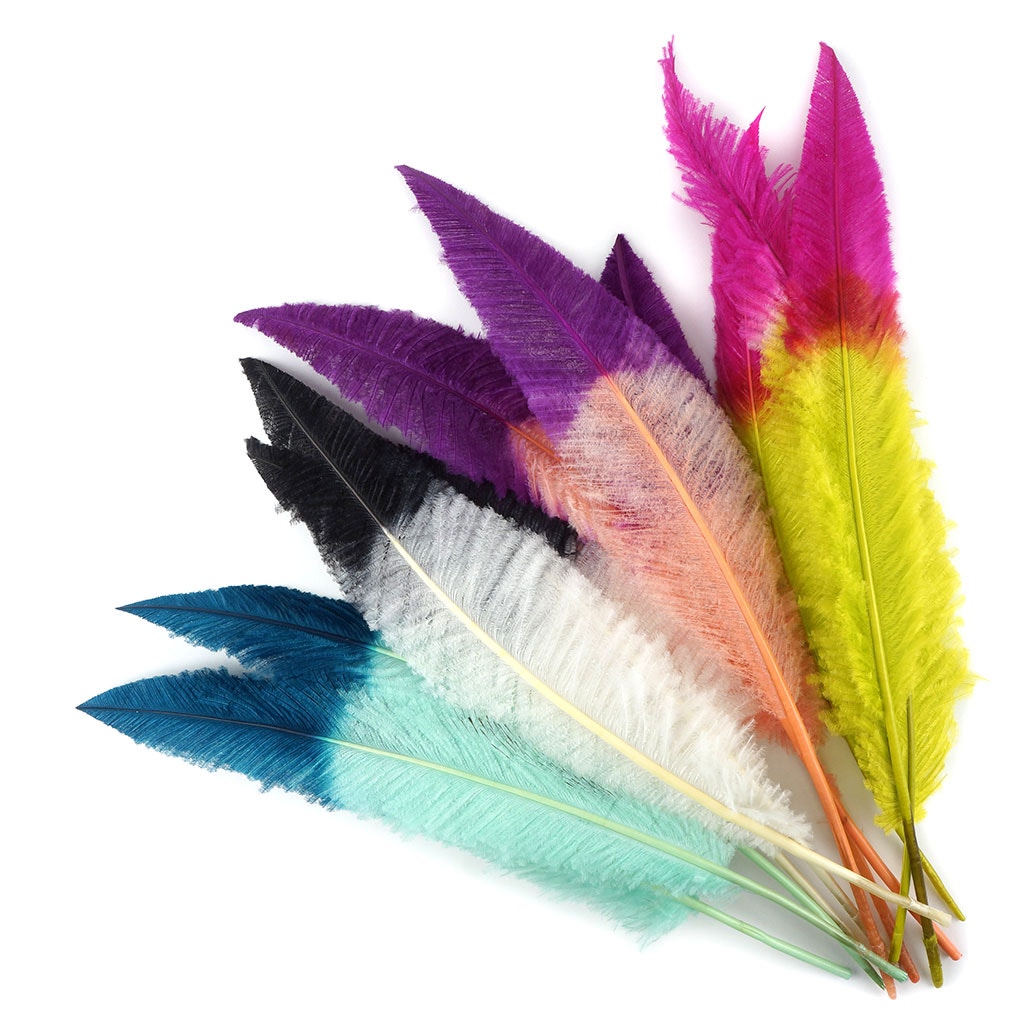 Ostrich Feathers Tipped Selected Nandus range in size from 13-24 inches long and come in a 3 piece package. Ostrich Feathers by the dozen are selected for quality and size and are available in a variety of colors for all of your projects. These unique feathers are Ostrich Spads that have been trimmed, resulting in a narrow feather that comes to a point with a different color tip. Ostrich Nandu feathers are ostrich body feathers.