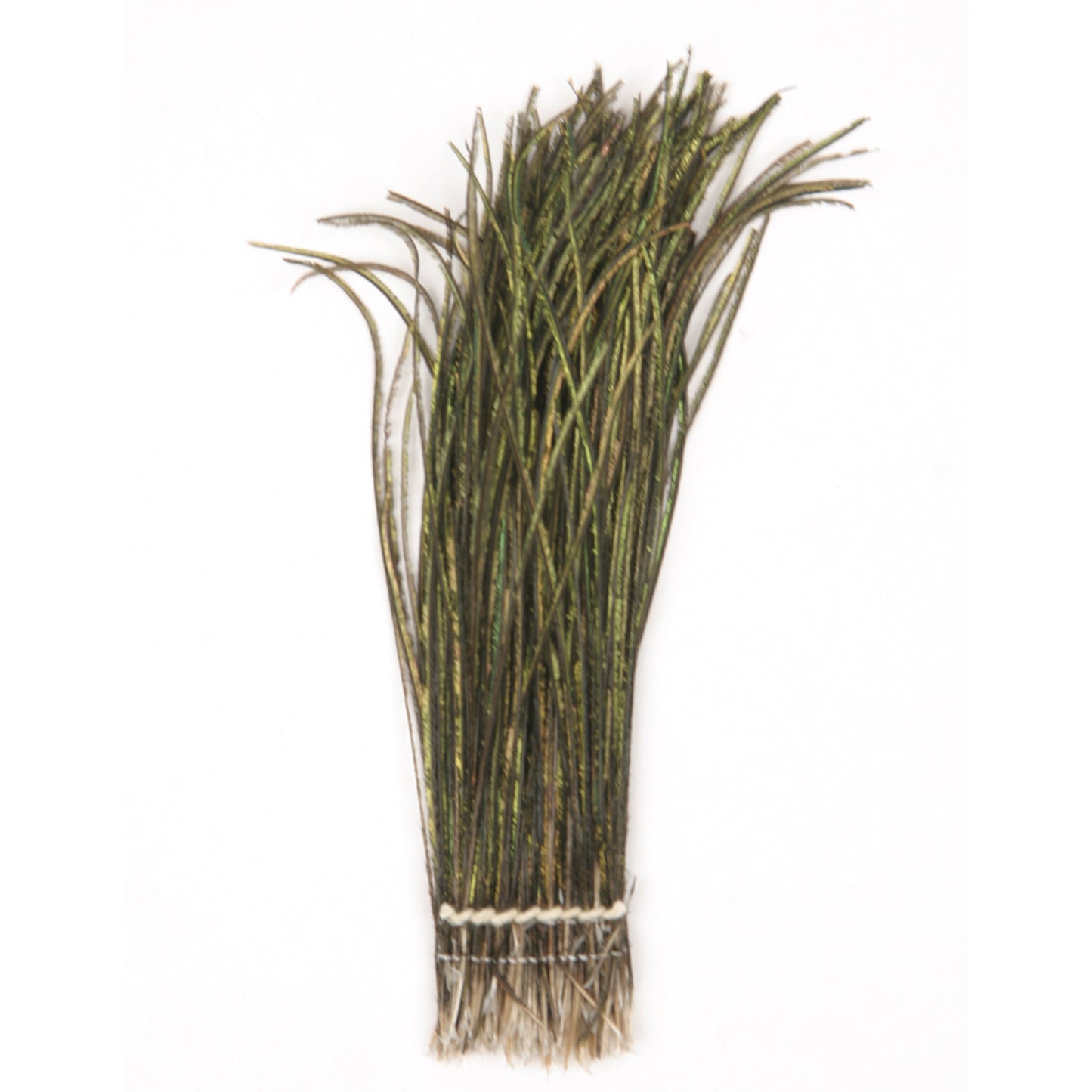 Strung Natural Peacock Flue Feathers are 4-6 inches long and come in a .5 gram package. These feathers are strung (sewn) together near the tip of the quill in a .50 inch package.