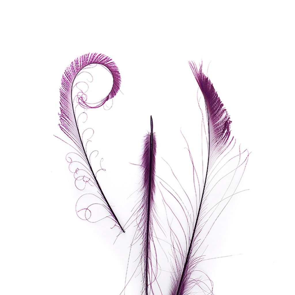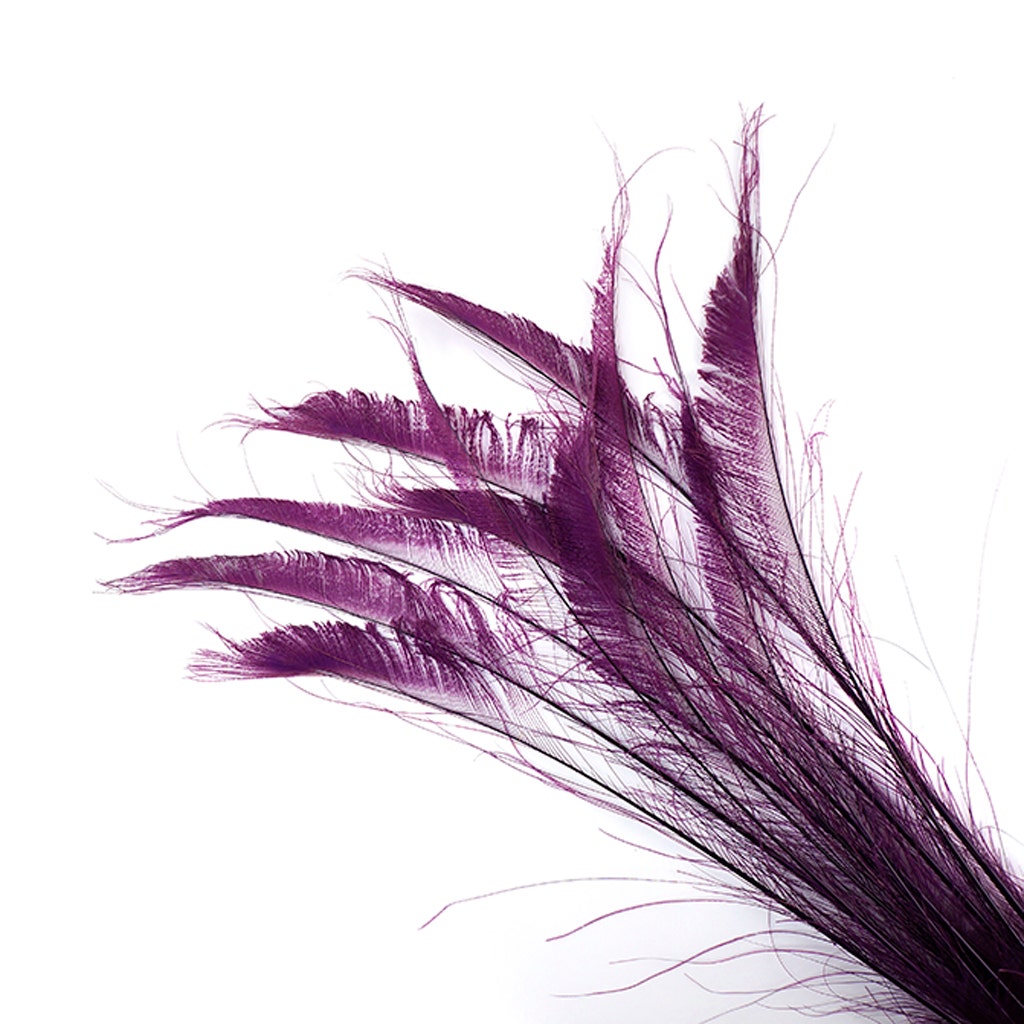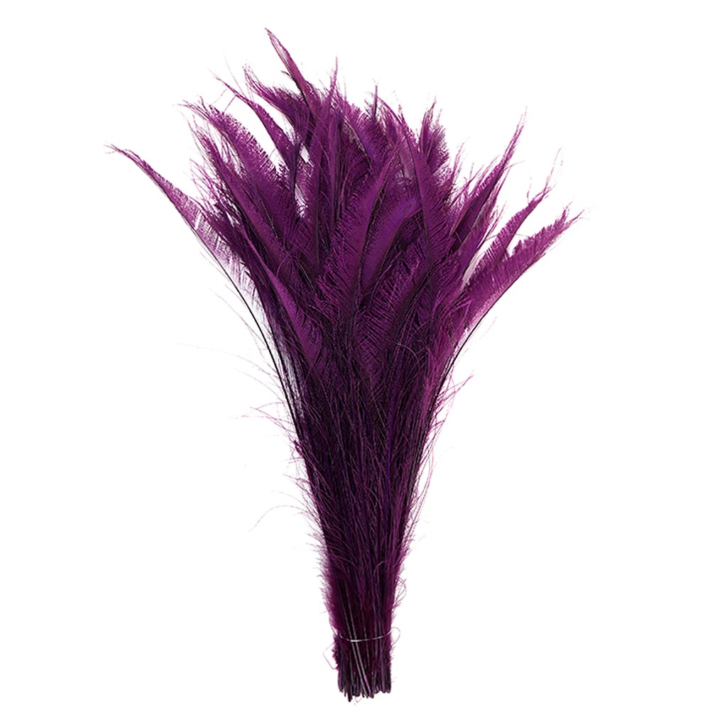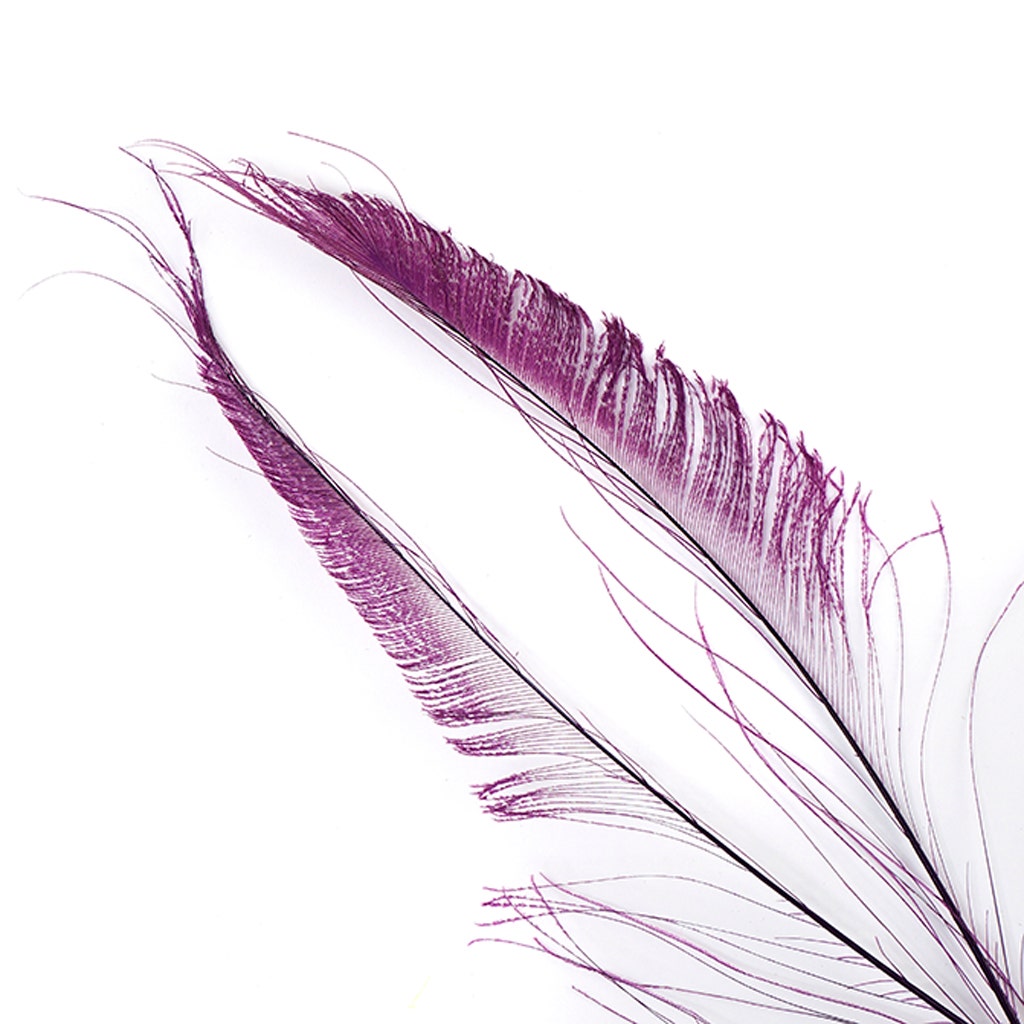 Bleached and Dyed Peacock Sword-Tail Feathers will range from 15-25 inches long and are dyed in vibrant solid colors all the way through the feather including the stem (quill). These Peacock Sword feathers are naturally curved, and have a blade-like shape with feathers extending from the right side of the quill. Peacock swords can be curled using scissors in the same manner as curling ribbon. This item is packaged with 100 pieces of both right and left side tail feathers. Mixed right and left sword tail packages are available in our Packaged Feather category in smaller quantities.