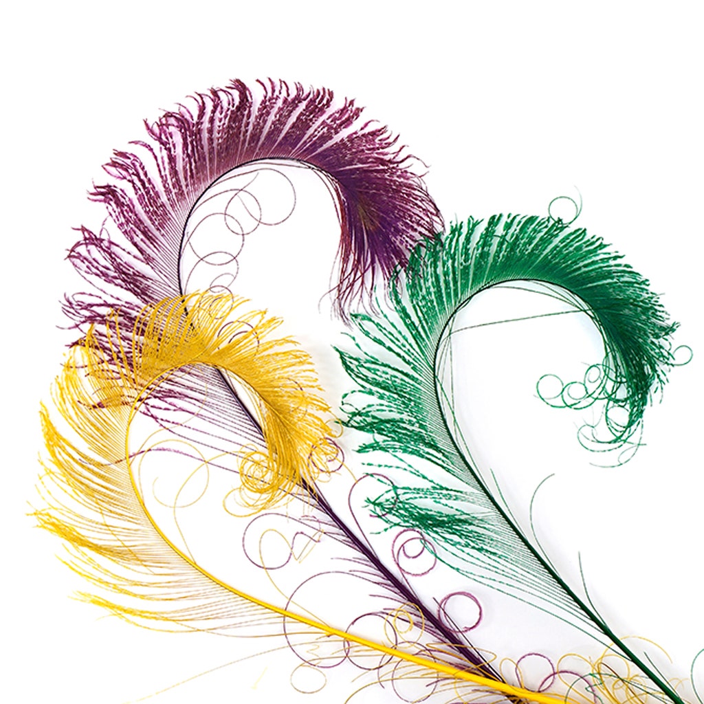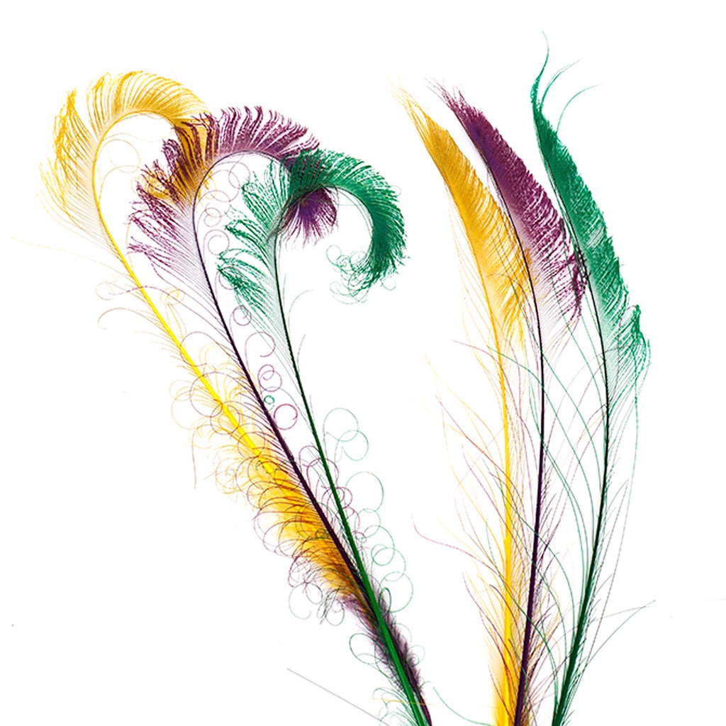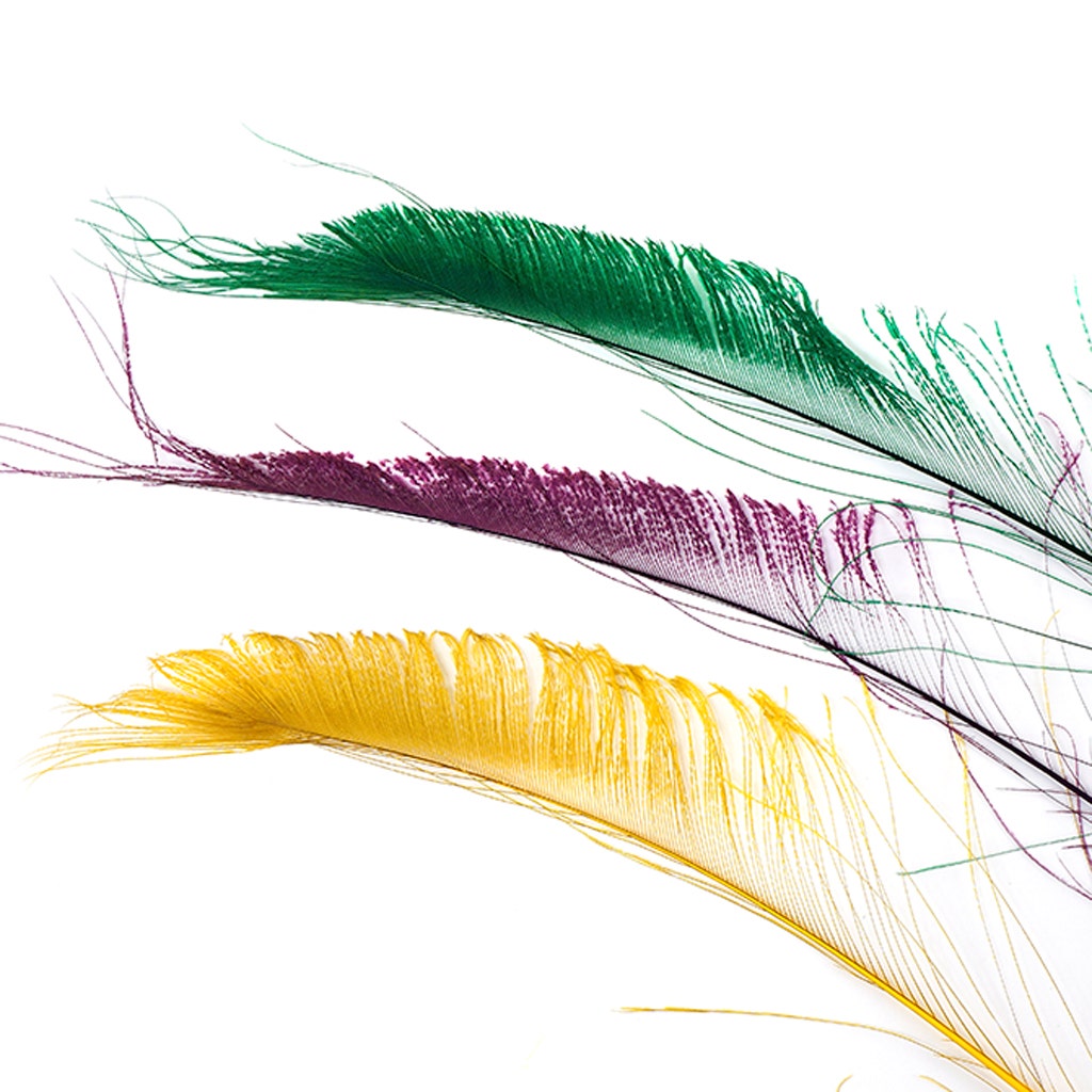 Mix-Colored Bleached and Dyed Peacock Sword-Tail Feathers will range from 25-40 inches long and are dyed in vibrant solid colors all the way through the feather including the stem (quill). These Peacock Sword feathers are naturally curved, and have a blade-like shape with feathers extending from the right side of the quill. Peacock swords can be curled using scissors in the same manner as curling ribbon. This item is packaged with 100 multi-colored pieces of both right and left side tail feathers. Mixed right and left sword tail packages are available in our Packaged Feather category in smaller quantities.