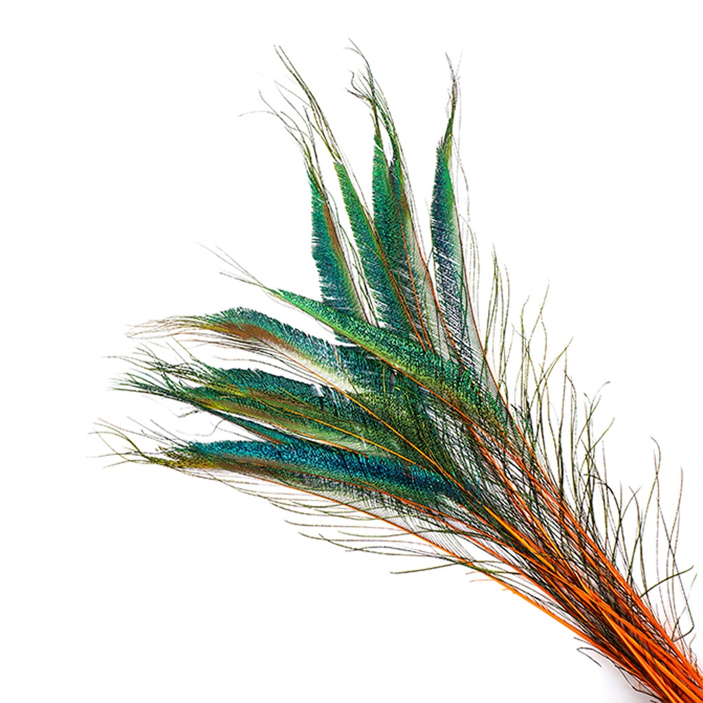 Stem Dyed Peacock Sword-Tail Feathers will range from 25-40 inches long will have natural iridescent hues of green, blue and gold, along with subtle hints of the color it has been dyed. The stem, or quill of these feathers will be dyed in a vibrant solid color. These Peacock Sword feathers are naturally curved, and have a blade-like shape with feathers extending from the right side of the quill. Peacock swords can be curled using scissors in the same manner as curling ribbon. This item is packaged with 100 pieces of both right and left side tail feathers. Mixed right and left sword tail packages are available in our Packaged Feather category in smaller quantities.
