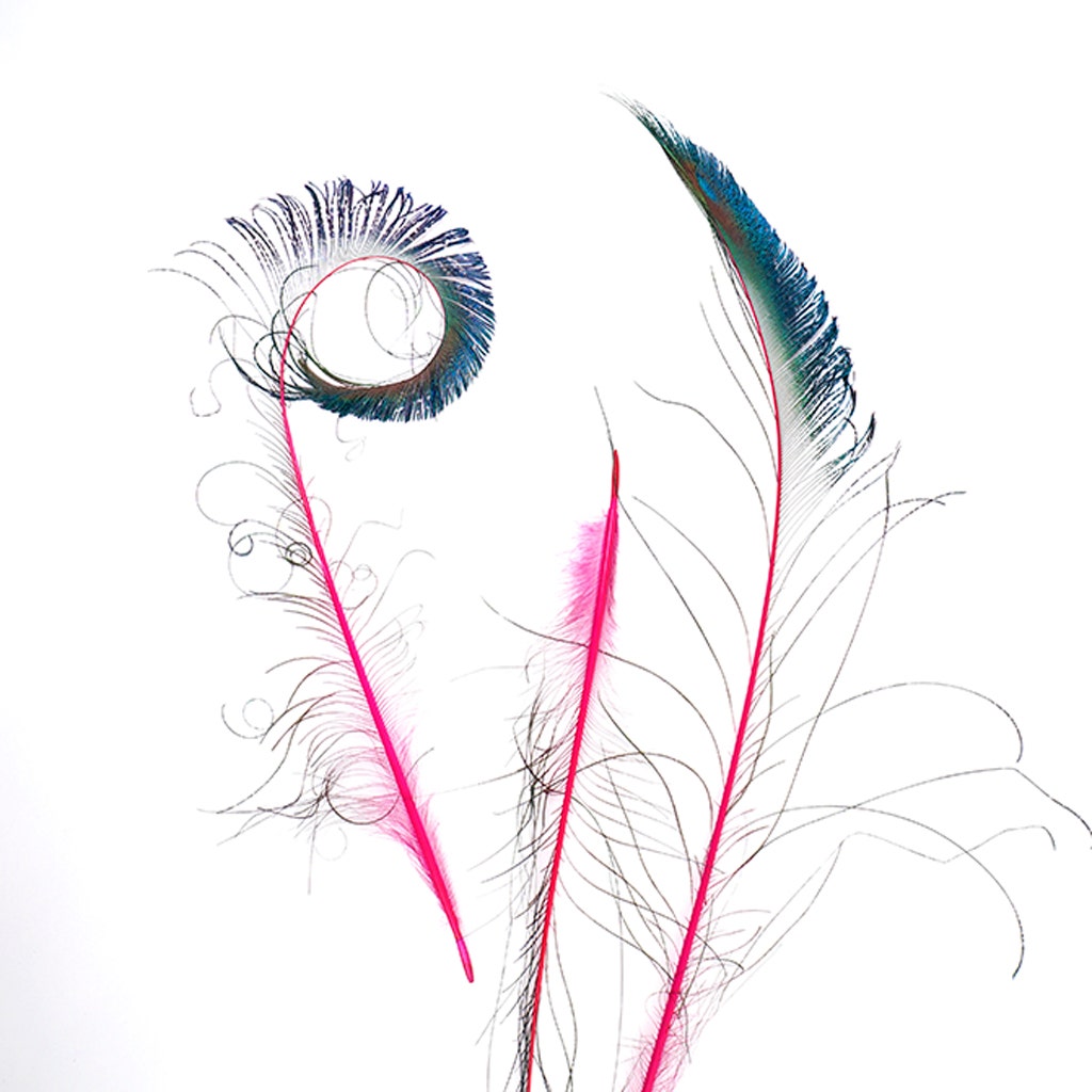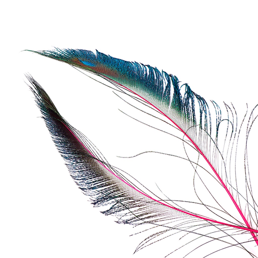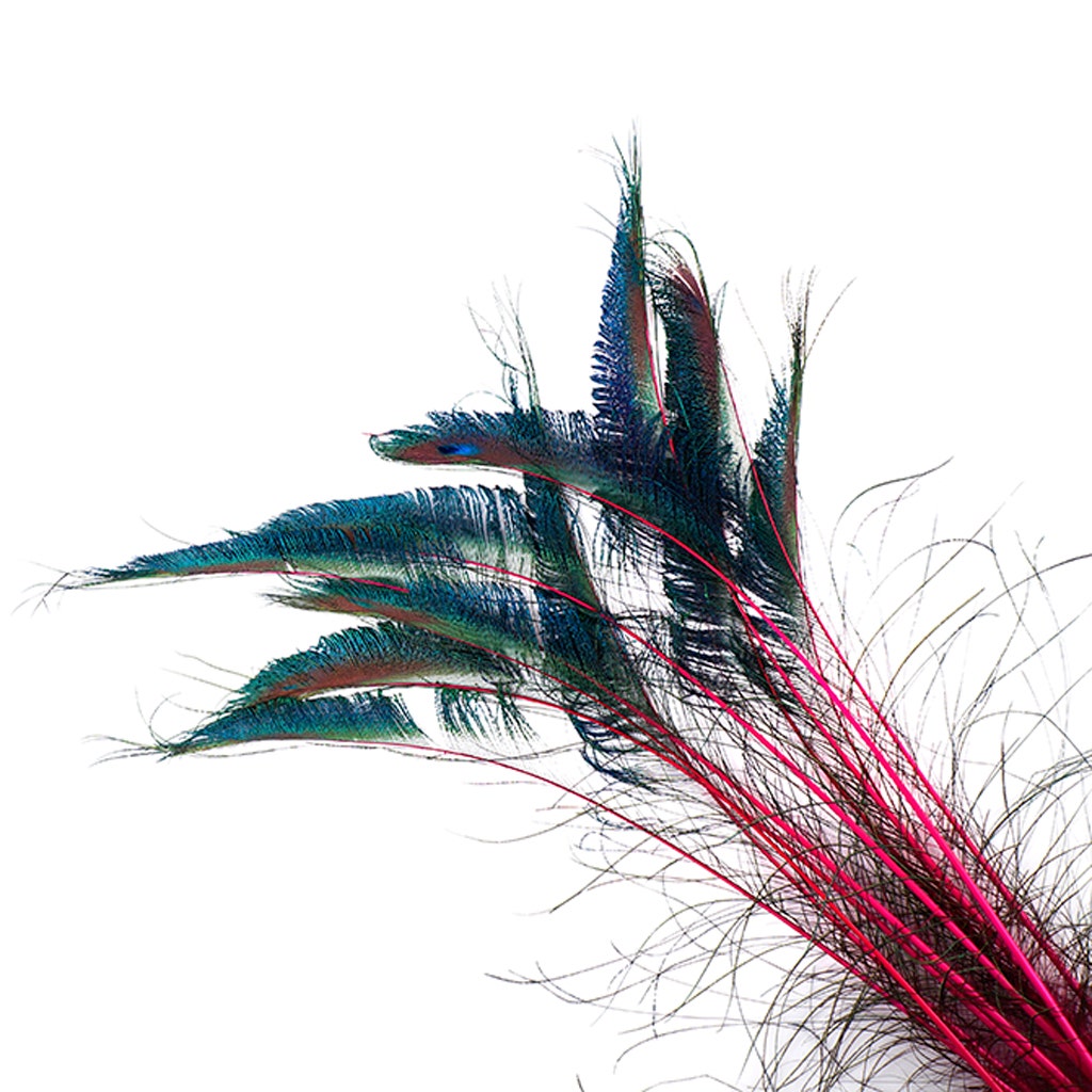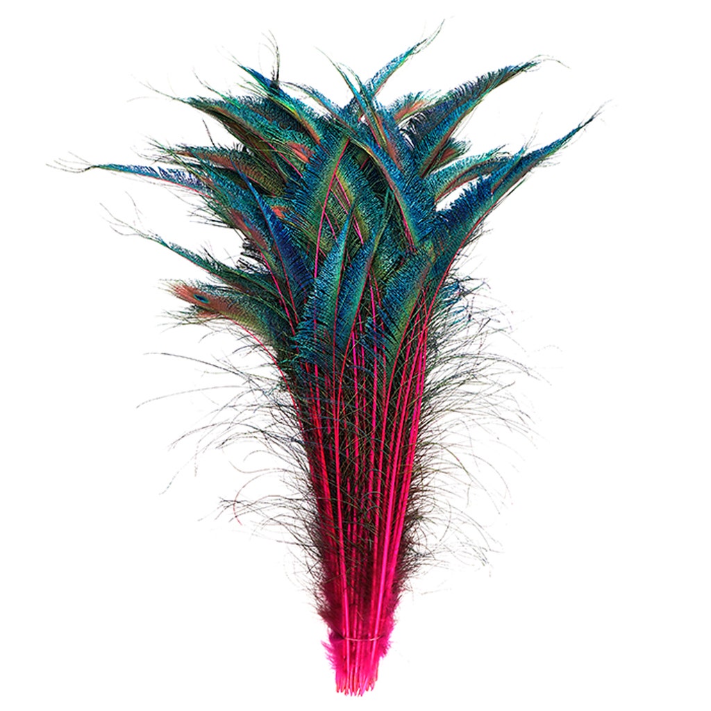 Stem Dyed Peacock Sword-Tail Feathers will range from 15-25 inches long will have natural iridescent hues of green, blue and gold, along with subtle hints of the color it has been dyed. The stem, or quill of these feathers will be dyed in a vibrant solid color. These Peacock Sword feathers are naturally curved, and have a blade-like shape with feathers extending from the right side of the quill. Peacock swords can be curled using scissors in the same manner as curling ribbon. This item is packaged with 100 pieces of both right and left side tail feathers. Mixed right and left sword tail packages are available in our Packaged Feather category in smaller quantities.