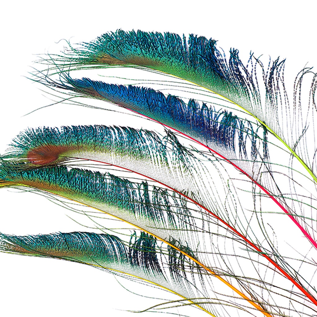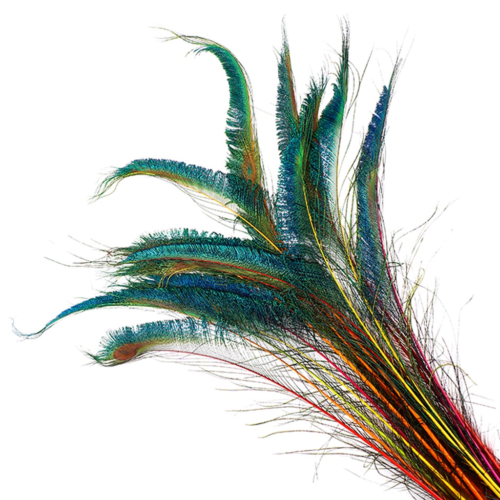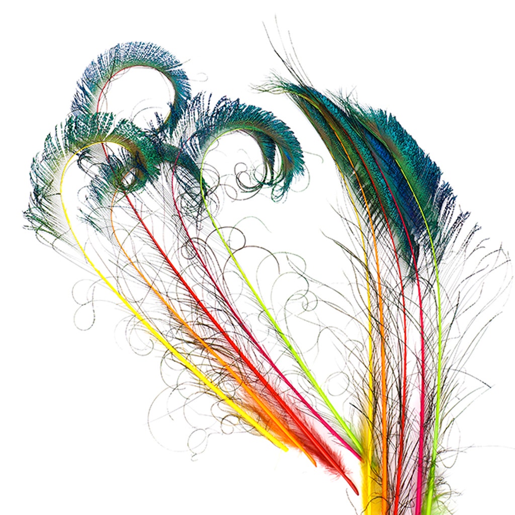 Mix-Colored Stem Dyed Peacock Sword-Tail Feathers will range from 25-40 inches long will have natural iridescent hues of green, blue and gold, along with subtle hints of the color it has been dyed. The stem, or quill of these feathers will be dyed in a vibrant solid color. These Peacock Sword feathers are naturally curved, and have a blade-like shape with feathers extending from the right side of the quill. Peacock swords can be curled using scissors in the same manner as curling ribbon. This item is packaged with 100 multi-colored pieces of both right and left side tail feathers. Mixed right and left sword tail packages are available in our Packaged Feather category in smaller quantities.