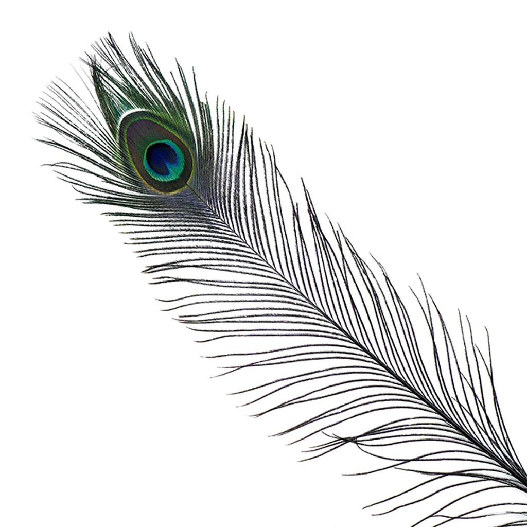 Stem Dyed Peacock Tail Feathers with Full Eyes 30-40 inches long are treated with dyes that stain the entire quill (stem), and amplify the natural iridescent hues of the peacock feathers. Although treated with dye, the original amber, green, purple, and blue colors of the peacock eye remain visible. The width of the full eyes including the surrounding hair-like flue will range 1.5-4.5 inches.
