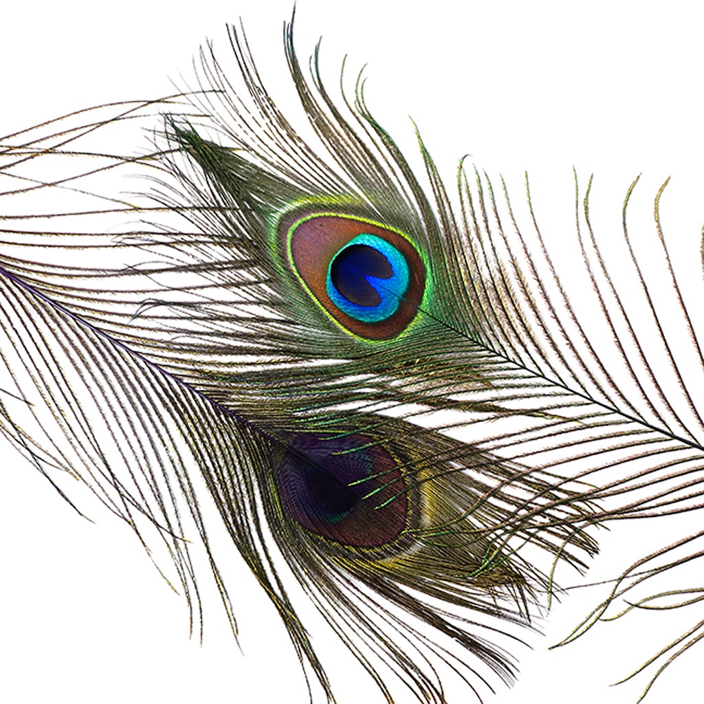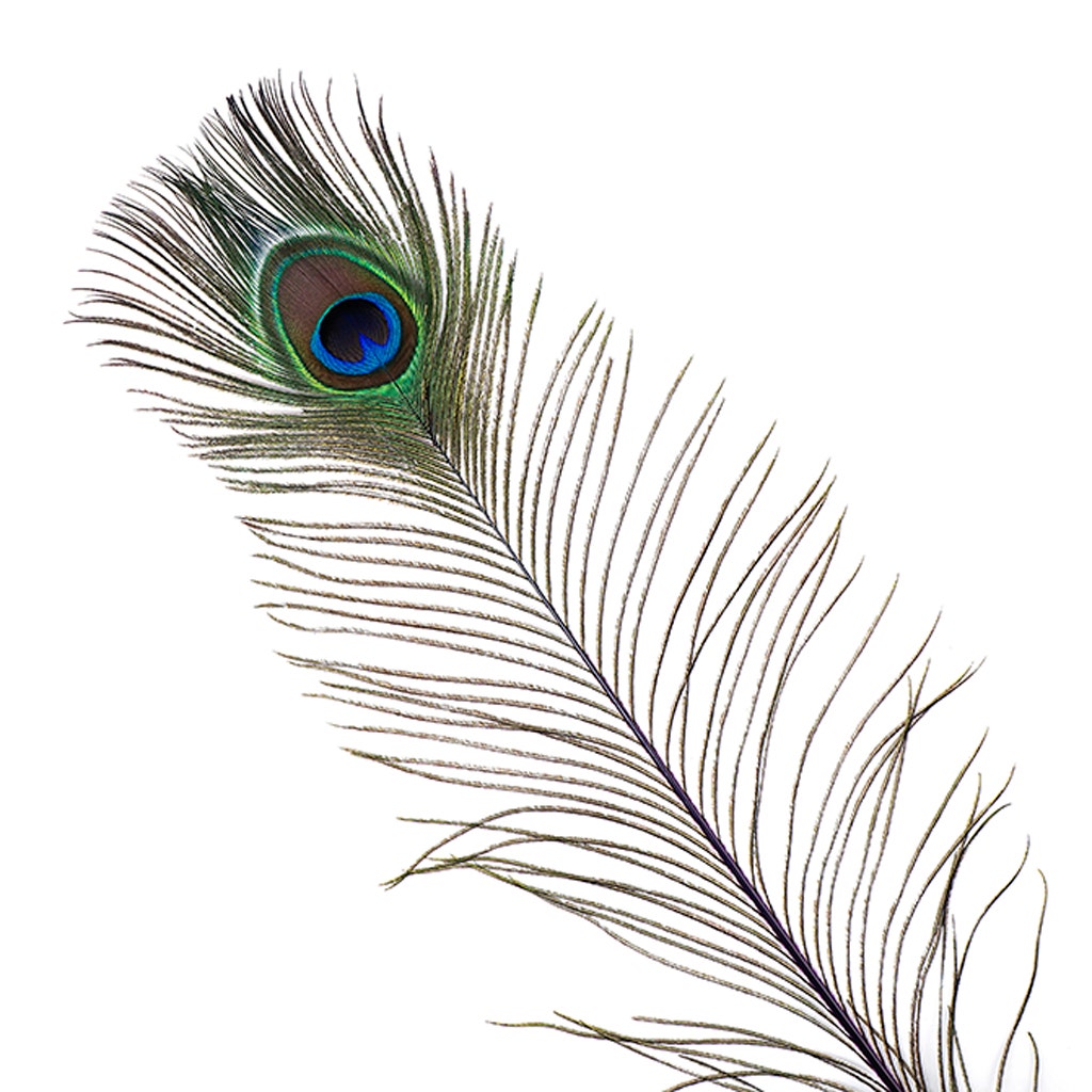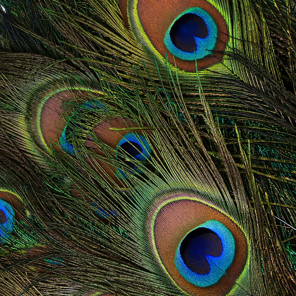 Stem Dyed Peacock Tail Feathers with Full Eyes 30-40 inches long are treated with dyes that stain the entire quill (stem), and amplify the natural iridescent hues of the peacock feathers. Although treated with dye, the original amber, green, purple, and blue colors of the peacock eye remain visible. The width of the full eyes including the surrounding hair-like flue will range 1.5-4.5 inches.