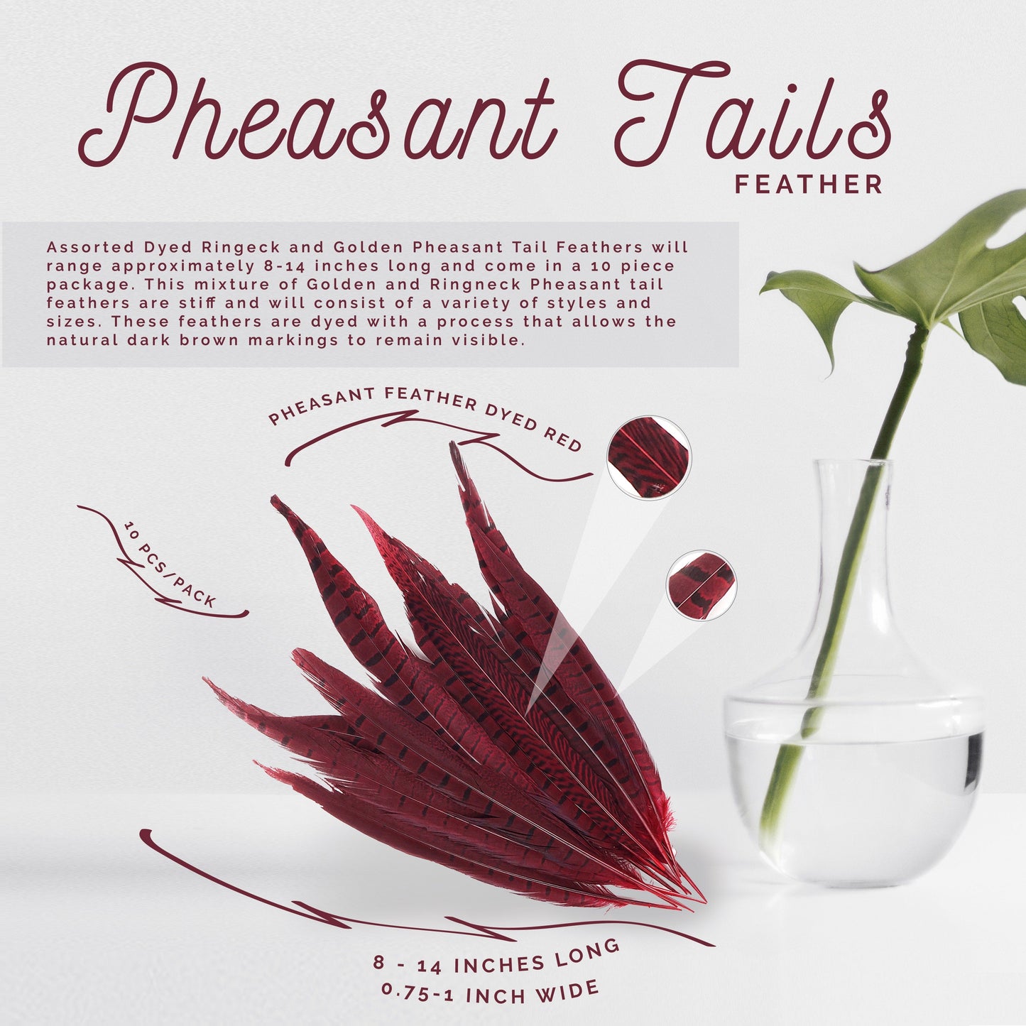 Assorted Dyed Ringeck and Golden Pheasant Tail Feathers will range approximately 8-14 inches long and come in a 10 piece package. This mixture of Golden and Ringneck Pheasant tail feathers are stiff and will consist of a variety of styles and sizes. These feathers are dyed with a process that allows the natural dark brown markings to remain visible.