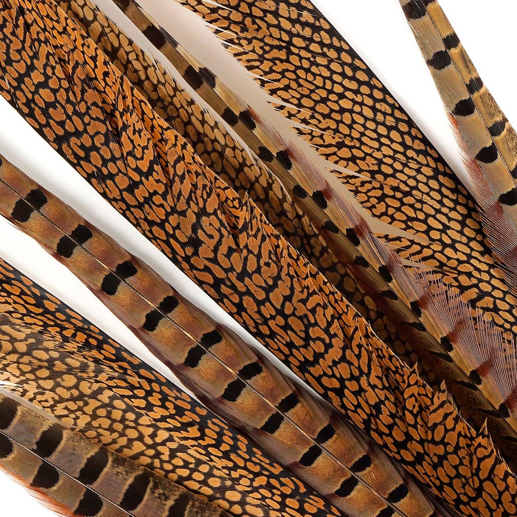 Assorted Natural Ringneck and Golden Pheasant Tail Feathers will range approximately 16-30 inches long and come in a 10 piece package. These pheasant tail feathers are stiff and natural colored. The Golden Pheasant feathers have a main color of lighter brown with a thin, dark brown with a zebra-like stripes throughout the feather. The Ringneck Pheasant has a main color of medium brown with a dark brown stripe going across the body of the feather. There will be a variety of both ringneck and golden pheasant styles and sizes in this 10 piece package.