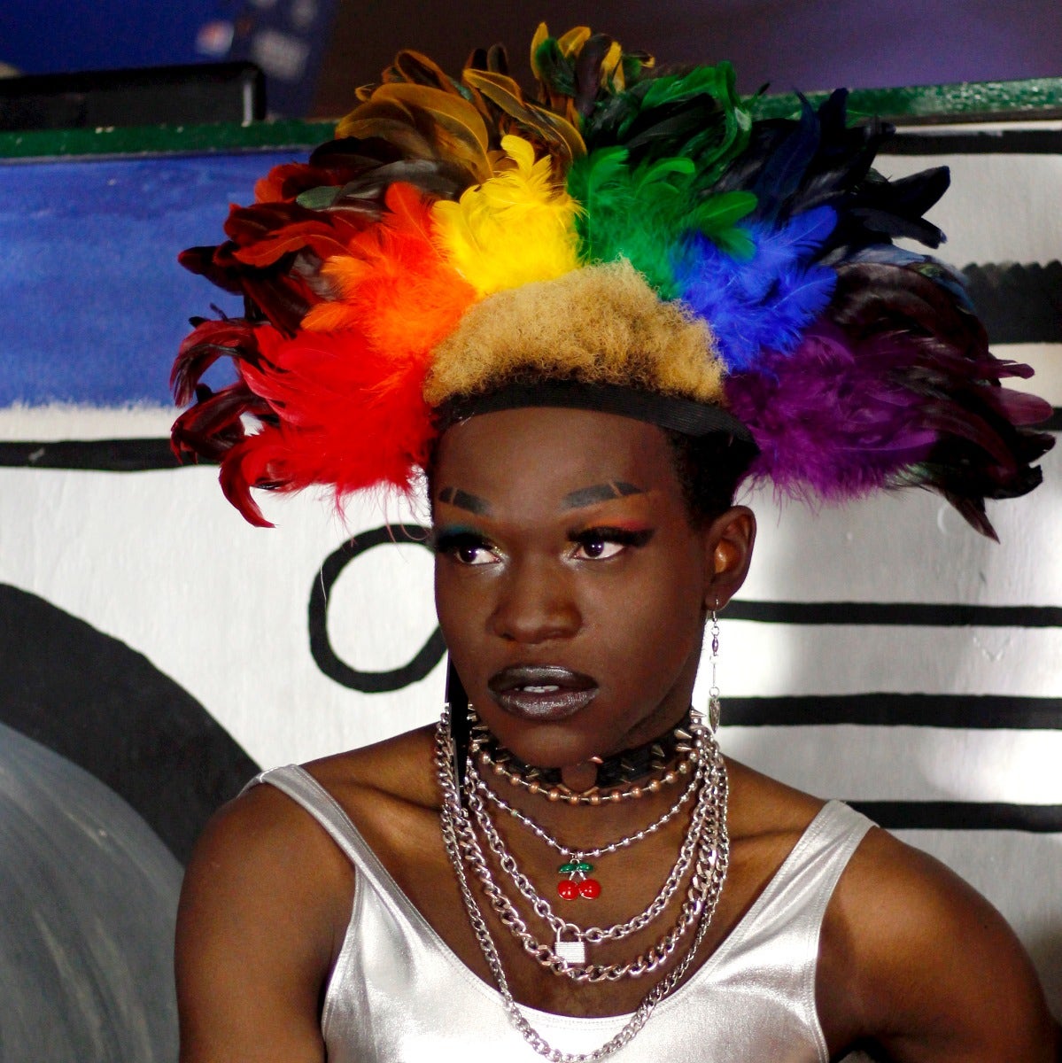 Rainbow Mohawk made of coque tail feathers showcases dark feather tips with brighter colors near the base.