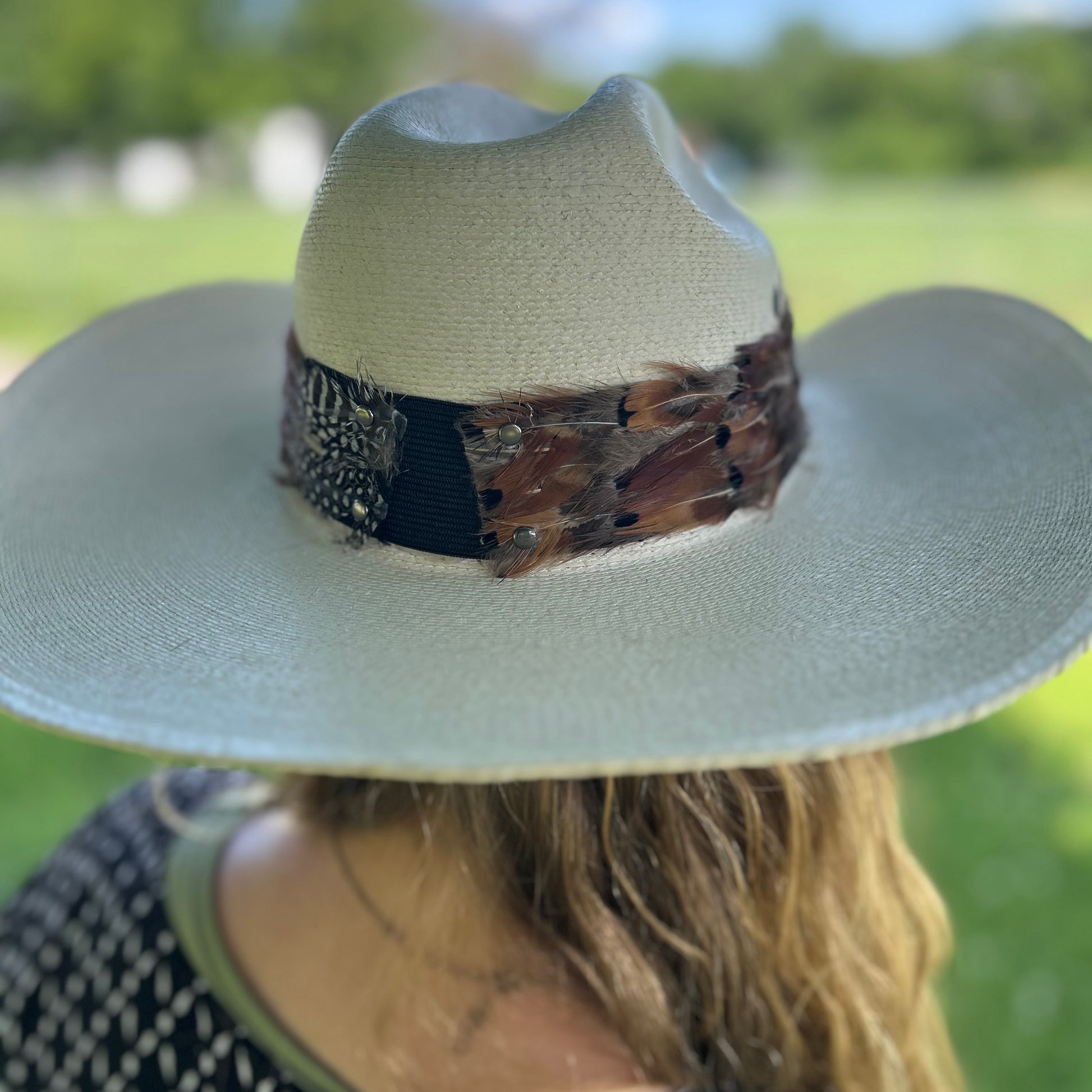 Natural Feather Band and Trim Feather trim handmade with 100% all natural un-dyed pheasant and guinea feathers and plumage (Feather types : Blue Almond Plumage, Dark Heart Plumage, Guinea Plumage, Female Ringneck Plumage) that have been glued on to a polyester-blend band. This feather band is approx 1.50" wide and is available on a 6 yard bolt. Add the a touch of western flair to your hat with this fashionable, on trend feather band and trim.