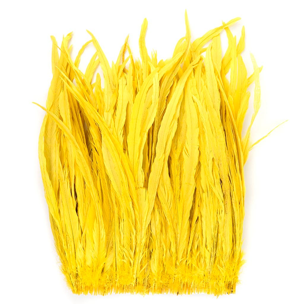 Bleached and Dyed-Rooster Coque Tails approximately 16-18 inches long are strung (sewn) together near the tip of each quill. Rooster Coque tails tend to be long, narrow feathers (about 3/4-1" wide) with a sturdy, but flexible spine. These half-bronze iridescent coque tails are stripped from their natural color through a bleaching process that turns the feathers to a beautiful light beige color. Additional color dyes are then applied to achieve beautiful designer and jewel tone colors. This is a great alternative and money saver to the white-dyed coque tails that produce very saturated, bright, vivid coloration when dyed.