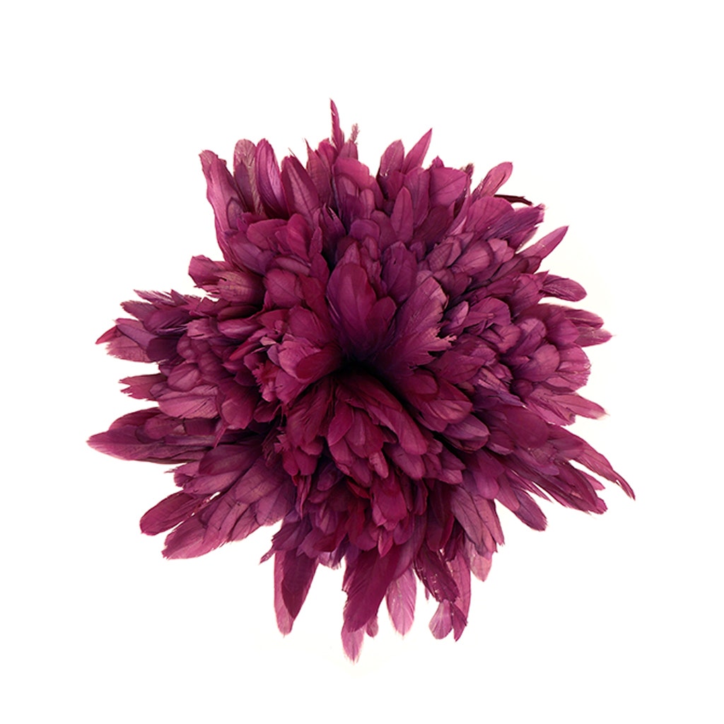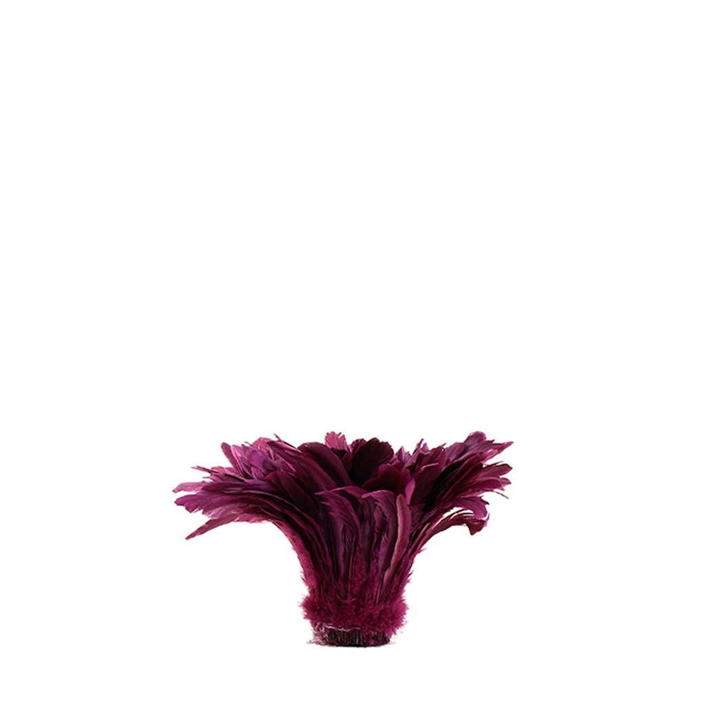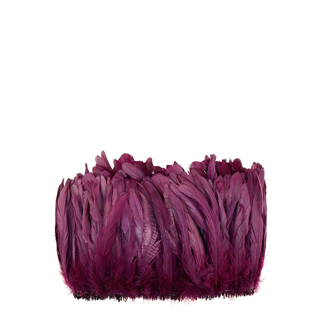Bleached and Dyed-Rooster Coque Tails approximately 7-10 inches long are strung (sewn) together near the tip of each quill. Rooster Coque tails tend to be long, narrow feathers (about 3/4-1" wide) with a sturdy, but flexible spine. These half-bronze iridescent coque tails are stripped from their natural color through a bleaching process that turns the feathers to a beautiful light beige color. Additional color dyes are then applied to achieve beautiful designer and jewel tone colors. This is a great alternative and money saver to the white-dyed coque tails that produce very saturated, bright, vivid coloration when dyed.