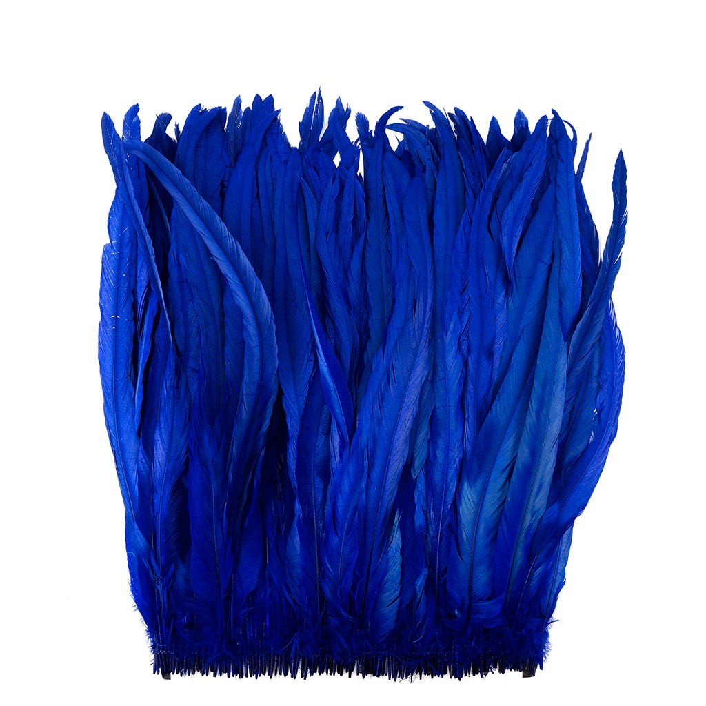 Bleached and Dyed-Rooster Coque Tails approximately 16-18 inches long are strung (sewn) together near the tip of each quill. Rooster Coque tails tend to be long, narrow feathers (about 3/4-1" wide) with a sturdy, but flexible spine. These half-bronze iridescent coque tails are stripped from their natural color through a bleaching process that turns the feathers to a beautiful light beige color. Additional color dyes are then applied to achieve beautiful designer and jewel tone colors. This is a great alternative and money saver to the white-dyed coque tails that produce very saturated, bright, vivid coloration when dyed.