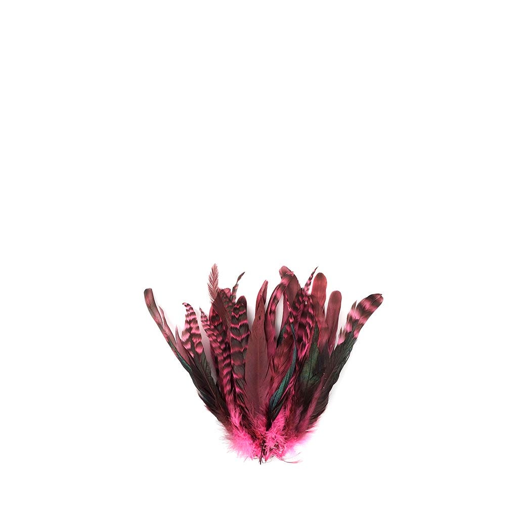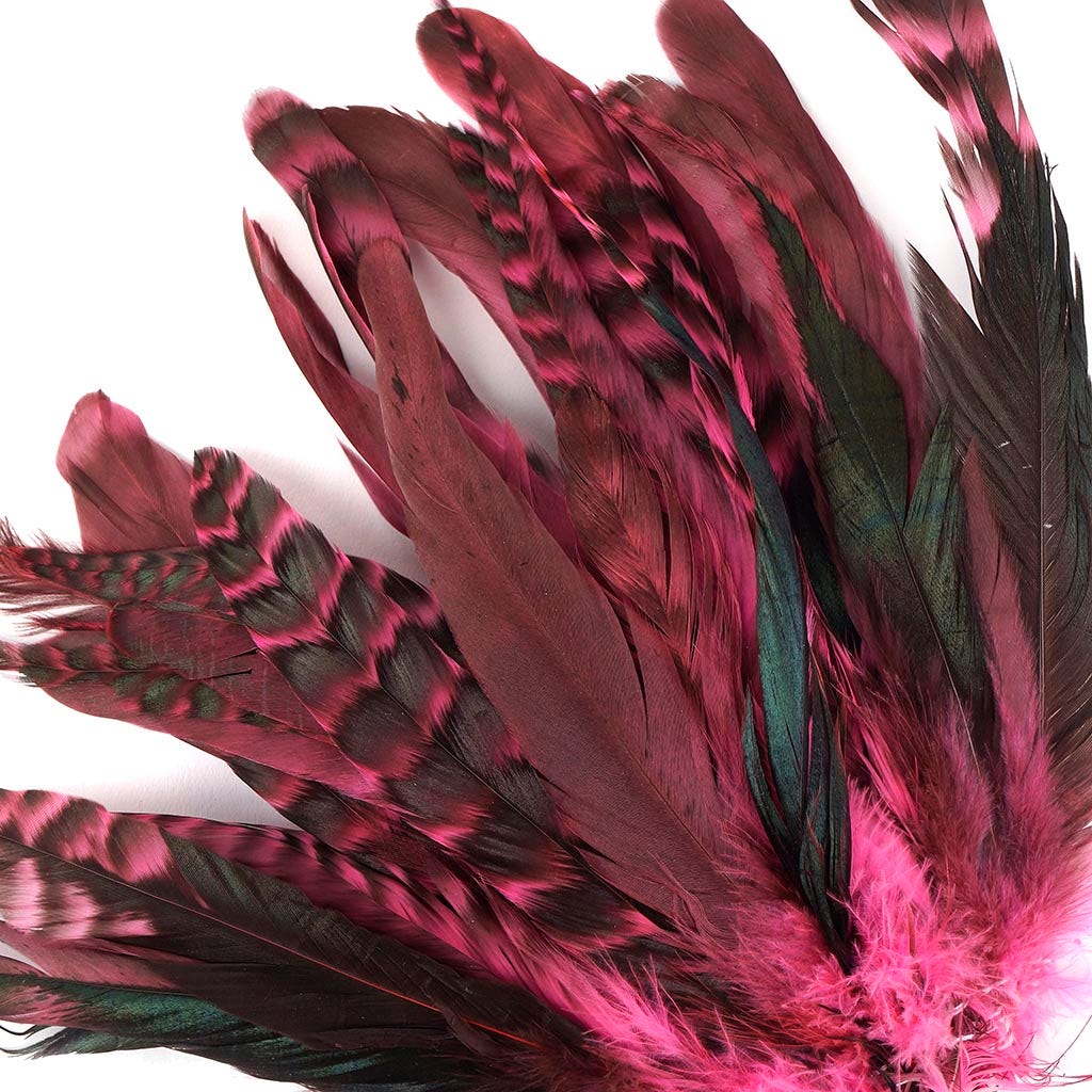 Natural Chinchilla-Rooster Coque Tail Feathers approximately 7-10 inches long in a 25 piece package. These coque tails are dyed, but you will still see the barred natural stripes across the feathers. Rooster Coque tail feathers have a sturdy, but flexible spine (quill), and the body of the feather tends to be approximately 3/4-1 inch wide.
