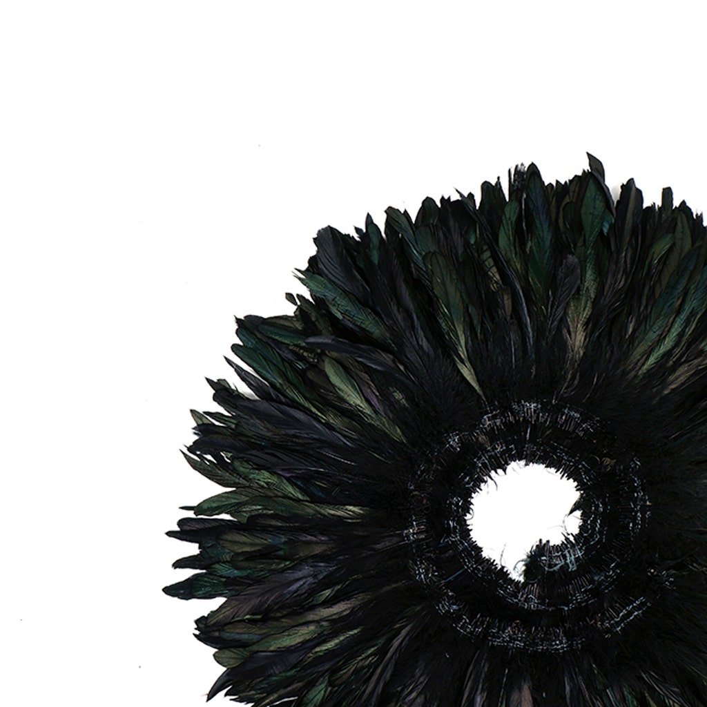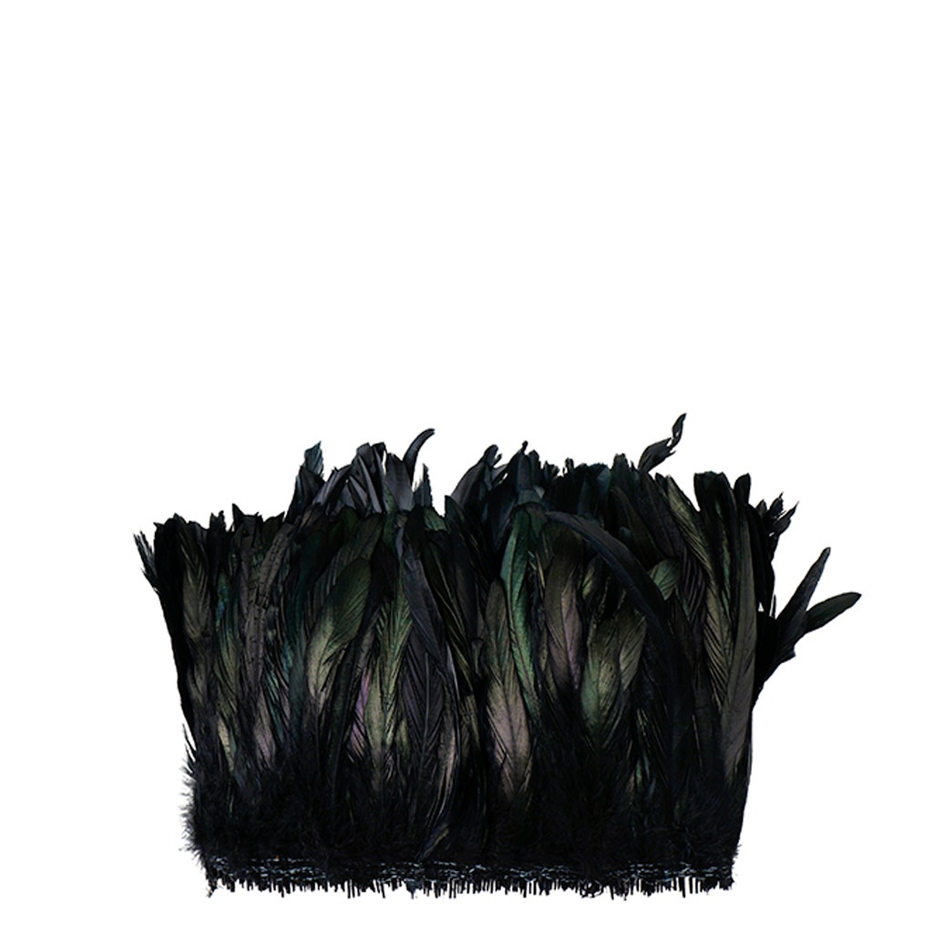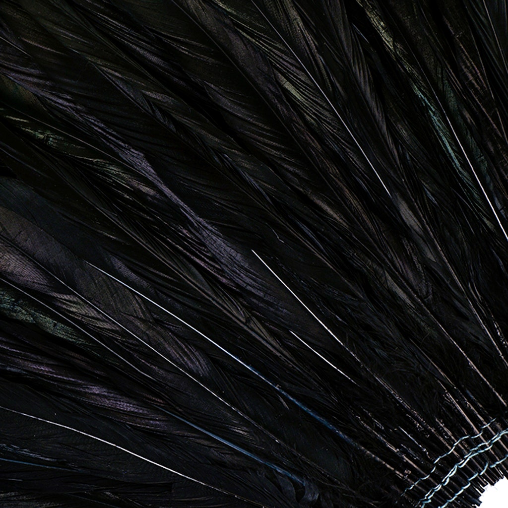 Dyed Half Bronze Iridescent-Rooster Coque Tail Feathers approximately 7-10 inches long are strung (sewn) together near the tip of each quill. These feathers are dyed over natural Half-Bronze coque tails, but will still retain the greenish-black iridescent sheen wherever present. The dye that is used on these feathers is not colorfast, and has the tendency to slightly rub off when handled. Rooster coque tail feathers have a sturdy, but flexible spine (quill), and the body of the feather tends to be approximately 3/4-1 inch wide.